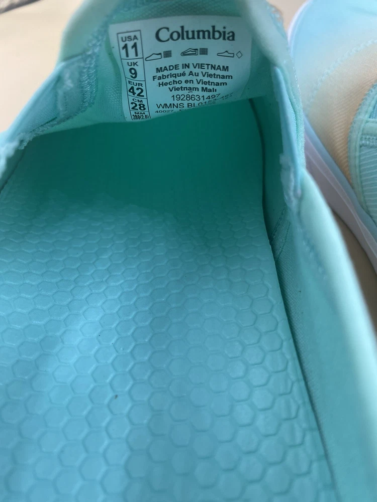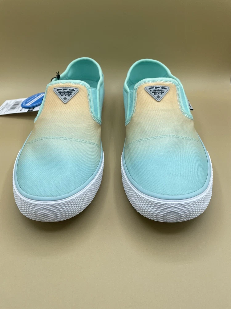 These Columbia Slack Water PFG Slip On Sneakers are women's shoes in size 11 (UK 9, EU 42). They feature a low top style with a multicolor solid pattern and slip-on closure. The shoes are designed for comfort and performance, suitable for casual wear, work, or travel. Made with breathable fabric and a rubber outsole, they are ideal for walking, the beach, and fishing in summer, fall, or spring seasons. The shoes have Columbia branding accents and come without the Original box