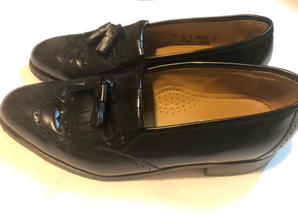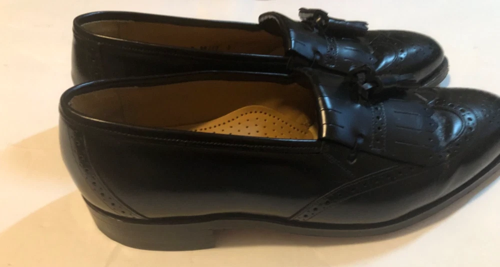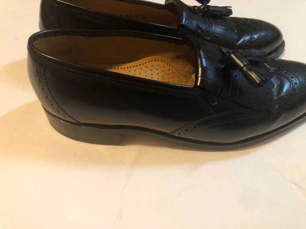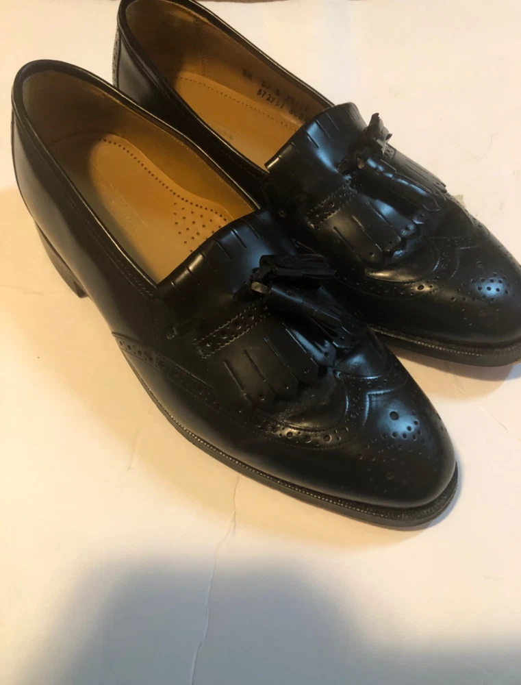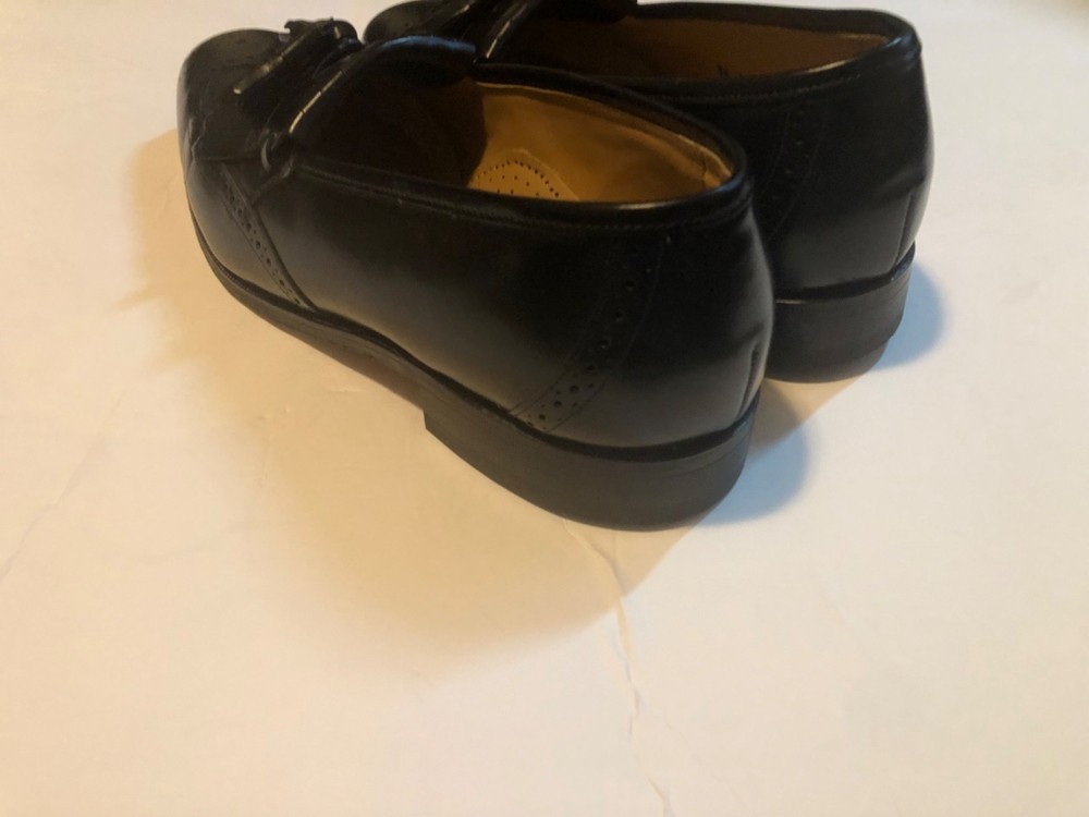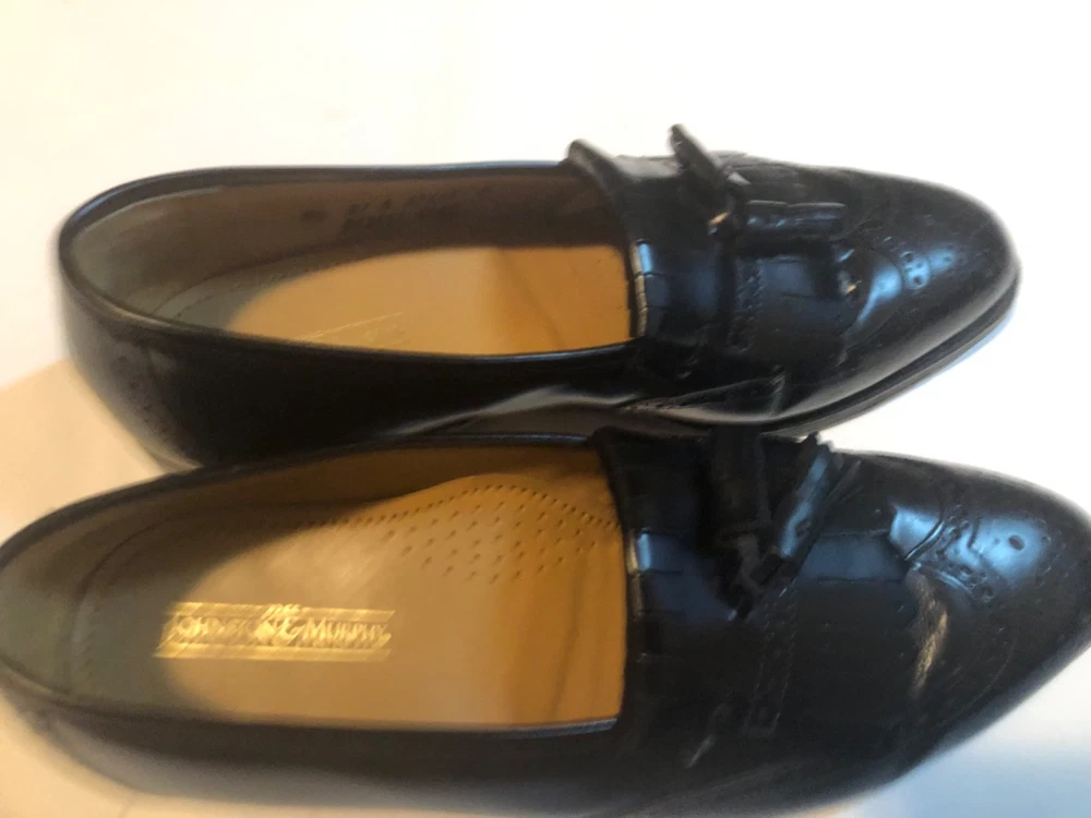 The product is a pair of size 9.5 Johnston & Murphy men's dress shoes in black leather. These slip-on tassel loafers feature a solid pattern with a round toe and tasseled accents, making them a stylish and versatile choice for formal occasions. The shoes are crafted with high-quality leather lining and insole, providing comfort and breathability. The leather outsole ensures durability, while the cushioned design adds extra support for all-day wear. Made in Italy, these loafers are a classic addition to any man's wardrobe, suitable for all seasons.