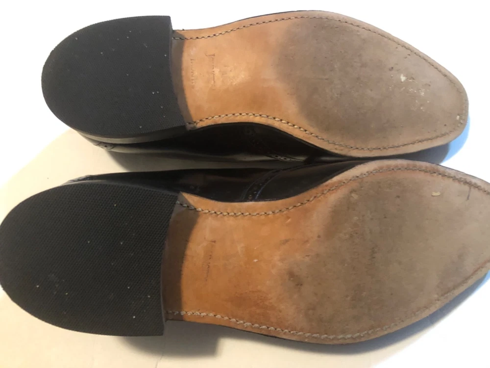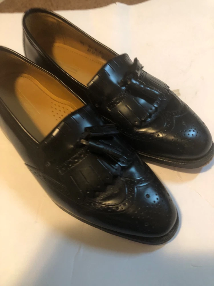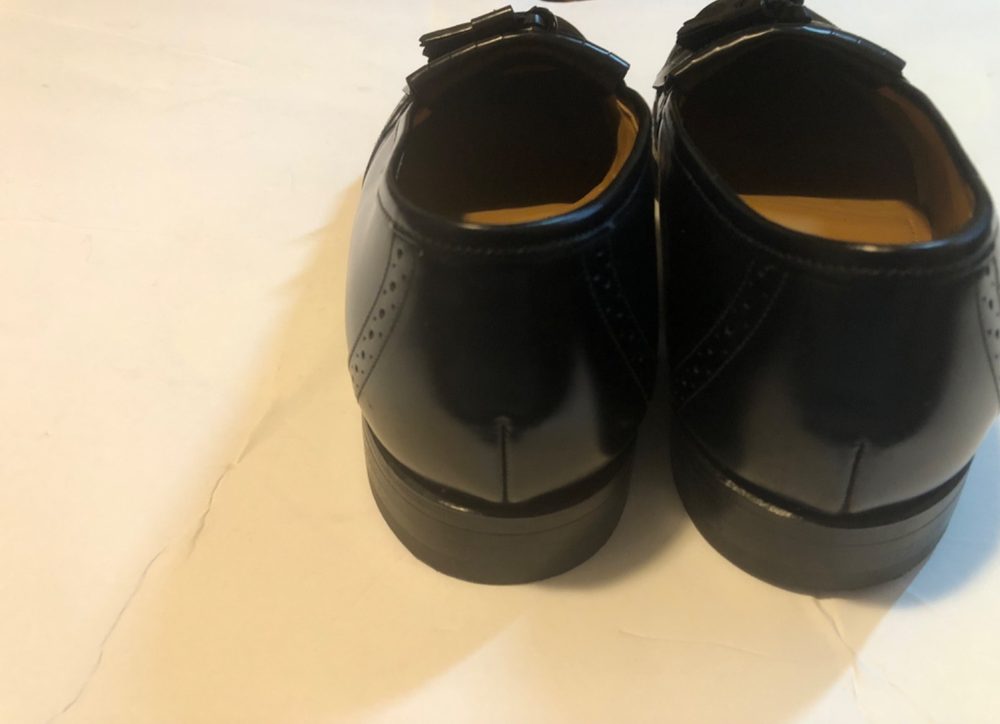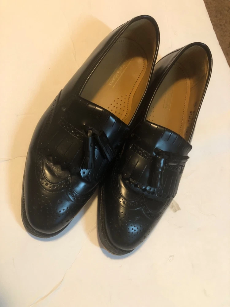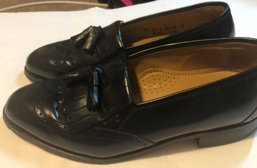 The product is a pair of size 9.5 Johnston & Murphy men's dress shoes in black leather. These slip-on tassel loafers feature a solid pattern with a round toe and tasseled accents, making them a stylish and versatile choice for formal occasions. The shoes are crafted with high-quality leather lining and insole, providing comfort and breathability. The leather outsole ensures durability, while the cushioned design adds extra support for all-day wear. Made in Italy, these loafers are a classic addition to any man's wardrobe, suitable for all seasons.