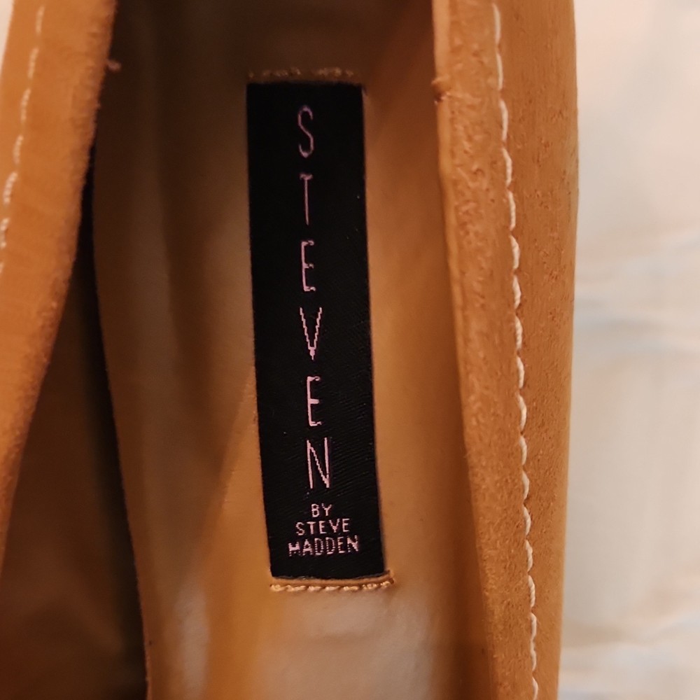 The product is a pair of Steve Madden tan suede slides with a pointed toe and studded bow detail. These stylish shoes feature contrast stitching and are part of the Steven by Steve Madden brand. The outsole is made of leather, and the design is perfect for women looking to add a touch of edgy sophistication to their outfit. The size is US 10, making them a comfortable and fashionable choice for everyday or formal wear.