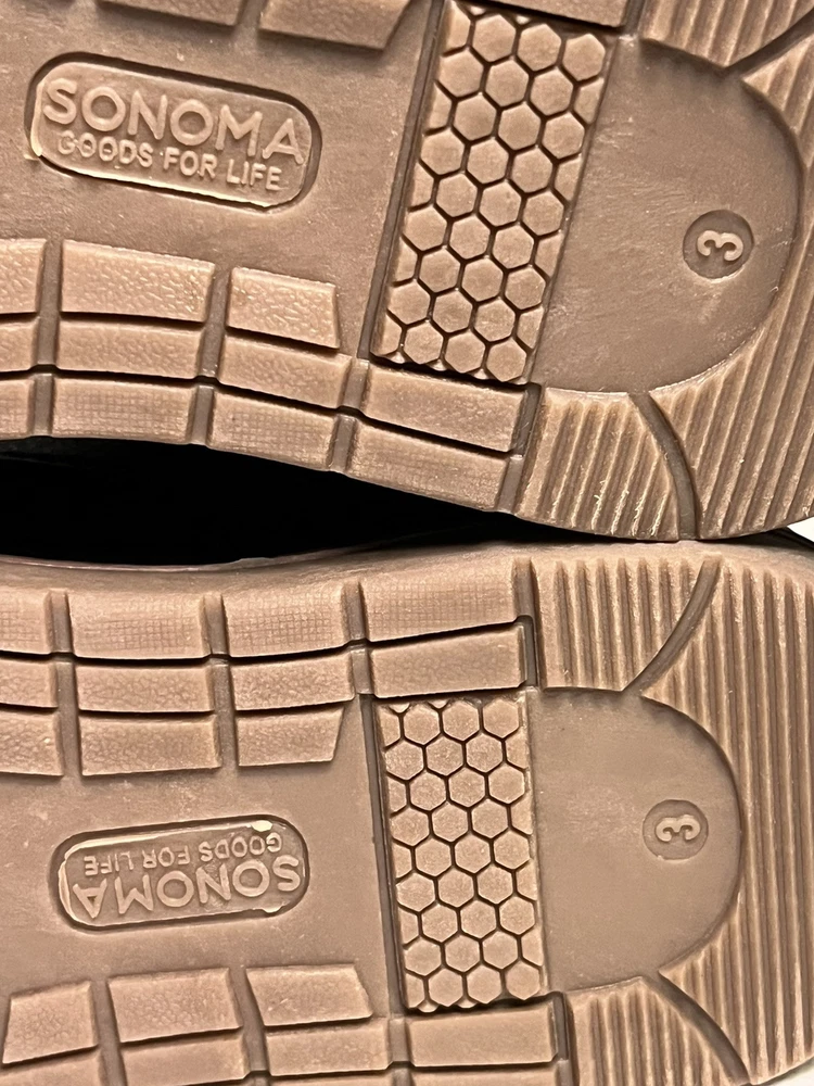 This is a pair of size 3 youth boys' ankle boots by Sonoma, model Sourdough, 99H * NOTE-inside tongue tag says “black” but the outer shell really appears more of a dark chocolate brown color. They feature a lace-up closure, cushioned memory foam insole, and breathable mesh lining. The boots are designed for comfort with moderate cushioning level, suitable for activities like walking, school, and hiking. The upper material is a combination of polyurethane and fleece, and the outsole is made of synthetic material. Perfect for travel, activewear, or casual wear in all seasons. Never worn New without tags, without box