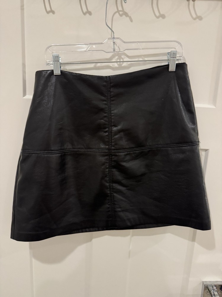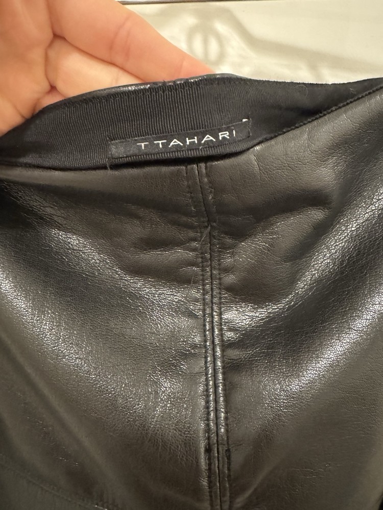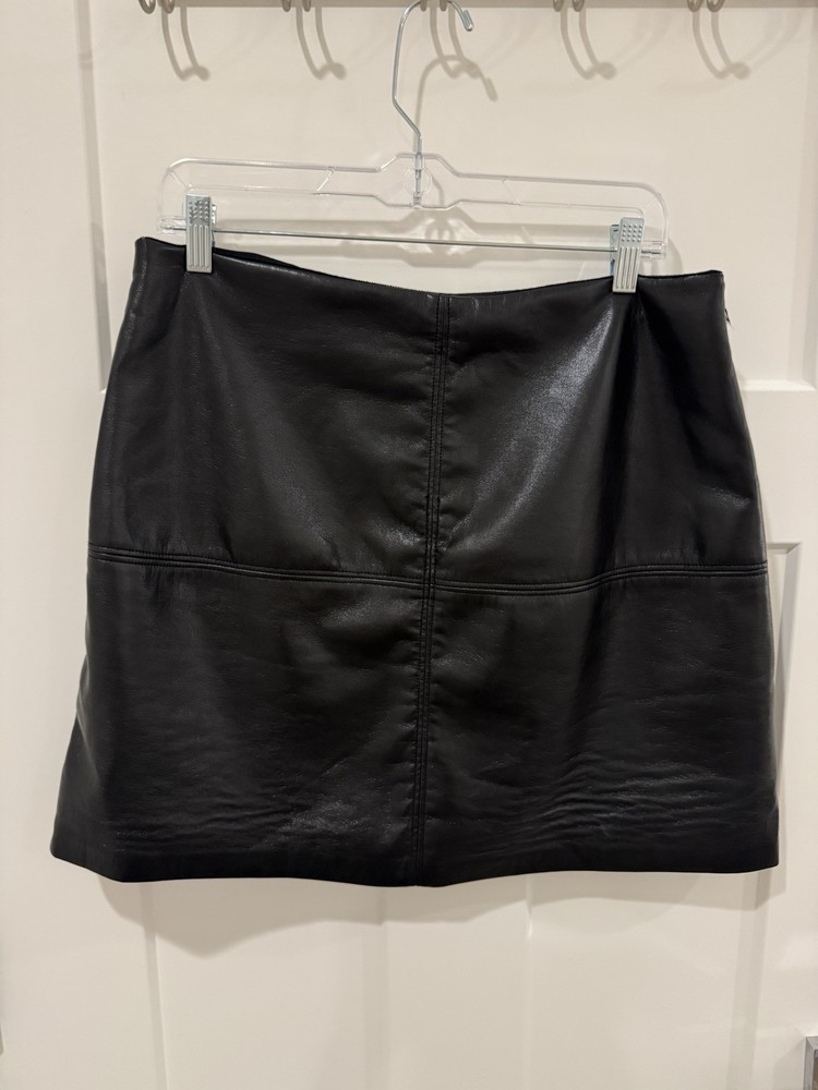 Garment Care: Machine Washable Color: Black Material: Faux Leather Size: L Size Type: Regular Department: Women Closure: Zip Type: Skirt Style: Mini Handmade: No Occasion: Business, Casual Personalize: No Skirt Length: Short Brand: T Tahari Vintage: No