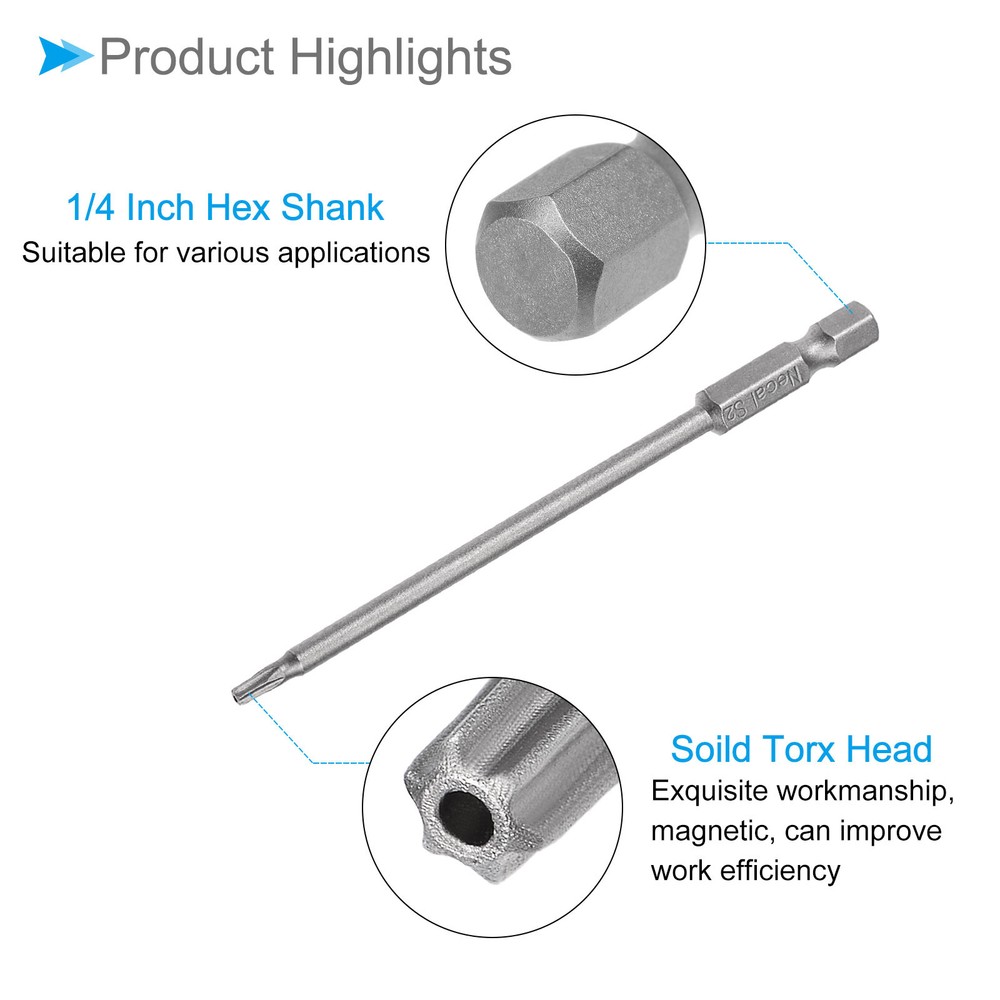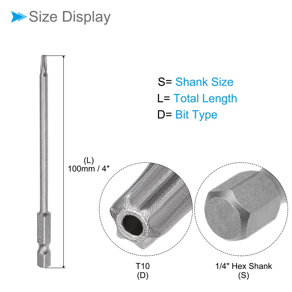 Document Attributes: *Screwdriver Bit Type: T10*Total Length: 100mm / 4 inch*Surface Treatment: Sandblasted*Material: S2What Is Included:* 10 Pieces x Torx Head Screwdriver BitsApplications & Features: -The screwdriver bit is made of S2 steel, which is wear-resistant and impact-resistant, with a hardness of up to 58HRC, and has been sandblasted and surface treated for durability.-These torx screwdriver bits feature a magnetic design that allows them to easily attract and hold screws. This feature ensures convenient installation by securely holding the screw in place before and after fastening, preventing accidental drops or misalignment.Useful Tips:-When using the torx head screwdriver bit, ensure a proper fit with the screw head to prevent stripping or damage. Apply appropriate pressure and torque to avoid over-tightening or under-tightening. Inspect the bit regularly for any signs of wear or deformation and replace if necessary. T10 Torx Head Screwdriver Bit 4" L 1/4 " Hex Shank Magnetic Star Drill 10Pcs Attributes: *Screwdriver Bit Type: T10 *Total Length: 100mm / 4 inch *Surface Treatment: Sandblasted *Material: S2 What Is Included: * 10 Pieces x Torx Head Screwdriver Bits Applications & Features: -The screwdriver bit is made of S2 steel, which is wear-resistant and impact-resistant, with a hardness of up to 58HRC, and has been sandblasted and surface treated for durability. -These torx screwdriver bits feature a magnetic design that allows them to easily attract and hold screws. This feature ensures convenient installation by securely holding the screw in place before and after fastening, preventing accidental drops or misalignment. Useful Tips: -When using the torx head screwdriver bit, ensure a proper fit with the screw head to prevent stripping or damage. Apply appropriate pressure and torque to avoid over-tightening or under-tightening. Inspect the bit regularly for any signs of wear or deformation and replace if necessary. Hot Item Payment 1.We accept eBay payment . 2.Payment must be received within 7 business days of auction closing. Shipping 1.We ship to your eBay or Paypal address. Please make sure your eBay and Paypal address is correct before you pay. 2.Items will be shipped within 1-3 business day when we received payment. 3.Delivery time depends on destination and other factors. Description Policy T10 Torx Head Screwdriver Bit 4" L 1/4 " Hex Shank Magnetic Star Drill 10Pcs Attributes: *Screwdriver Bit Type: T10 *Total Length: 100mm / 4 inch *Surface Treatment: Sandblasted *Material: S2 What Is Included: * 10 Pieces x Torx Head Screwdriver Bits Applications & Features: -The screwdriver bit is made of S2 steel, which is wear-resistant and impact-resistant, with a hardness of up to 58HRC, and has been sandblasted and surface treated for durability. -These torx screwdriver bits feature a magnetic design that allows them to easily attract and hold screws. This feature ensures convenient installation by securely holding the screw in place before and after fastening, preventing accidental drops or misalignment. Useful Tips: -When using the torx head screwdriver bit, ensure a proper fit with the screw head to prevent stripping or damage. Apply appropriate pressure and torque to avoid over-tightening or under-tightening. Inspect the bit regularly for any signs of wear or deformation and replace if necessary. Hot Item Payment 1.We accept eBay payment . 2.Payment must be received within 7 business days of auction closing. Shipping 1.We ship to your eBay or Paypal address. Please make sure your eBay and Paypal address is correct before you pay. 2.Items will be shipped within 1-3 business day when we received payment. 3.Delivery time depends on destination and other factors.