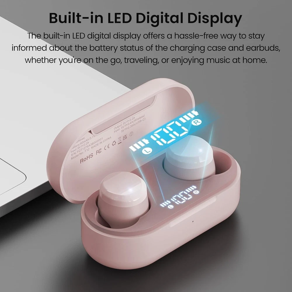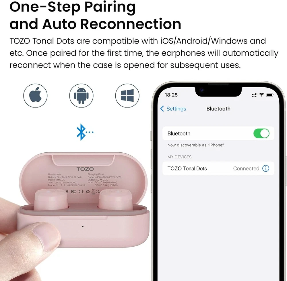 [55 Hours Battery Life & LED Digital Display] Effortlessly monitor battery capacity and charging status with the built-in LED display of TOZO Tonal Dots. Enjoy uninterrupted music for hours with an incredible 40-hour battery life, great for listening to hundreds of songs on a single charge. It supports wireless charging, allowing you to easily charge without cords or plugs. Whether on the go or in daily routine, it will provide unparalleled convenience and smart experiences. [Premium Sound Quality] Crafted by TOZO Acoustic Lab, our earbuds have undergone professional testing and precise calibration. With a powerful 16.2mm dynamic driver system and TOZO OrigX technology, they deliver an impeccable frequency response curve that perfectly displays the aesthetics of sound. TOZO Tonal Dots will bring you an superior audio experience, get ready to be captivated by the rich details and deep bass of the sound! [Personalized TOZO App Experience] To cater to different music styles, TOZO APP provides 32 preset EQs, ensuring you find the ideal settings that suit your preferences. Furthermore, TOZO APP allows you to customize your EQ, enabling a personalized experience that is tailored to your specific musical tastes. Seamlessly switch between different modes and fully immerse yourself in a captivating listening experience. [Comfort Fit & Easy to Carry] Designed for ear comfort, making it an excellent choice for workouts and daily commutes. It features 5 pairs of ear caps in various sizes, ensuring a perfect fit for your ear canal shape. Plus, the compact and lightweight design allows for easy storage in a pocket or bag, making it effortlessly portable wherever you go. Each earbud weighs just 4.6 g, you'll barely feel any pressure even during extended wear. Discover the ideal audio companion with TOZO Tonal Dots! [IPX8 Waterproof & Advanced Bluetooth 5.3] Utilize advanced nano-coating technology to effectively protect against water and sweat. Whether you're exercising outdoors, traveling, hitting the gym, or even swimming, you can confidently use our earbuds without any concerns about damage. Moreover, equipped with advanced Bluetooth 5.3 technology, you can easily enjoy a seamless and super-stable connection, eliminating any lag. Immerse yourself in your favorite music without any interruptions.