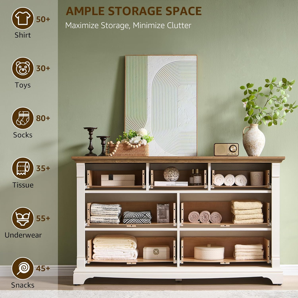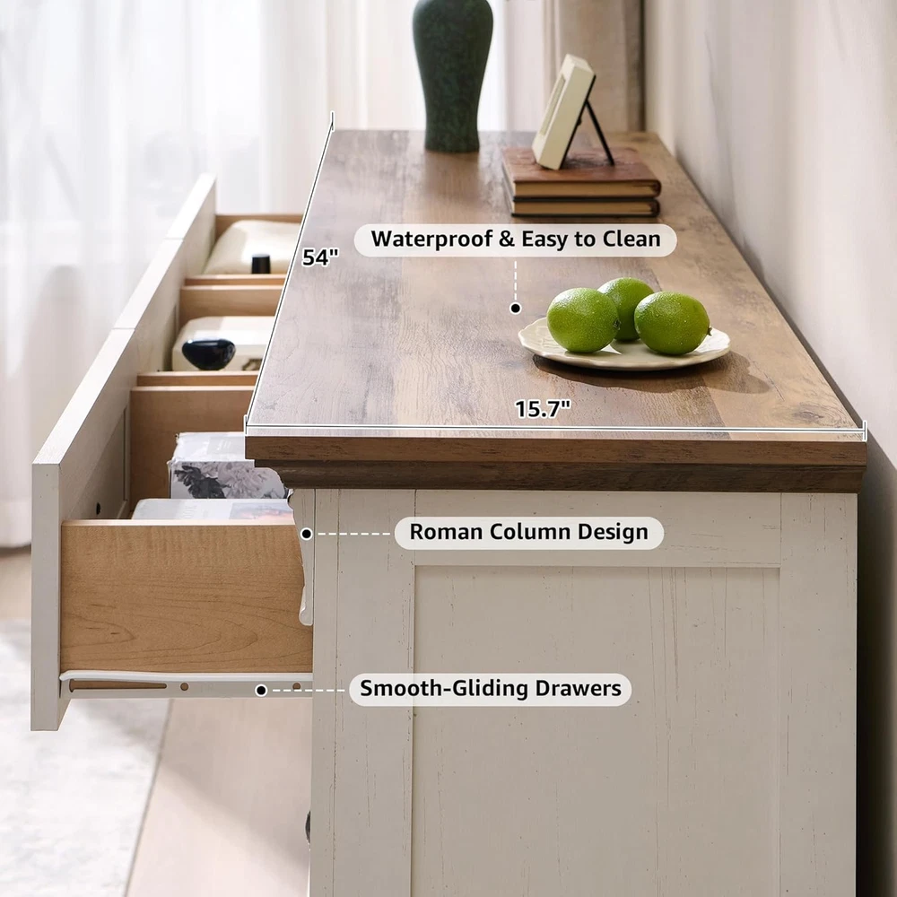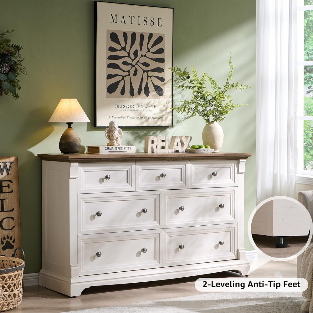 Store New Arrivals Add to Favorite View Feedback Contact T4TREAM Farmhouse 7 Drawers Dresser for Bedroom, 54" Wide Wood Rustic Chest of Drawers W/Roman Column, Wooden Storage Dressers Organizer for Bedroom, Living Room, Closet, Antique White Description Room Type Bedroom, Living Room, Hallway Assembly Required Yes Color Antique White Brand T4TREAM Material Engineered Wood Number of Drawers 7 Size 16"D x 54"W x 32"H (7 Drawers) Finish Type Wood Product Dimensions 16"D x 54"W x 32"H Product Care Instructions Wipe with Dry Cloth Manufacturer T4TREAM Rustic Farmhouse Charm with Authentic Character:This 7 drawer dressers for bedroom brings warmth with its imitation wood grain finish. Each piece features distinctive patterns creating authentic rustic charm. Vintage-inspired details add nostalgic elegance, making this chest of drawers for bedroom a perfect centerpiece for your bedroom dressers with drawers. From embossed textures to Roman columns, every element crafts a welcoming farmhouse atmosphere. Vintage-Inspired Design with Meticulous Craftsmanship:Our wooden dressers for bedroom blend vintage aesthetics with modern functionality. Intricate decorative lines create depth and sophistication. Discover meticulously crafted details that exude elegance. The recessed curved base reduces bulk while Roman columns add timeless appeal to these farmhouse dressers for bedroom, perfect for any decor. Exceptional Storage Capacity with Smart Organization:Measuring 54"W × 15.75"D × 31.89"H, this 7 drawer dressers for bedroom features 3 small drawers for jewelry and 4 large drawers for linens. Combine two for a 14-drawer farmhouse dresser. The spacious tabletop displays photos or essentials, making these drawers for bedroom as practical as beautiful. Premium Construction Built to Last:Constructed with FSC-certified materials, this chest of drawers for bedroom delivers exceptional durability. Sturdy Roman columns and reinforced legs provide stability. Water-resistant finish ensures easy maintenance. Anti-tip device makes these wood dressers for bedroom safe and long-lasting. Hassle-Free Assembly with Comprehensive Protection:Simplified assembly with clear instructions and numbered components. Spare parts kit included for easy setup of your 7 drawer dressers for bedroom. Arrives protected by foam and wooden panels, ensuring perfect condition. Support team always available. Product description T4TREAM Farmhouse Bedroom Furniture Set Add to Cart Add to Cart Add to Cart Add to Cart Add to Cart Add to Cart Add to Cart Customer Reviews 4.7 out of 5 stars 73 4.7 out of 5 stars 73 4.7 out of 5 stars 73 4.4 out of 5 stars 186 4.8 out of 5 stars 62 4.7 out of 5 stars 18 4.4 out of 5 stars 186 Price $289.99 $ 289 . 99 $279.99 $ 279 . 99 $259.99 $ 259 . 99 $450.49 $ 450 . 49 $129.99 $ 129 . 99 $189.99 $ 189 . 99 $485.99 $ 485 . 99 Size 16"D x 54"W x 32"H 16"D x 54"W x 32"H 16"D x 32"W x 47"H 90"L x 81.2"W x 54"H 18"D x 18"W x 24"H 23.6"D x 15.7"W x 26"H 90"L x 65.2"W x 90"H Number of drawers 7 6 5 4 2 3 4 Charging Station ✘ ✘ ✔ ✔ ✔ ✔ ✔ Assembly Needed ✔ ✔ ✔ ✔ ✔ ✔ ✔ Material Engineered Wood, Metal Engineered Wood, Metal Engineered Wood, Metal Engineered Wood, Metal Engineered Wood, Metal Engineered Wood, Metal Engineered Wood, Metal Effortless Operation, Silent Comfort Enjoy a seamless experience with our smooth-gliding drawer system. Even when fully loaded, the drawers open and close quietly and effortlessly, ensuring lasting peace and tranquility in your bedroom. 7 Drawers Storage This famhouse dresser features deep, spacious drawers designed to hold everything from bulky sweaters to delicate linens. Keep your bedroom clutter-free and essentials neatly organized and within easy reach. Metal Handle Sleek & Secure Pull: Combines a modern metallic accent with a solid, comfortable grip for durable elegance and smooth operation. Recessed Line Panel Elegant Textured Detail: Features refined recessed lines that create a sophisticated play of light and shadow, adding visual interest. 1.57-inch Thick Panel Substantial & Stable Build: Crafted from thick, high-quality material to convey a luxurious feel and ensure exceptional durabilit. 2-Leveling Anti-Tip Feet 2-Leveling Anti-Tip Feet: Adjust front leveling screws for stability and anti-tip protection. 1 Antique White 2 Light Rustic Oak 3 Reclaimed Barnwood 4 Dark Rustic Oak ABOUT US We offer the best prices around on high quality products. Our E-store includes media such as books, movies, music and games while offering electronics, toys, sporting apparel, clothing, tools, general home, garden items and more. SHIPPING We are always working hard to ensure your package arrives as soon as possible. Please understand that some factors like weather, high postal traffic, and the performance of shipping companies are outside of our control. RETURNS We offer a 30-Day Return Policy on items which you are not completely satisfied with. You have the option for a full-refund or an exchange of the item. No returns are available on items shipped outside of the USA. PAYMENT We accept PayPal. CONTACT US This page content is yet to come Please ad us to your favorite seller and visit again later Thank You CUSTOMER SATISFACTION We try our very best to make sure every customer is completely satisfied. If there's a problem, message us! We're happy to help. WE ACCEPT Copyright © 2021 AutoDS. | All Rights Reserved