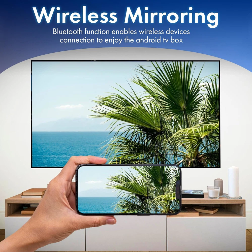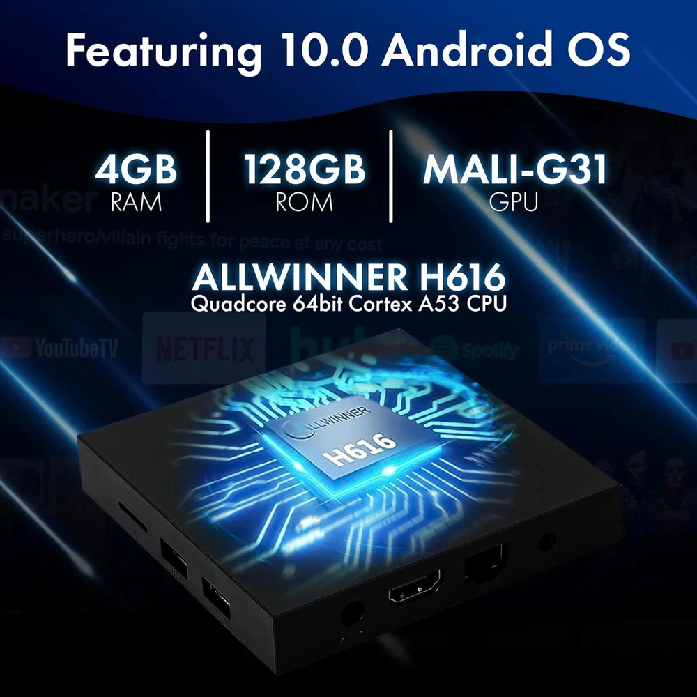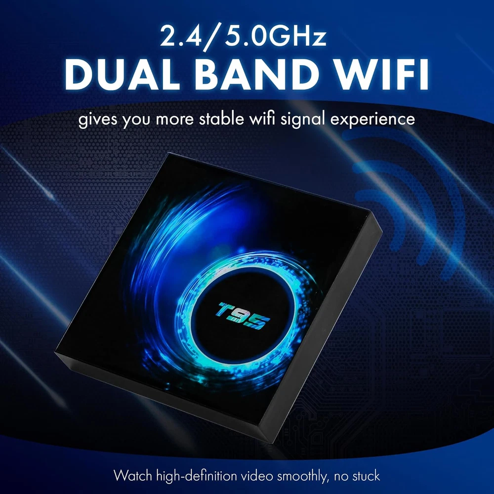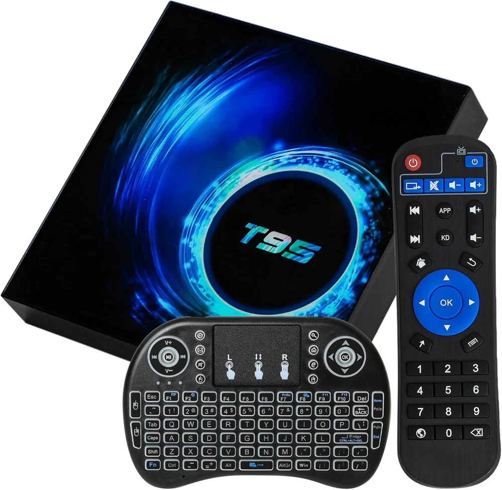 T95 Android TV Box 4GB RAM 128GB ROM- Streaming Media Players with Max Storage- ???Wallecom T-95 Android TV Box 2023 Supports HDR 30 FPS VP9-10???; It has become a True Deal Maker due to giving HDR 30 FPS VP9-10 Profile-2 upto 6K codec support; This is one of the world???s most powerful Android TV streaming media players with enhanced 3D graphics support to HD video in real-time to 6K for clearer or crisper visuals; Has 4GB RAM & 128GB ROM, advance H265 video decoder to give 6K UHD output which makes the android box with better compatibility of software, games, and applications ???Built-in 128GB ROM and 4GB RAM???It comes with 128GB built-in storage and also has 2 USB (2.0) slots to attach extra cards to enjoy the max enhanced capacity ever desired to download more applications & store your favorite Videos; Furthermore, 4GB RAM, Mali-G31 MP2 GPU, 3D graphics acceleration and a powerful H616 Quadcore Cortex-A53 chipset CPU ensures this Android box 2023 to give premium picture quality with highest ever speedy image or video processing, fully satisfied experience for you ???Dual-Band WiFi 2.4G/5.8GHz & BT 5.0???Wallecom Android premiere 4k/hdr streaming media player has built-in highly stable and faster 2.4G/5.8Ghz dual-band WiFi and supports 10/100M ethernet LAN to ensure you enjoy better quality web browsing, playing games, running multiple APPs, and watching movies; The built-in Bluetooth (5.0) enables wireless connections with the mouse, wireless backlit mini keyboard (comes with this combo package), controller for games and other BT enabled devices ???Screen Mirroring & Free Wireless Backlit Mini Keyboard???Enjoy content from Android mobile or iOS devices on the bigger screen to play games, stream UHD videos, or share photos on the bigger screen; Simply plug in the HD port and connect to the internet via Wi-Fi or Ethernet to start enjoying thousands of channels and APPs; This Wallcom tv box comes with a free Wireless mini keyboard that connects to the device via Bluetooth to enable you to type speedily than remote and browse hassle-free