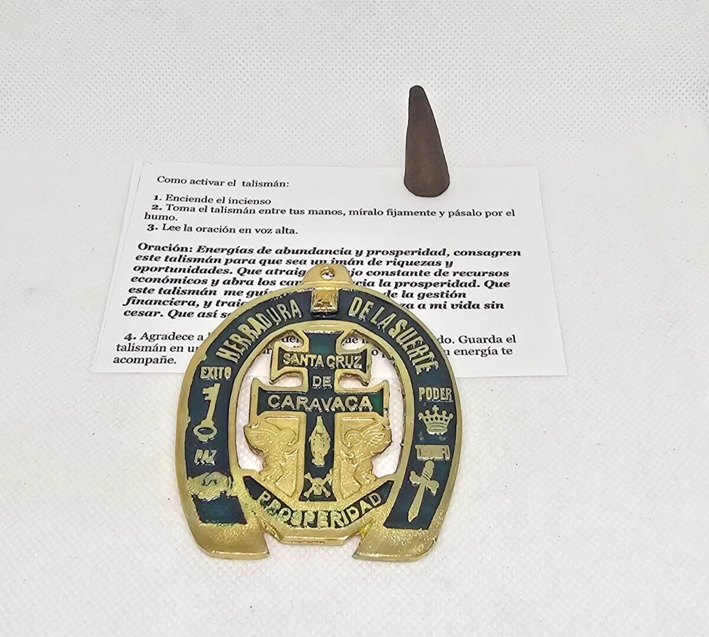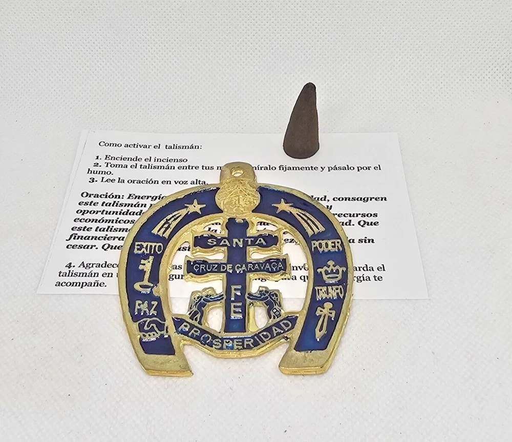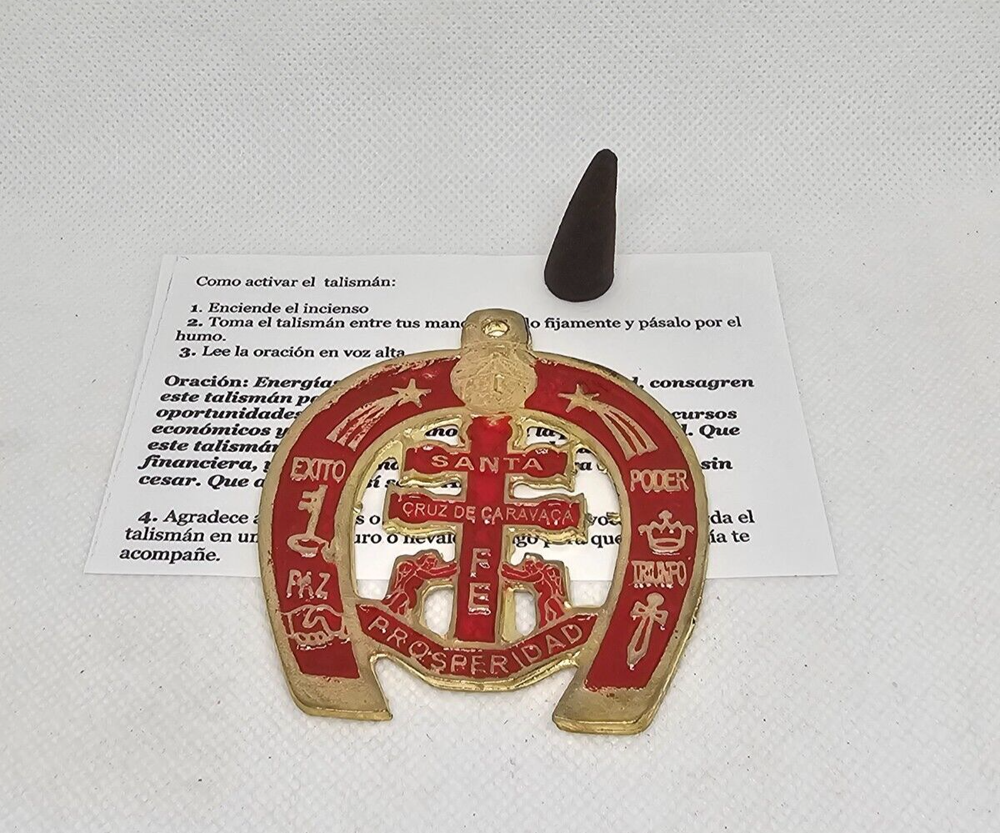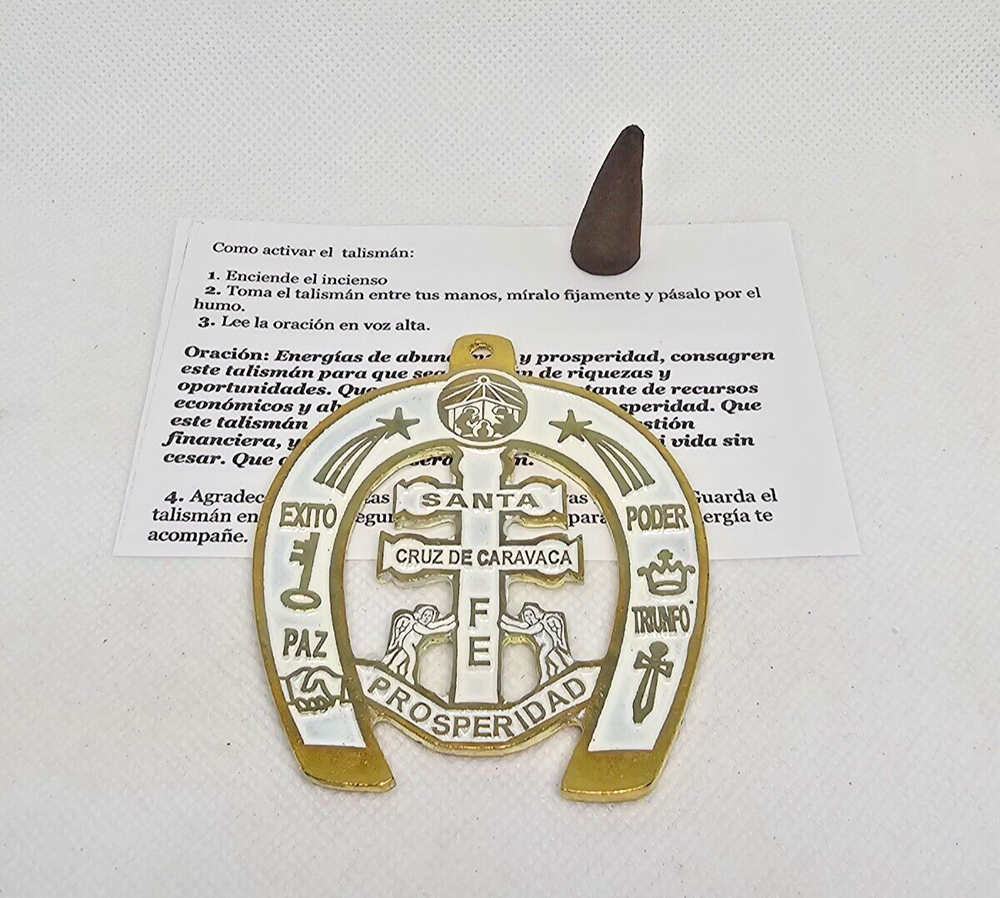 TALISMAN PODEROSA HERRADURA CON CRUZ DE CARAVACA DE LA SUERTE Y PROTECCION PARA LA CASA O EL NEGOCIO I INCLUYE: ORACION INCIENSO E INSTRUCCIONES La Cruz de Caravaca es un poderoso amuleto de protección que puede traer buenos augurios. Protege al portador contra todo tipo de mal y daños, mantiene a la familia a salvo de los desastres económicos. Colóquelo detrás de la puerta de su negocio o de su casa. ¡¡¡Úsalo según las instrucciones y te sorprenderán los resultados!!! POWERFUL HORSESHOE TALISMAN WITH CARAVACA CROSS FOR LUCK AND PROTECTION FOR THE HOME OR BUSINESS I INCLUDES: PRAYER, INCENSE AND INSTRUCTIONS The Caravaca Cross is a powerful protective amulet that can bring good omens. It protects the wearer against all kinds of evil and damage, keeping the family safe from economic disasters. Place it behind the door of your business or home. Use it as instructed and you will be amazed by the results!!!