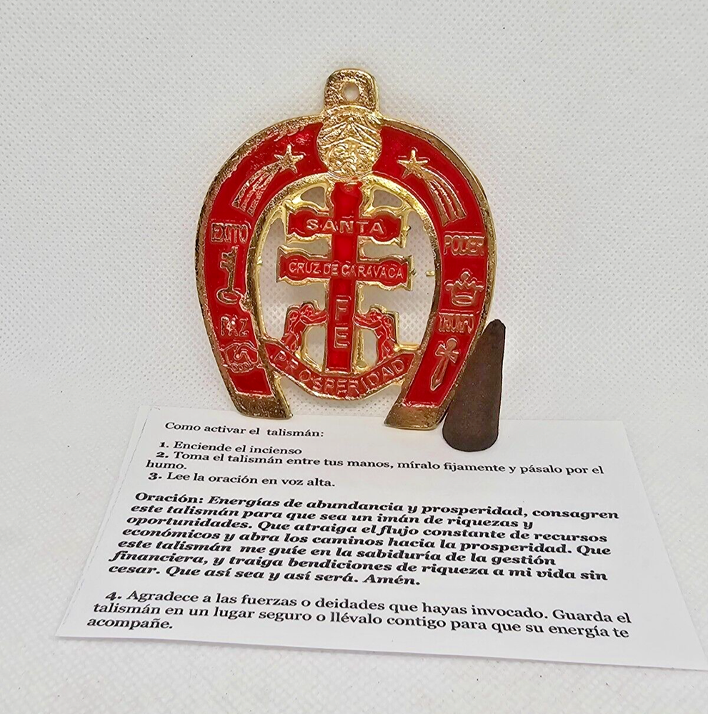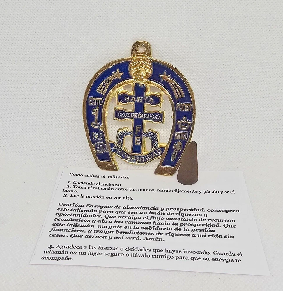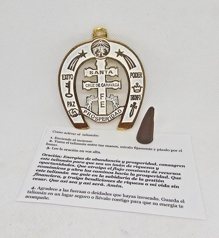 TALISMAN PODEROSA HERRADURA CON CRUZ DE CARAVACA DE LA SUERTE Y PROTECCION PARA LA CASA O EL NEGOCIO I INCLUYE: ORACION INCIENSO E INSTRUCCIONES La Cruz de Caravaca es un poderoso amuleto de protección que puede traer buenos augurios. Protege al portador contra todo tipo de mal y daños, mantiene a la familia a salvo de los desastres económicos. Colóquelo detrás de la puerta de su negocio o de su casa. ¡¡¡Úsalo según las instrucciones y te sorprenderán los resultados!!! POWERFUL HORSESHOE TALISMAN WITH CARAVACA CROSS FOR LUCK AND PROTECTION FOR THE HOME OR BUSINESS I INCLUDES: PRAYER, INCENSE AND INSTRUCTIONS The Caravaca Cross is a powerful protective amulet that can bring good omens. It protects the wearer against all kinds of evil and damage, keeping the family safe from economic disasters. Place it behind the door of your business or home. Use it as instructed and you will be amazed by the results!!!