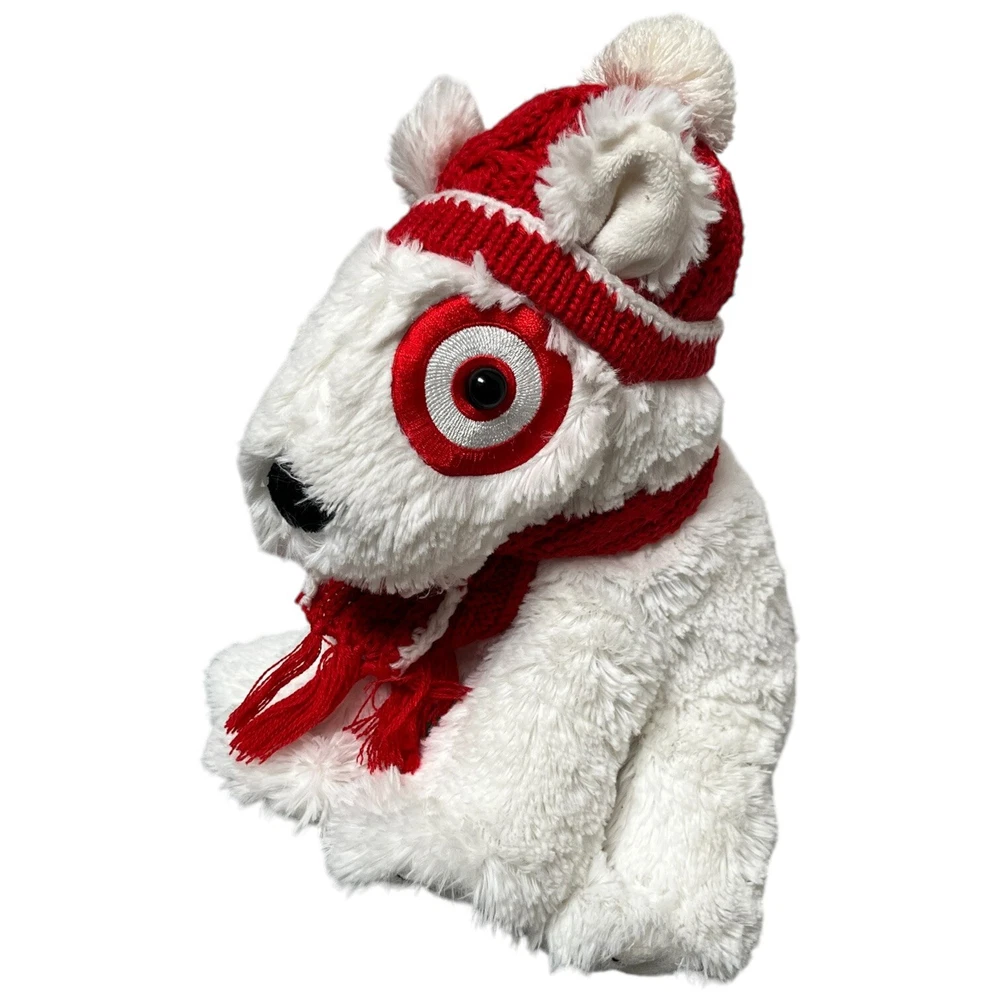 TARGET Bullseye Mascot Plush Dog Stuffed Animal Christmas Red Knitted Scarf Measures about 12" Pre-owned, good condition Item location: Back warehouse, Black Bins, Right Center, Small Plush & Toys