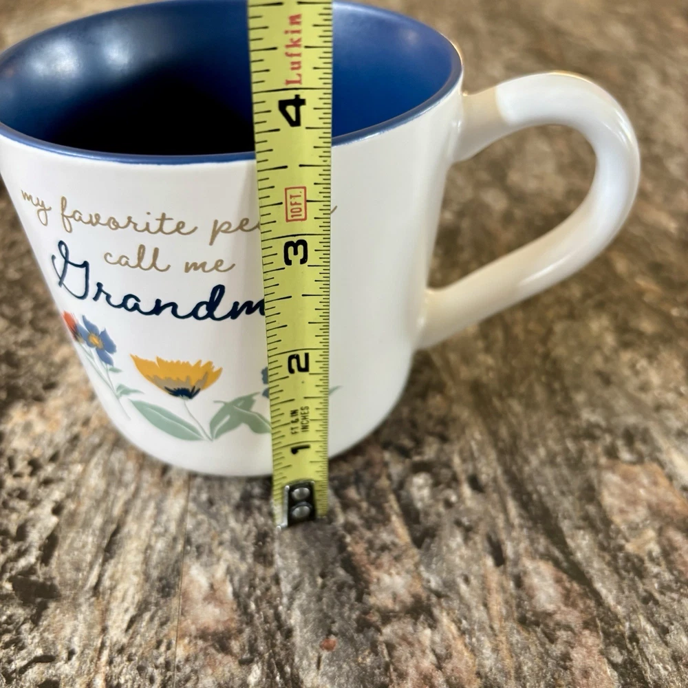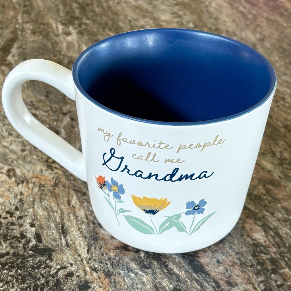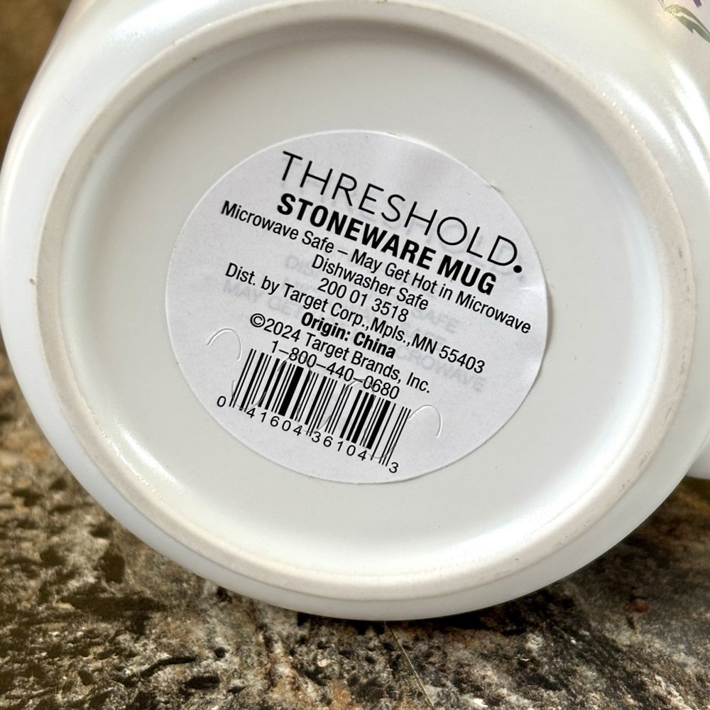 This is a TARGET Threshold stoneware mug that features a floral pattern and a modern style. The mug is round and measures 5.5 inches wide by 3.5 inches tall. It is designed for all occasions and can hold one serving of coffee or tea. The mug is made in China and is both microwave and dishwasher safe. This mug makes an excellent gift and is perfect for that special Grandma in your life !