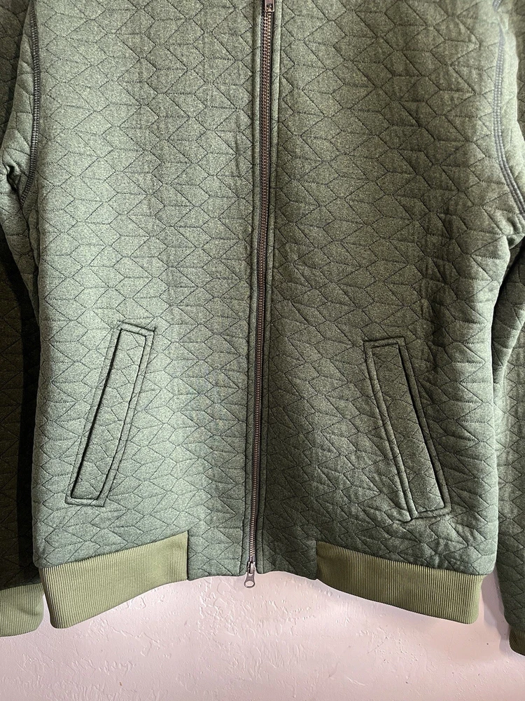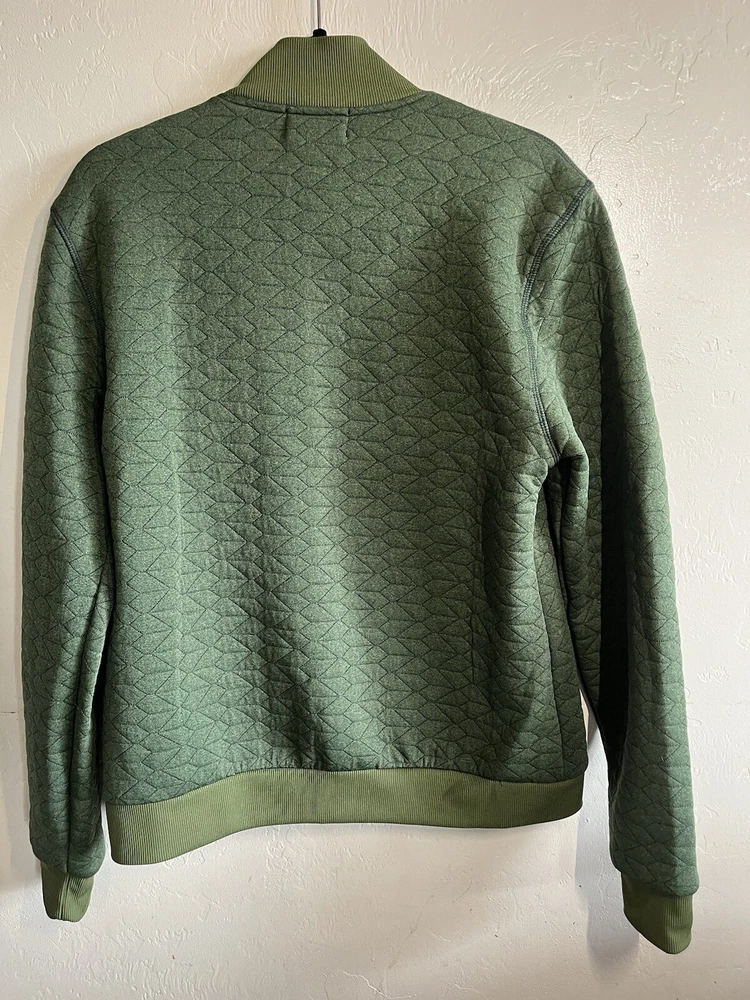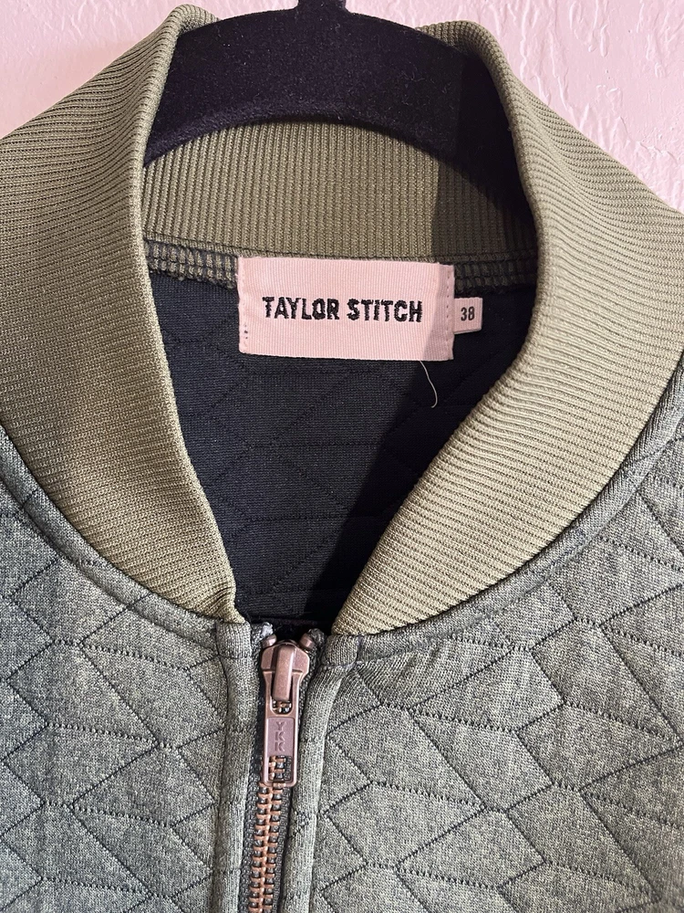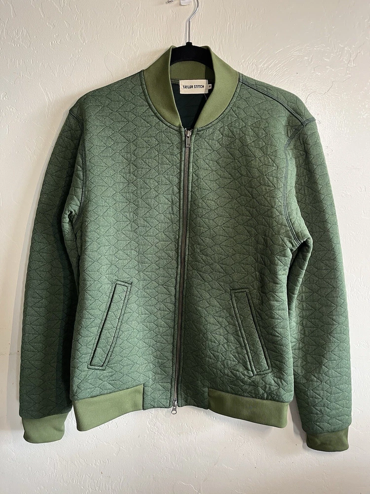 Fabric Type: Knit Closure: Zip Pattern: Solid Style: Bomber Jacket Size: 38 Insulation Material: Polyester Type: Jacket Theme: Nature, Outdoor, Preppy, Motorcycle, Hipster, City Accents: Quilted Season: Fall, Spring, Winter Vintage: No Occasion: Casual, Travel, Workwear Features: Full Zip Jacket/Coat Length: Short Department: Men Performance/Activity: Walking, Golf Size Type: Regular Color: Green Garment Care: Machine Washable Fit: Regular Outer Shell Material: Polyester Country/Region of Manufacture: Vietnam Brand: Taylor Stitch