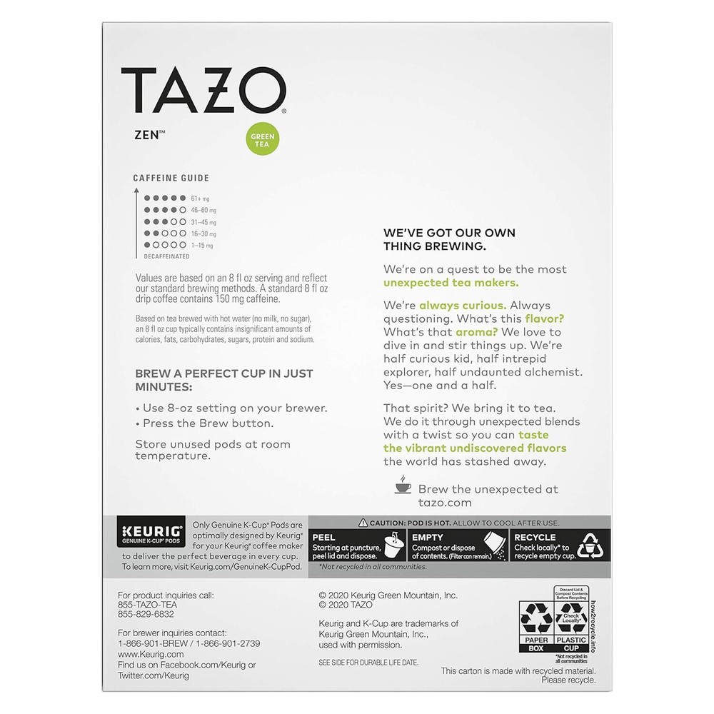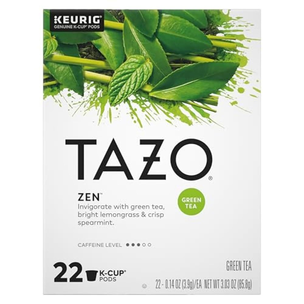 TAZO Tea K-Cups, Green Zen for Health and Wellness, 22 Pods Product Details Package Dimensions : 9.13 x 9.02 x 3.94 inches; 3.03 ounces Item model number : 68374886 Manufacturer : Lipton Tea & Infusions Company Brand: TAZO Item Form: Pod Flavor: Green Tea Tea Variety: Green Unit Count: 22 Count TAZO ZEN GREEN TEA: This tea offers a blend of green tea, lemon verbena, crisp spearmint leaves, bright lemongrass, and natural flavors as a tasty, relaxing, and calm refresher WHAT YOU'LL GET: TAZO Zen Green Tea, non-GMO and kosher certified, 22 K-Cup pods per pack, 1 pack total WAKE UP WITH TAZO: Zen Green Tea K-Cup pods offer a caffeinated, unsweetened green tea that is best enjoyed hot in the morning or afternoon for a refreshing infusion of green tea EASY TO MAKE: Brew a Zen Green Tea K-Cup pod using the setting for eight fluid ounces, stir well, and enjoy the refreshing blend of green tea and natural flavors TRUSTED COMPANY: TAZO Teas are produced without genetic engineering, meeting the Non-GMO Project Standard. Ingredients are expertly sourced giving a taste for you to savor Tazo Zen K-cup Green Tea is a refreshing infusion of green tea with lemon verbena, lemongrass, spearmint, and mint teas to help you experience a true moment of Zen during the day. Sip this green tea blend as your morning tea to start your day or as an afternoon refresher. This relaxing and calming tea blend is carefully presented in 16 individual green tea K-Cups to preserve the freshness you love! This unsweetened, caffeinated tea is also quick and easy to make; you only need hot water to release all the flavored green tea goodness inside. At Tazo, we’re serious tea lovers, and we believe in the joy of tea. We believe each cup of tea should add a little joy to your day, whether you’re drinking it as your morning tea or as an afternoon refreshment. That’s why we seek out the most delicious tea leaves, spices, and botanicals to craft exhilarating and unexpected blends that delight the senses. Our tea buyers travel to origin countries regularly to taste and select the world’s finest-quality teas and botanicals, and we carefully create our blends to craft complex flavors that complement each unique tea. Our tea experts are meticulous about blending because it lets us innovate taste profiles that are unlike those at any other tea brand. We’re always curious, always seeking, always questioning, and it’s the unpredictable, the unforeseen that drives us. They drive us away from our safe comfort zone in a commandeered golf cart or on the first flight we could find to who knows where or to the last stop of the subway, whichever gets us to points unexplored. That spirit? We bring it to tea. We do it through vibrant, unexpected blends with a twist that unlock the undiscovered flavors the world has stashed away.
