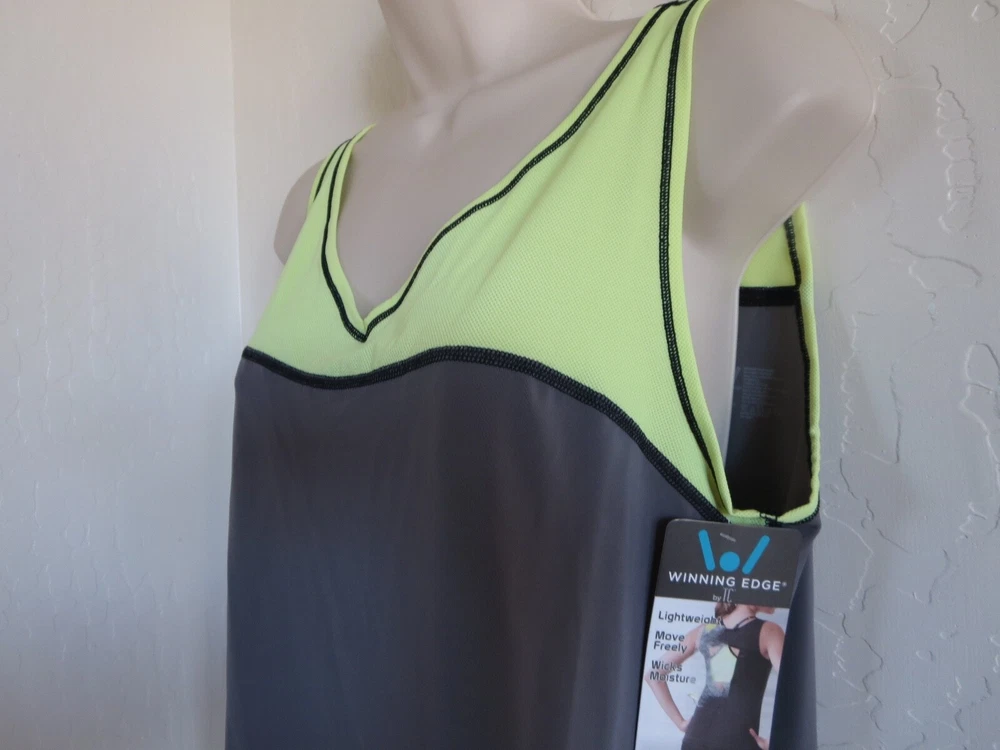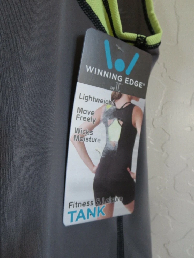 TANK TOP CONDITION: NEW WITH TAG STYLE #: 4341 SIZE : MEDIUM COLOR: SUNLIMCAST / GRAY/YELLOW .... AS SHOWN DESCRIPTION: ACTUAL ITEM AS SHOWN ON THE PICTURE EXCEPT BLACK ON MODEL TC WINNING EDGE FITNESS & LEISURE TANK TOP MSRP $38 If you’re looking for a top you can wear across your wide variety of weekly activities, why not give yourself a Winning Edge®? This tank, made with soft & stretchy fibers, allows comfy, freedom of movement as you work out, run errands, or just unwind. Its specially-designed, moisture-wicking material draws perspiration from the skin and aids in cooling. Its mesh fabric sections, at the bust, straps, and shoulder blades, combined with its open back, provide added breathability and comfort. Choose this fitness & leisure tank as a versatile top to wear in the yoga studio, on the trail, around town, in the gym, or just at home. Body: 82% Nylon, 18% Elastane (Spandex) / Mesh: 80% Nylon, 20% Elastane (Spandex) Machine wash warm. Do not use fabric softener. Tumble dry low. Do not iron. Do not dry clean. Imported If there is any problem with the item after you have received it, PLEASE contact me before leaving feedback . Mistakes do occasionally happen, but I strive to deliver 5 star service!