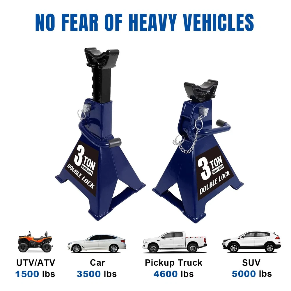 About this item Constructed of high-grade forged steel with a welded frame design for durability; Handles a wide range of vehicles including small cars (Suitable for most 3 Ton autos, not recommendable for big Pick-Up truck, Truck, too big off-road SUVs etc) Heavy duty 3 Ton Jack Stands safely support up to 6,000 pounds; Adjustable lifting height range from 11-5/16" to 16-7/8" Multi-position ratchet bar features a sawtooth design, allowing for quick height adjustment when locking into place Wide pyramid foot base measures 7.95" x 7.2"; Large foot base provides added strength and stable support Double locking jack stands are constructed with high-quality, solid steel body panels and welded-in reinforcement braces for added strength and durability Product Description The TCE Heavy Duty 3 Ton Jack Stands safely supports up to 6,000 pounds, providing stable and reliable protection. Constructed with high-quality, solid steel body panels and welded-in reinforcement braces for added strength and durability. These jack stands are equipped with an easy-to-use ratchet system for quick height adjustment and double lock movable pins to provide additional safety.47.12