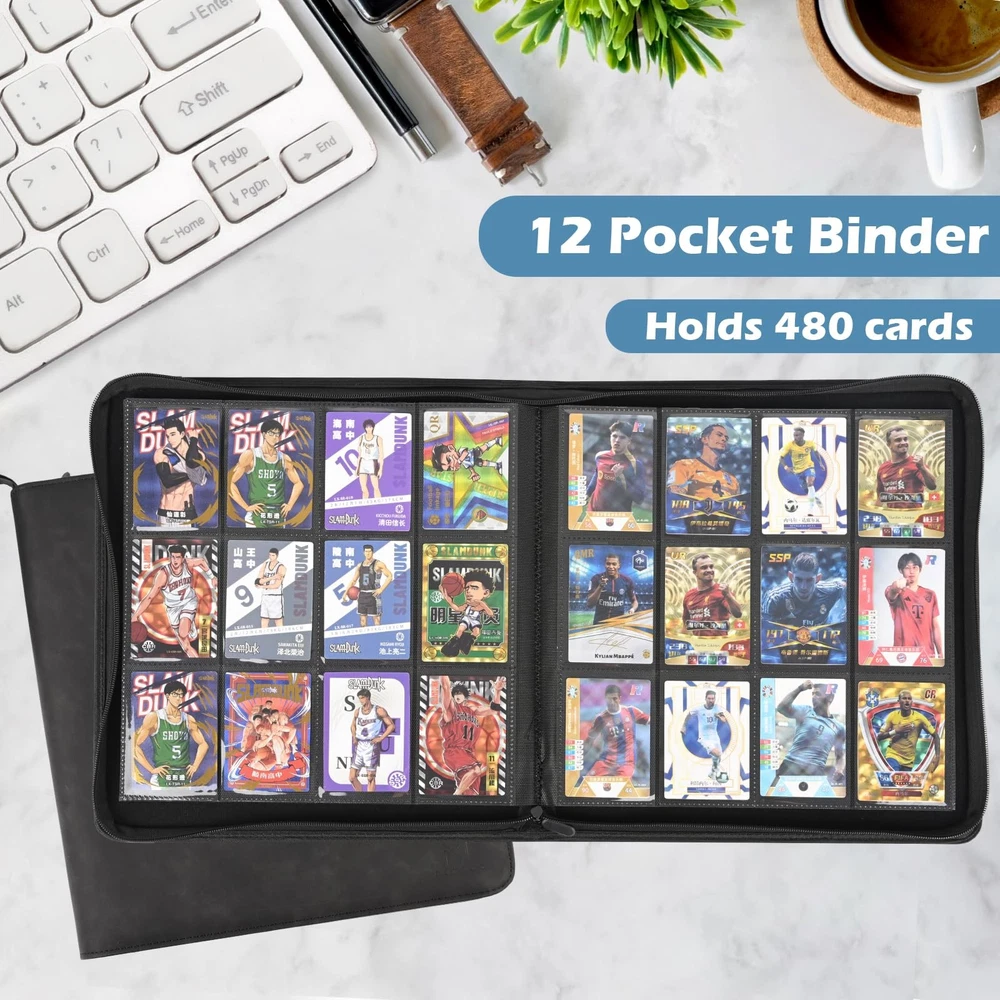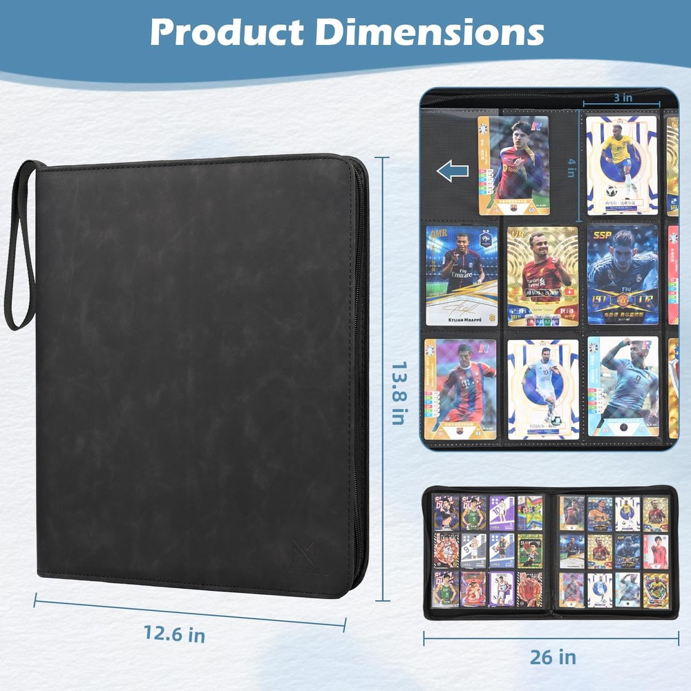 Protect, organize, and showcase your valuable card collection with this premium collectible card binders, designed for all types of standard-sized trading cards, including TCG cards, MTG cards, baseball cards, basketball cards, football trading cards. Whether you’re a hobbyist or a serious collector, this card book zipper is the perfect solution for keeping your cards safe and well-organized. The tcg binder 12 pocket includes 20 pages, each with 12 pockets on both sides, offering a total of 480 pockets for your collection. Made from transparent, durable plastic, each pocket displays your cards clearly while protecting them from damage. The side loading card binder design prevents your cards from falling out, making it easier to access and organize your collection. The high-quality leather cover of the binder is waterproof and provides excellent protection against external elements, keeping your cards safe from water, dust, and wear. Whether you need a MTG binder, a baseball card binder, or a sports card binder, this binder offers lasting durability and style. The smooth zipper closure keeps dust, dirt, and fading at bay, ensuring your cards stay in pristine condition. Perfect for card collectors, this binder is the ultimate storage solution for any binder for cards needs, providing an efficient and safe way to store and display your card collection. Whether you’re organizing football card binders or adding to your sports card binder, this binder will keep your cards secure and protected for years to come. Large Capacity to Store Up to 480 Cards – This MTG card binder includes 20 pages, each with 12 pockets on both sides, offering a total capacity of 480 standard-sized cards. Perfect for TCG cards, MTG cards, baseball cards, basketball cards, football cards, and trading cards, this card album is the ultimate storage solution for all types of cards Premium Leather Cover for Durability and Style – Made from high-quality, waterproof leather, these collectible card binders not only protects your cards from external elements but also gives it a sophisticated and durable finish. Whether you’re looking for a sports card binder, baseball card binder, this mtg card binder adds a premium feel to your card collection Crystal Clear, Durable Pockets for Display and Protection – Each pocket is made from transparent, durable plastic, allowing you to clearly see your cards while keeping them safe from damage, scratches, or bending. Whether you’re using it as an MTG binder or TCG binder, this card binder zipper ensures your collection stays pristine and protected Side Loading Design for Extra Security – The side loading card binder design ensures that your cards are inserted from the side, preventing them from slipping out. This feature provides extra security for your valuable cards, making it ideal for long-term storage and display Smooth Zipper for Full Protection – The baseball card binder is equipped with a high-quality zipper that keeps your cards secure and prevents dust, dirt, and fading. Whether it’s used as a football card binder, sports card binder, tcg binder 12 pocket, or a card collection binder, the zipper ensures your cards are kept in pristine condition for years