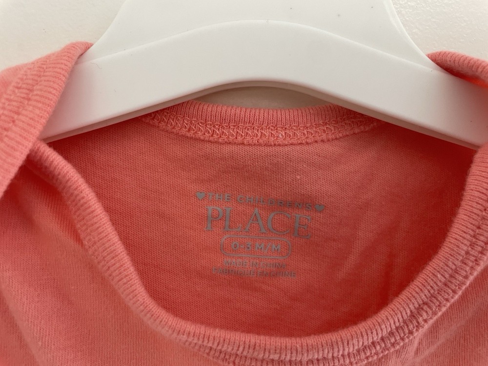 Seller Notes: “In very good condition. Free of rips or stains.” Size: 0-3 Months Features: Comfort, Easy Care, Lightweight, Stretch Accents: Glitter, Pleated Number of Pieces: 1 Piece Country of Origin: China Material: 100% Cotton Pattern: Graphic Print Brand: The Children's Place Department: Girls Set Includes: Bodysuit Garment Care: Machine Washable Sleeve Length: Short Sleeve Type: One-Piece Occasion: Casual Closure: Snap Color: Coral Style: Bodysuit Season: Fall, Spring, Summer
