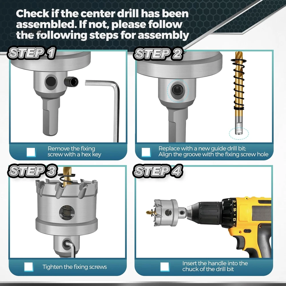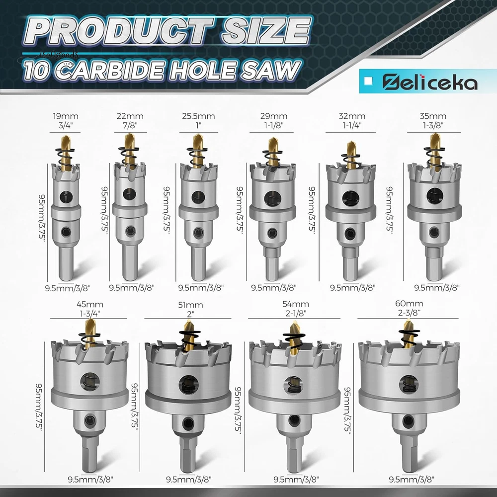 Premium TCT Carbide Hole Saw Set - Versatile, Durable, and Precision-Engineered Upgrade your toolkit with this high-quality TCT Carbide Hole Saw Set, designed for superior performance and longevity. Perfect for professionals and DIY enthusiasts alike, this set ensures precision cuts in various materials with ease. Package Includes: 10 Hole Saw Sizes : 19mm (3/4"), 22mm (7/8"), 25.5mm (1"), 29mm (1-1/8"), 32mm (1-1/4"), 35mm (1-3/8"), 45mm (1-3/4"), 51mm (2"), 54mm (2-1/8"), 60mm (2-3/8") 2 Extra Pilot Drill Bits 2 L-Wrench 1 Exquisite Aluminum Box for easy storage and transport Key Features: Superior Quality : Made of high-quality TCT Carbide (Tungsten Carbide Tipped Cutters), this set offers high hardness, rust prevention, and exceptional durability. Versatile Applications : Ideal for cutting through hard materials like stainless steel, mild steel, iron, aluminum, copper, as well as FRP, wood, and plastic. Easy to Use : Compatible with handheld electric drills, mobile ribbon-type magnetism drilling machines, and stand motor-driven drilling machines. Adding coolant during high-speed drilling prevents burning or breaking, extending the product's lifespan. Portable Design : The metal hole saw kit comes with a compact and sturdy aluminum box for convenient use and storage. Product Description: Newly Upgraded Alloy Blade : Featuring a three-blade design for serrations, ensuring versatile and durable precision cuts in various materials. Material : TCT carbide Handle Diameter : 3/8 Inch Cutting Length : 1 Inch Cutting Diameter : 19mm (3/4"), 22mm (7/8"), 25mm (1"), 29mm (1-1/8"), 32mm (1-1/4"), 35mm (1-3/8"), 45mm (1-3/4"), 51mm (2"), 54mm (2-1/8"), 60mm (2-3/8") Safety Features: Multi Safety Protection : Includes overload protection, short-circuit protection, over-current protection, over-voltage protection, and overheating protection, making it a safe and reliable choice. Portable and Convenient : Compact size, large capacity, and easy to store, making it perfect for home, office, and travel.