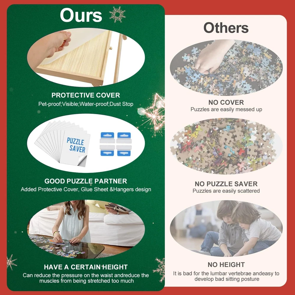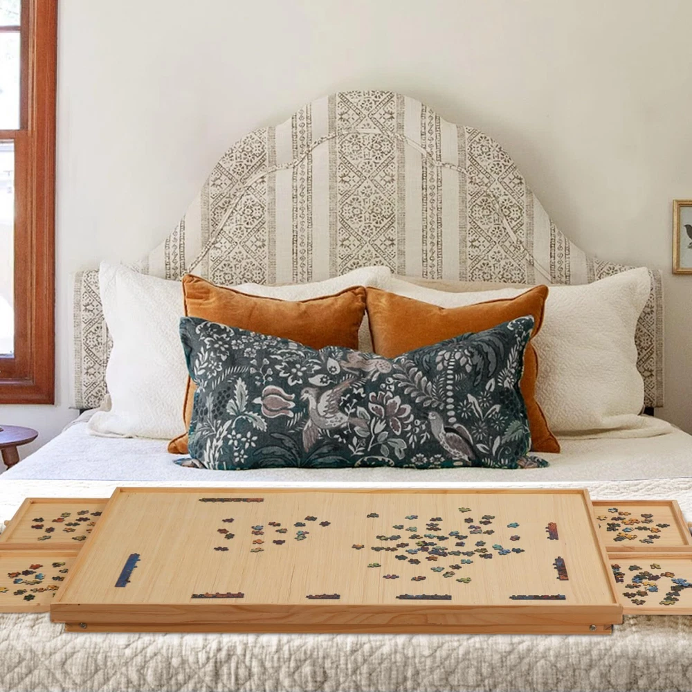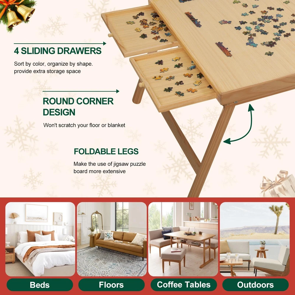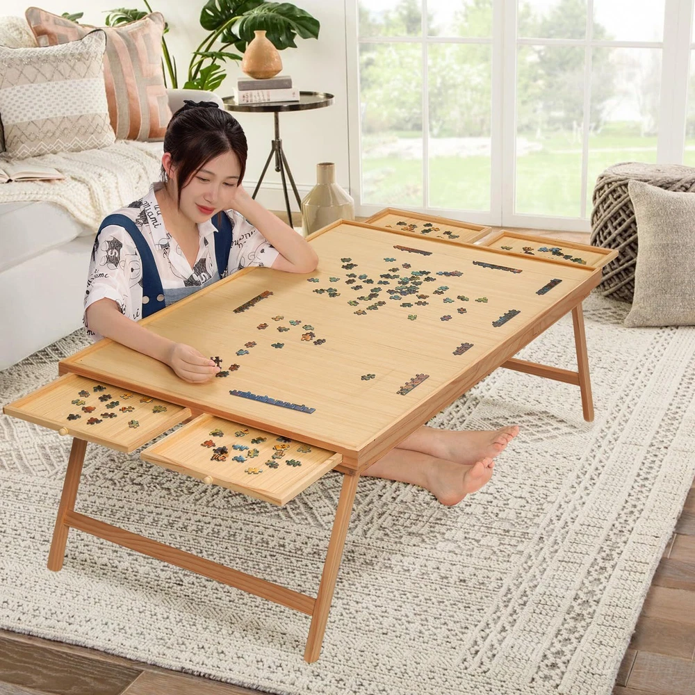 TEAKMAMA 2000 Piece Wooden Jigsaw Puzzle Board with 4 Drawers, Folding Puzzle Table with Protective Cover, Puzzle Board with Legs, Multifunctional Puzzle Board for Adults, 41.3W x 27.5D, Natural 【Great Puzzle Table】The puzzle board is made of wood to ensure that the product is sturdy. Wooden tenons have been installed on the inner side of the horizontal bar and vertical bar of the support to prevent product cracking; The whole puzzle table is polished smooth and non slip, so that you can move the puzzle easily. Our folding puzzle table provides more possibilities for use in different scenarios, which is a quality choice for puzzle lovers. 【Comfortable Choice】You can use our puzzle table to make puzzles in a comfortable sitting position on the bed or carpet, instead of lying down or hunching down, which is beneficial to the lumbar vertebrae of adults. The folding puzzle table combines the convenience of the legless puzzle tray, which can be multipurpose use, and can also be easily stored under the sofa/bed/dining chair at home. 【4 Drawers and Puzzle Cover】4 Drawers provide extra surface space to work on which you can keep the pieces organized in the drawers instead of on the board itself, making it easier to see the big picture. Protective Cover helps a lot in organizing pieces and are easily able to put a unfinished puzzle away anytime. 【Super Large Workspace】41.3"X27.5" puzzle working area, suitable for most 2000 pieces of puzzles, 1500 & 1000 pieces puzzle also available. 【Interesting and Educational】 Designed for all puzzle lovers, a great helper when organizing puzzles. Take out the puzzle plate and put it on the coffee table, sofa, bed, start a happy journey with your friends at any time. 2000 Piece Folding Puzzle Board with Drawers and Cover,Portable Wooden Jigsaw Puzzle Table for Adults Portable,Foldable Puzzle Boards Shipping We offer FREE shipping on all orders! We use a selection of shipping services such as UPS, FedEx, USPS etc. We only ship to the lower 48 states, no APO/FPO addresses or PO Boxes allowed. Local pickups and combined shipping options are not provided at this time. Return You can return a product for up to 30 days from the date you purchased it. Any product you return must be in the same condition you received it and in the original packaging. Please keep the receipt. Payment We accept payment by any of the following methods: PayPal Please pay as soon as possible after winning an auction, as that will allow us to post your item to you sooner! Feedback Customer satisfaction is very important to us. If you have any problem with your order, please contact us and we will do our best to make you satisfied. Contact Us If you have any queries, please contact us via ebay. We usually respond within 24 hours on weekdays. Please visit our eBay store to check out other items for sale! Thank you for shopping at our store.