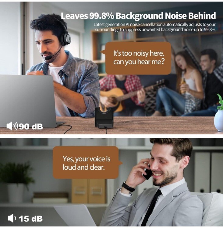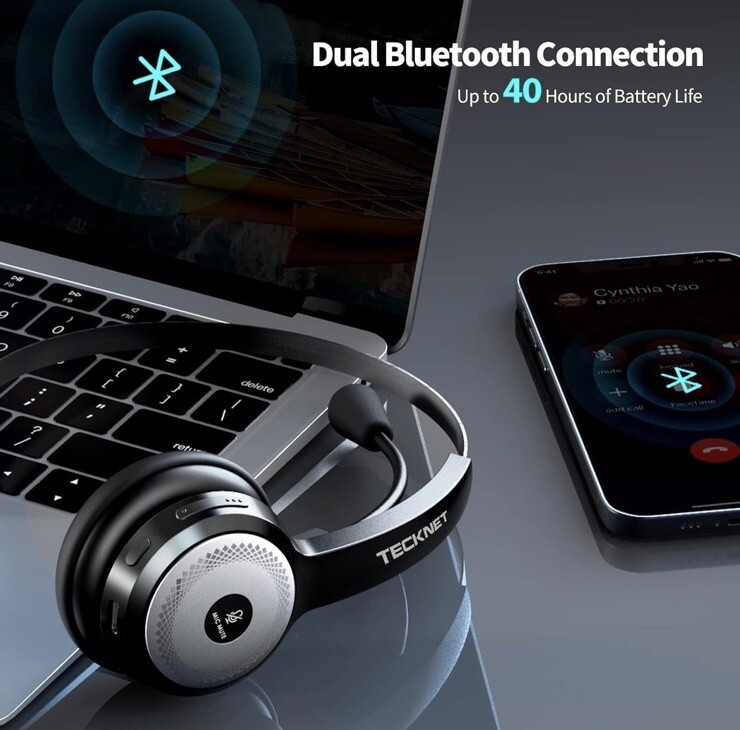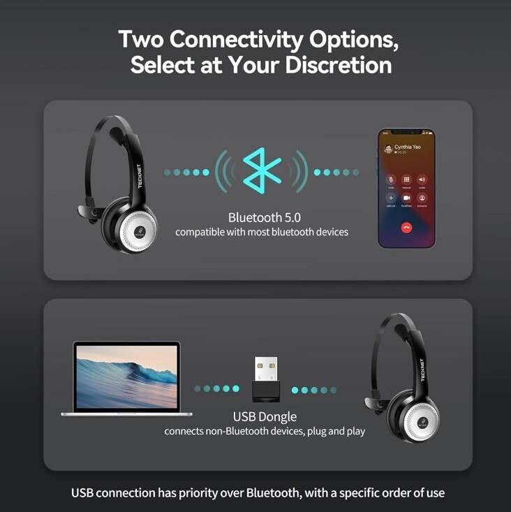 AI Noise Cancellation and Silence: TECKNET Bluetooth headphones with AI noise-canceling microphone effectively block 99.8% of background noise, ensuring a clear voice transmission without discomfort. The wireless headphones with microphone for working on the cell phone have an instant silence function that can be easily activated during conversations with the cell phone, making it ideal for private discussions or eliminating unwanted noise. NOTE: If a non-mobile phone device is connected, (such as the computer), the mute button does not work Dual connection and wide compatibility: Bluetooth 5.0 headset with microphone for PC quickly connect to multiple devices and switch seamlessly between computer meetings and incoming calls for an efficient life and work. Even on devices that lack Bluetooth, use a USB adapter for faster pairing and stable connectivity. (Notice: The USB adapter has priority connectivity, if you connect USB and connect via Bluetooth at the same time on a device, the device will select the USB connection 33ft/32.8 ft working range: Use this wireless headset with microphone to work and enjoy its impressive 49-foot range, seamlessly connecting to your computer, PC, tablet or cell phone. Ensure optimal connectivity by maintaining an open distance between the USB wireless headphones and your device, since obstacles can interfere with connection stability, and too many wireless devices around the device will also affect the connection, it is recommended to change the environment to test Adjustable headband and flexible microphone: TECKNET is always designed for comfortable use throughout the day, wireless headphones with microphone have an adjustable and elastic headband to fit both children and adults (not comfortable for larger head sizes). The wireless headset with microphone for work offers flexible microphone positioning, ensuring the perfect position for optimal voice clarity during calls. Note: the microphone is at least 3.9 in away from the mouth. Too close will result in an unclear sound Long-lasting battery with charging base: Bluetooth headphones with microphone for PC come with a plug-and-play charging base, which offers convenient charging and storage support, you can also directly use the USB-C cable to charge (included). Just 2 hours of charging provides up to 40 hours of working time and 400 hours of standby time for computer headsets with microphone. During emergency charging, the base can increase your device by 30% in 30 minutes. Notice: not compatible for use while charging Warning: TECKNET Bluetooth headphones with microphone with ambient noise cancellation are not suitable for studio recording and regular call recording, as their AI noise cancellation is limited to eliminating ambient noise in the vicinity of the caller during the call and transmitting clear human voice to the other party. When the device records a call, there will be noise in the recorded audio because the device does not have an ambient noise reduction chip
