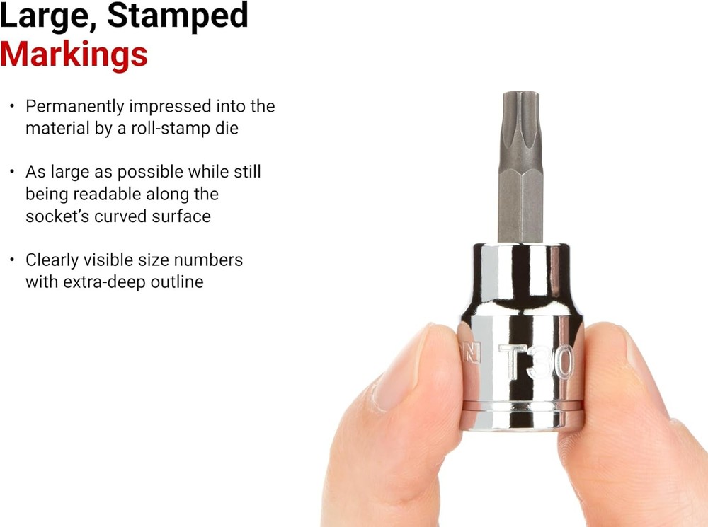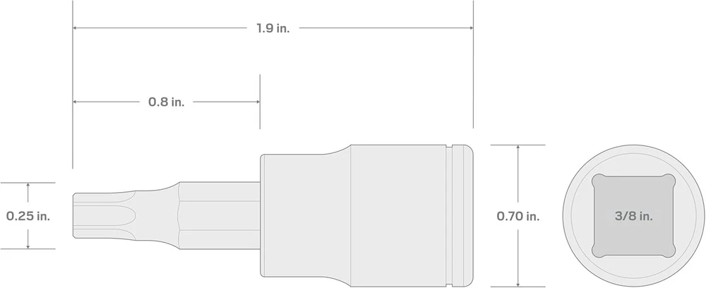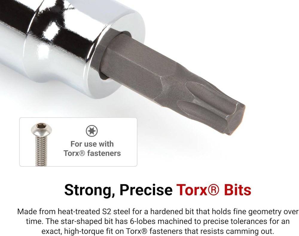 TEKTON 3/8 Inch Drive x T27 Torx Bit Socket | SHB14227 Product Details Brand: TEKTON Item Length: 1.9 Inches Material: Alloy Steel Drive System: Star Finish Type: Polished Number of Pieces: 1 UPC: 020209024614 Global Trade Identification Number: 00020209024614 Manufacturer: TEKTON Part Number: SHB14227 Item Weight: 0.01 ounces Item model number: SHB14227 Size: T27 Style: Standard Finish: Polished Item Package Quantity: 1 Measurement System: Imperial Compatible Fastener Range: 0.375 inches Included Components: (1) TEKTON 3/8 Inch Drive x T27 Torx Bit Socket | SHB14227 Batteries Required?: No Brand: TEKTON Item Length: 1.9 Inches Material: Alloy Steel Drive System: Star Finish Type: Polished S2 steel bit is press-fit into the socket for a straight, permanent connection that can't loosen over time Star-shaped Torx bit has 6-lobes machined to precise tolerances for an exact, high-torque fit that resists camming out Large, clear die-stamped size marking is easy to read and can’t wear off Four detent grooves provide a secure connection with the drive tool and a drilled through-hole allows locking on with retaining pin Polished, chrome-plated finish easily wipes clean and is highly resistant to corrosion Beveled inner rim of the socket opening helps guide it smoothly onto fasteners Overall Length: 1.9 in., Shaft Diameter: 0.25 in., Drive End Diameter: 0.70 in., Exposed Bit Length: 0.8 in. Tekton S2 steel bits are press-fit into the socket for a straight, permanent connection that can't loosen over time. The star-shaped Torx(R) bit has 6-lobes machined to precise tolerances for an exact, high-torque fit that resists camming out. TORX® is a registered trademark of Acument Intellectual Properties, LLC