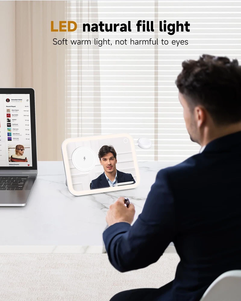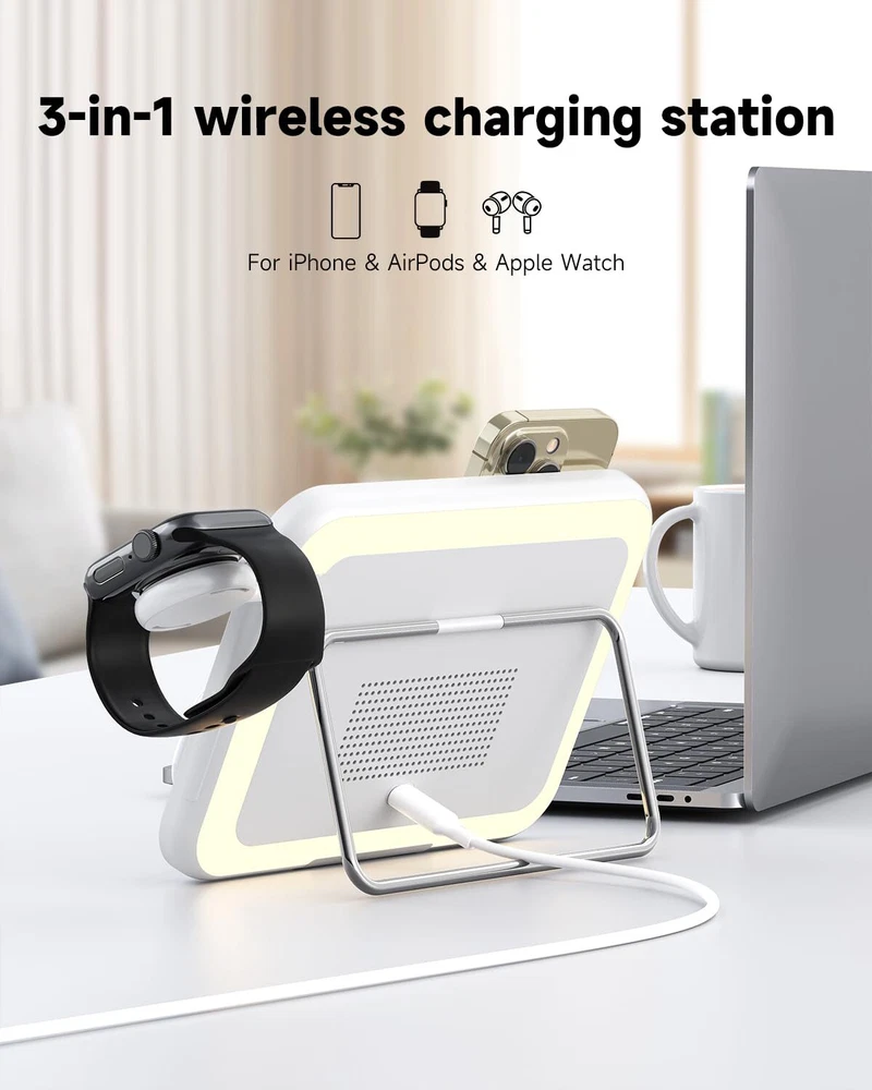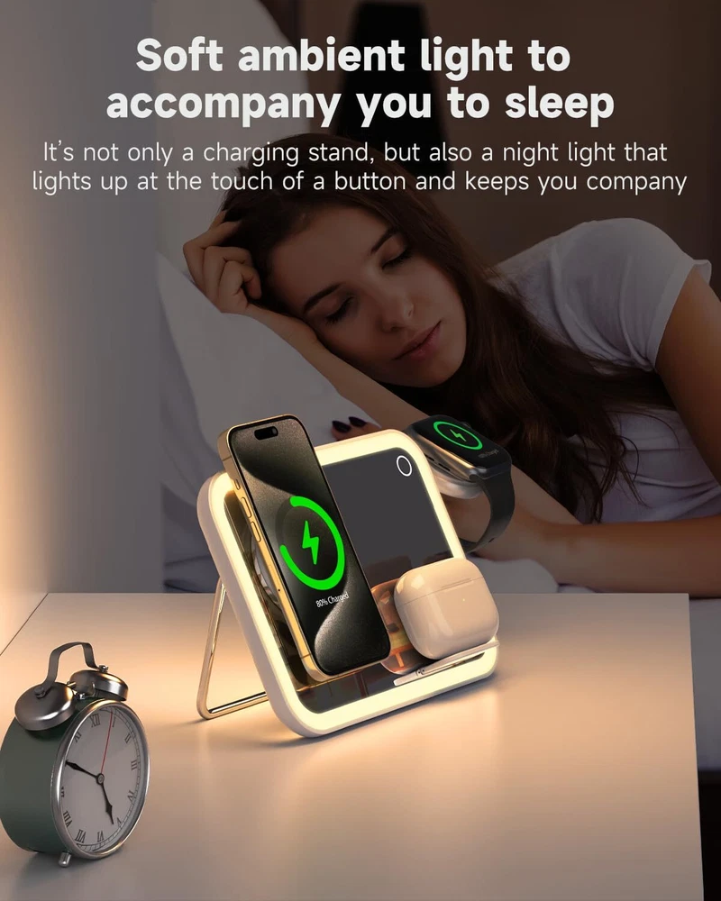 【3 in 1 Magnetic Charging】: This charger stand utilizes wireless technology for secure, efficient wireless charging of compatible phones, Magsafe Charger for iphone 12/13/14/15/16 series, apple watch, airpods pro. 【As a night Light】: The wireless charger stand is also a small bedside night light with 3 adjustable gears 【As a Mirror】This magnetic 3 in 1 charger station is also an LED luminous makeup mirror Compact and Portable: The sleek, lightweight construction makes it easy to carry this charger stand wherever you go. 【Safe Charging:】Built-in safeguards prevent overcharging, overheating, and short-circuiting for reliable, worry-free charging. Freely adjust the angle of the magnetic charger station for iPhone