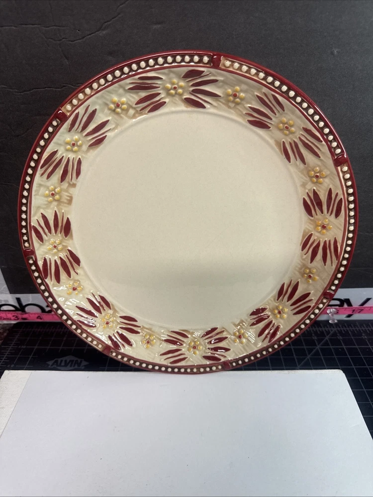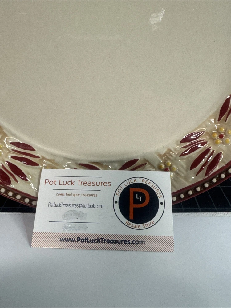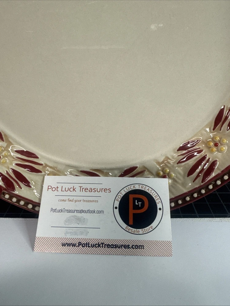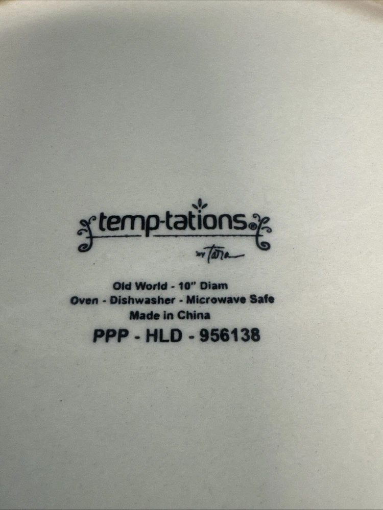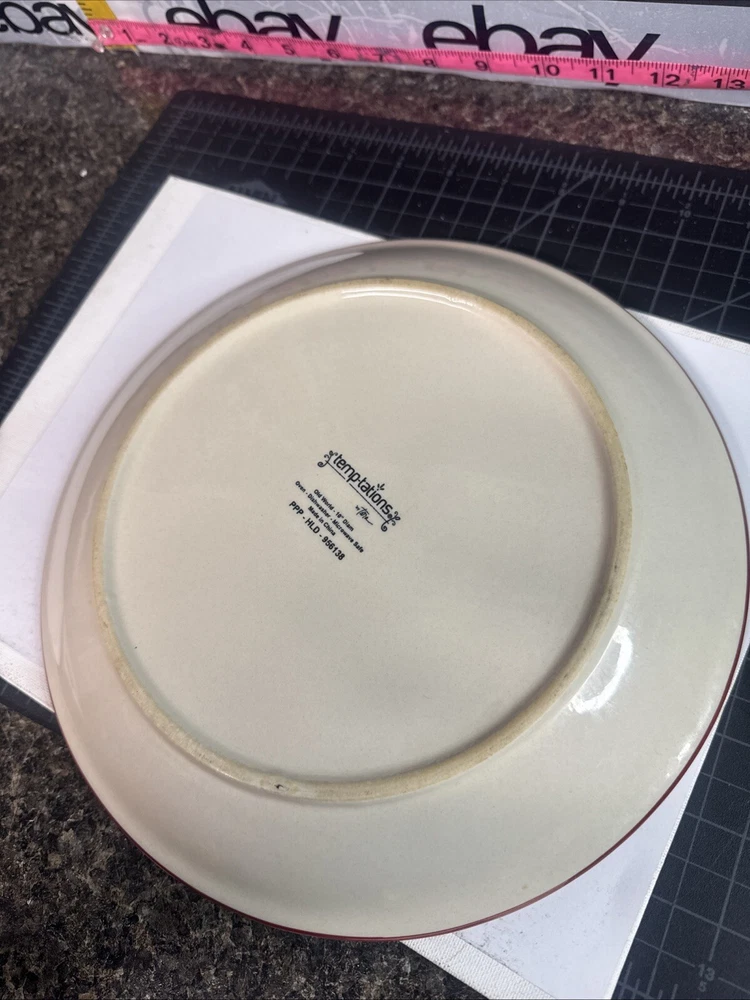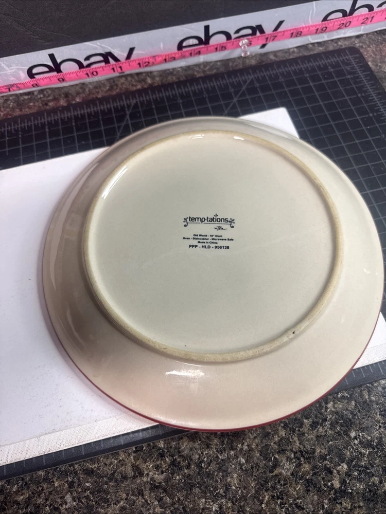 This TEMPTATIONS 10” dinner plate is a beautiful addition to any table setting. The plate features a stunning floral pattern in vibrant red, with a basketweave theme that adds a touch of elegance to any occasion. Crafted from high-quality stoneware, this plate is both oven, microwave, and dishwasher safe, making it a practical choice for everyday use or special occasions. The round shape of the plate is perfect for serving a variety of dishes, and the glossy finish adds a touch of sophistication to any table setting. This original, licensed reproduction is part of the Old World Basketweave product line, and is produced using traditional pottery techniques in China. With a printed backstamp and a production style that combines earthenware with modern technology, this plate is a must-have for any collector or anyone who appreciates beautiful, high-quality dinnerware. This is a preowned replacement plate . Please see photos for condition. Please feel free to contact us with any questions before purchasing.