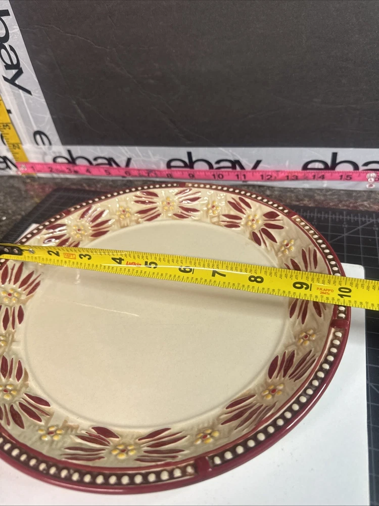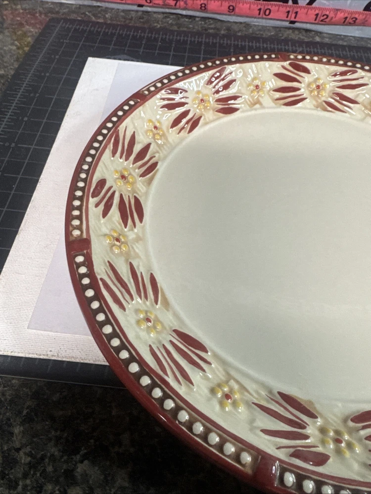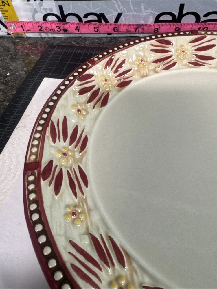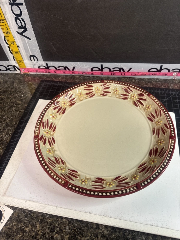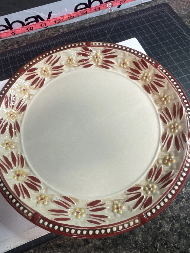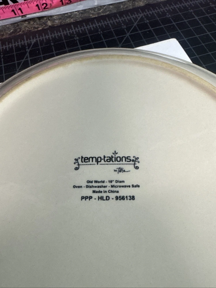 This TEMPTATIONS 10” dinner plate is a beautiful addition to any table setting. The plate features a stunning floral pattern in vibrant red, with a basketweave theme that adds a touch of elegance to any occasion. Crafted from high-quality stoneware, this plate is both oven, microwave, and dishwasher safe, making it a practical choice for everyday use or special occasions. The round shape of the plate is perfect for serving a variety of dishes, and the glossy finish adds a touch of sophistication to any table setting. This original, licensed reproduction is part of the Old World Basketweave product line, and is produced using traditional pottery techniques in China. With a printed backstamp and a production style that combines earthenware with modern technology, this plate is a must-have for any collector or anyone who appreciates beautiful, high-quality dinnerware. This is a preowned replacement plate . Please see photos for condition. Please feel free to contact us with any questions before purchasing.