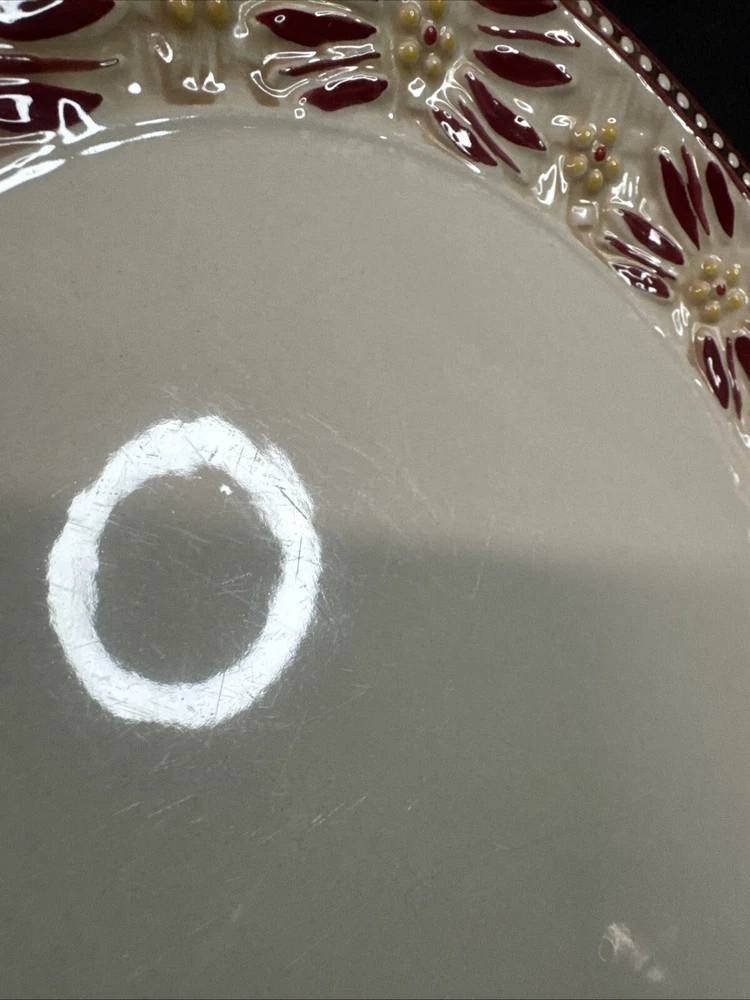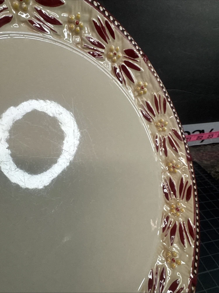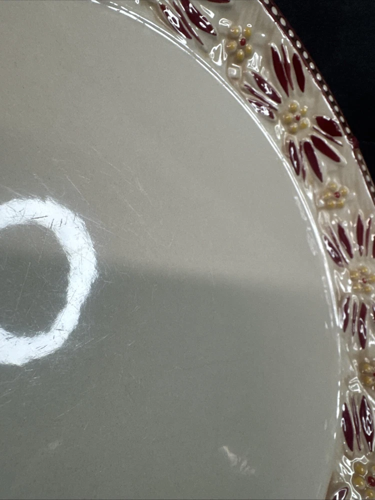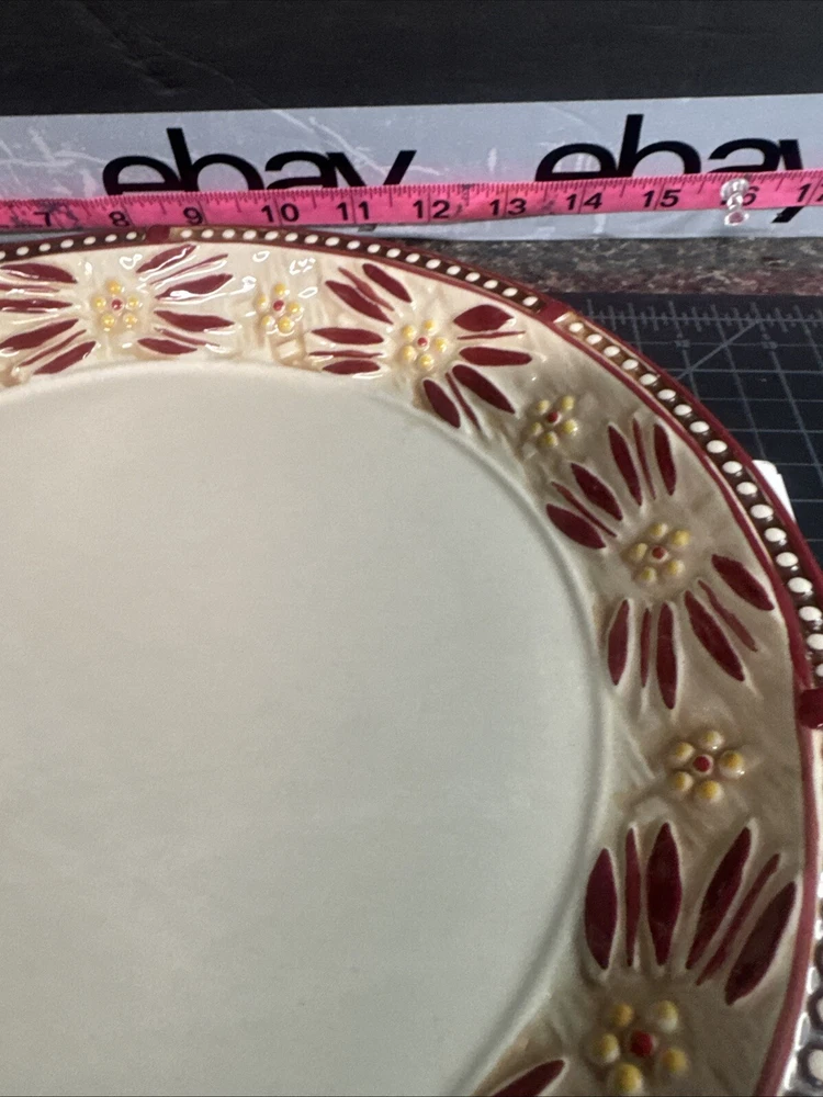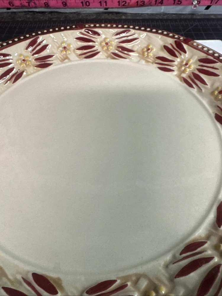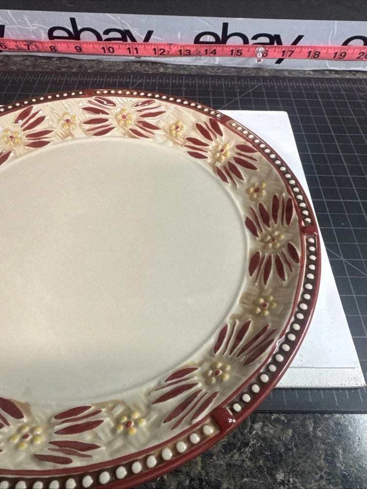 This TEMPTATIONS 10” dinner plate is a beautiful addition to any table setting. The plate features a stunning floral pattern in vibrant red, with a basketweave theme that adds a touch of elegance to any occasion. Crafted from high-quality stoneware, this plate is both oven, microwave, and dishwasher safe, making it a practical choice for everyday use or special occasions. The round shape of the plate is perfect for serving a variety of dishes, and the glossy finish adds a touch of sophistication to any table setting. This original, licensed reproduction is part of the Old World Basketweave product line, and is produced using traditional pottery techniques in China. With a printed backstamp and a production style that combines earthenware with modern technology, this plate is a must-have for any collector or anyone who appreciates beautiful, high-quality dinnerware. This is a preowned replacement plate . Please see photos for condition. Please feel free to contact us with any questions before purchasing.