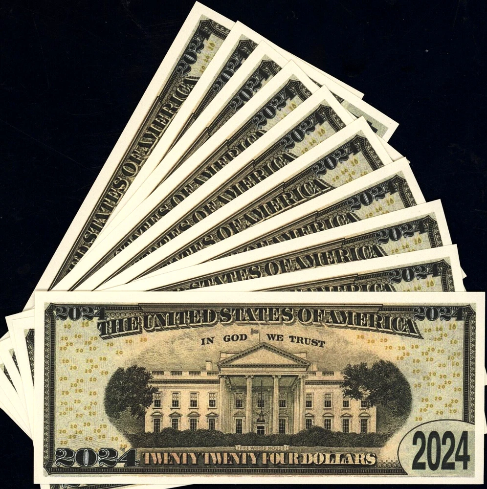10 (TEN) 2024 Donald Trump Re-Election Presidential Bills ~ Come in Hard Plastic Wallet ~ BUY ONE OR MORE SETS OF TEN * Here are TEN 2024 Donald Trump for President Limited Edition Novelty Dollar Bills. These are full color Front and Back printing with Great Detail. Make America Great Again! * Each bill has the same look , feel and size as real U.S. Money currency * These will make great gifts for friends and family. * The photo shows the EXACT TEN bills that you will receive. * You can buy multiple sets of 10 bills each United States shipping and handling is $1.00 for these TEN items. Visa/MasterCard and Discover payments can be made through PayPal.