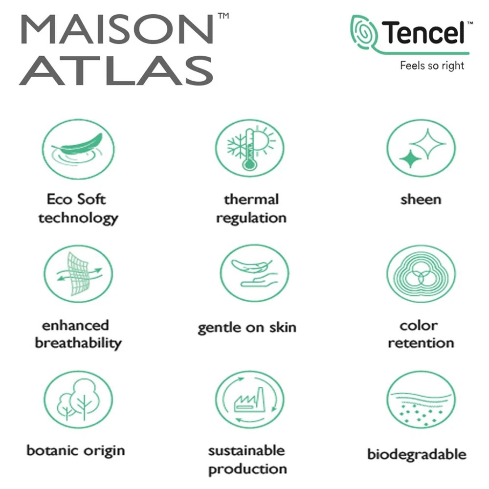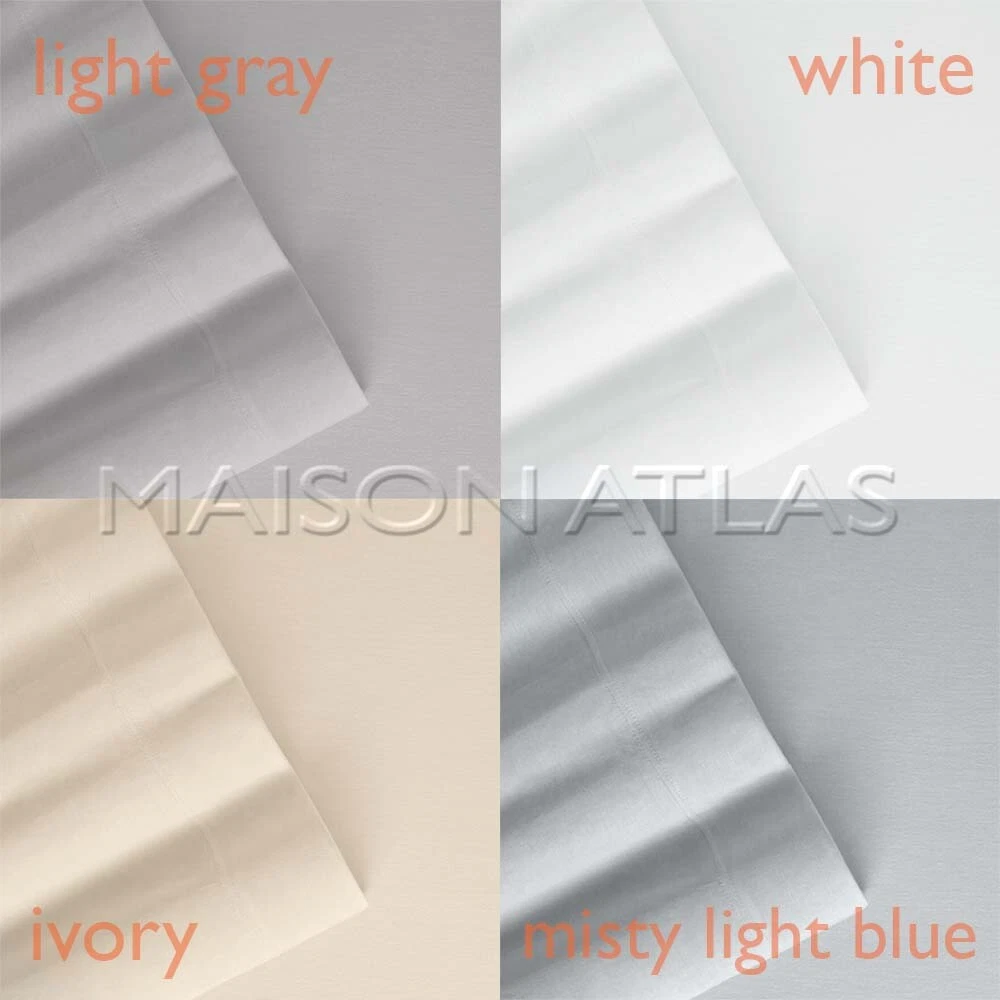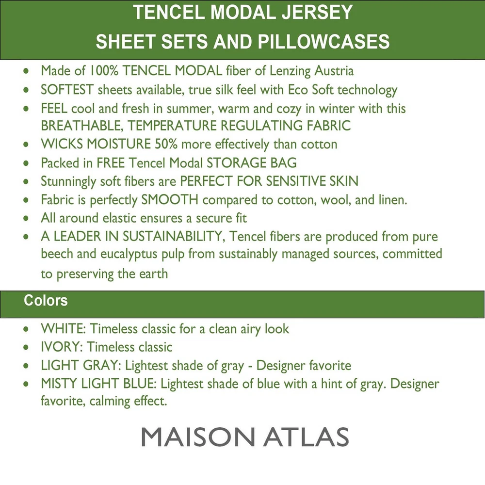 Tencel Modal Jersey Sheet Sets and Pillow Cases By MAISON ATLAS · Made of 100% TENCEL MODAL fiber of Lenzing Austria. · SOFTEST sheets available, true silk feel with Eco Soft technology. · FEEL cool and fresh in summer, warm and cozy in winter with this BREATHABLE, TEMPERATURE REGULATING FABRIC. · WICKS MOISTURE 50% more effectively than cotton, keeping you comfortable as you sleep. · Packed in FREE Tencel Modal STORAGE BAG. · Stunningly soft fibers are PERFECT FOR SENSITIVE SKIN · Fabric is perfectly SMOOTH compared to cotton, wool, and linen. · All around elastic ensures a secure fit · A LEADER IN SUSTAINABILITY, Tencel fibers are produced from pure beech and eucalyptus pulp from sustainably managed sources, committed to preserving the earth. · GENUINE ARTICLE for a fraction of the retail store price. Package contents · Twin / Twin XL SHEET SET includes: 1 flat sheet, 1 fitted sheet, and 1 pillowcase , · Full / Queen / King / California King SHEET SET includes 1 flat sheet, 1 fitted sheet, and 2 pillowcases . · Packed in FREE Tencel Modal STORAGE BAG. Additional matching Tencel Modal Pillowcases available in a different listing. Buy more, save more. Pa Colors conn · WHITE: Timeless classic for a clean airy look · IVORY: Timeless classic · LIGHT GRAY: Lightest shade of gray - Designer Favorite · MISTY LIGHT BLUE: Lightest shade of blue with a hint of gray. Designer Favorite. Calming effect. “A Thing of Beauty Is a Joy Forever.” conn · If you enjoy high quality, ultra-soft textiles also check our MAISON ATLAS Premium VELVET Collections (Charlotte, Jewel, and Solid.) · At Maison Atlas, we are totally committed to keeping you happy about our products and our service. Once you have had the pleasure of owning and using our products, we hope that you will purchase Maison Atlas home products for life.