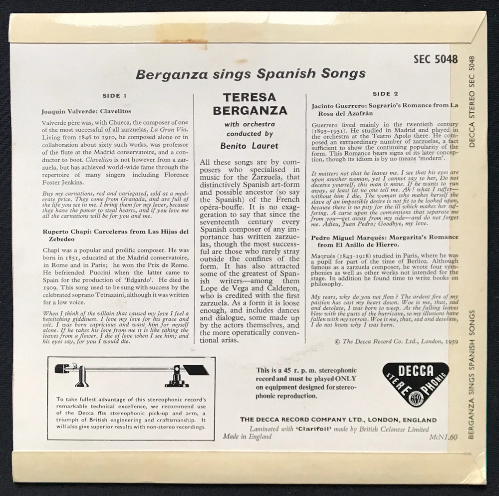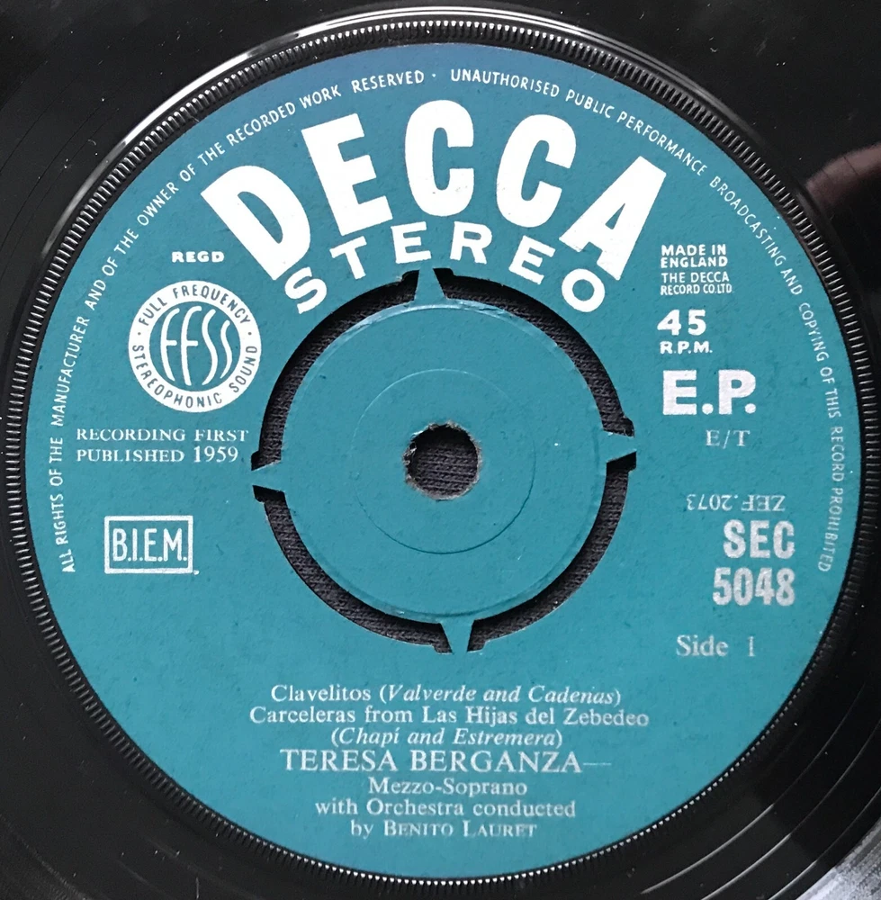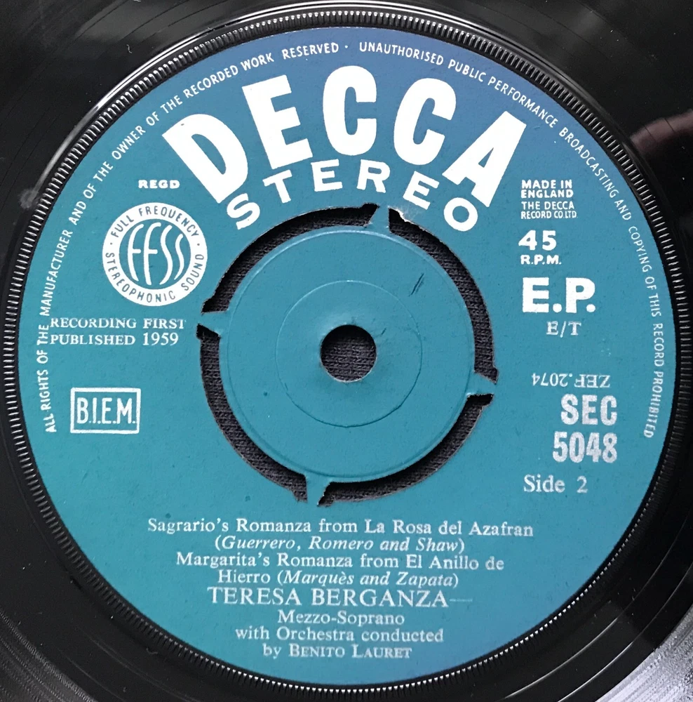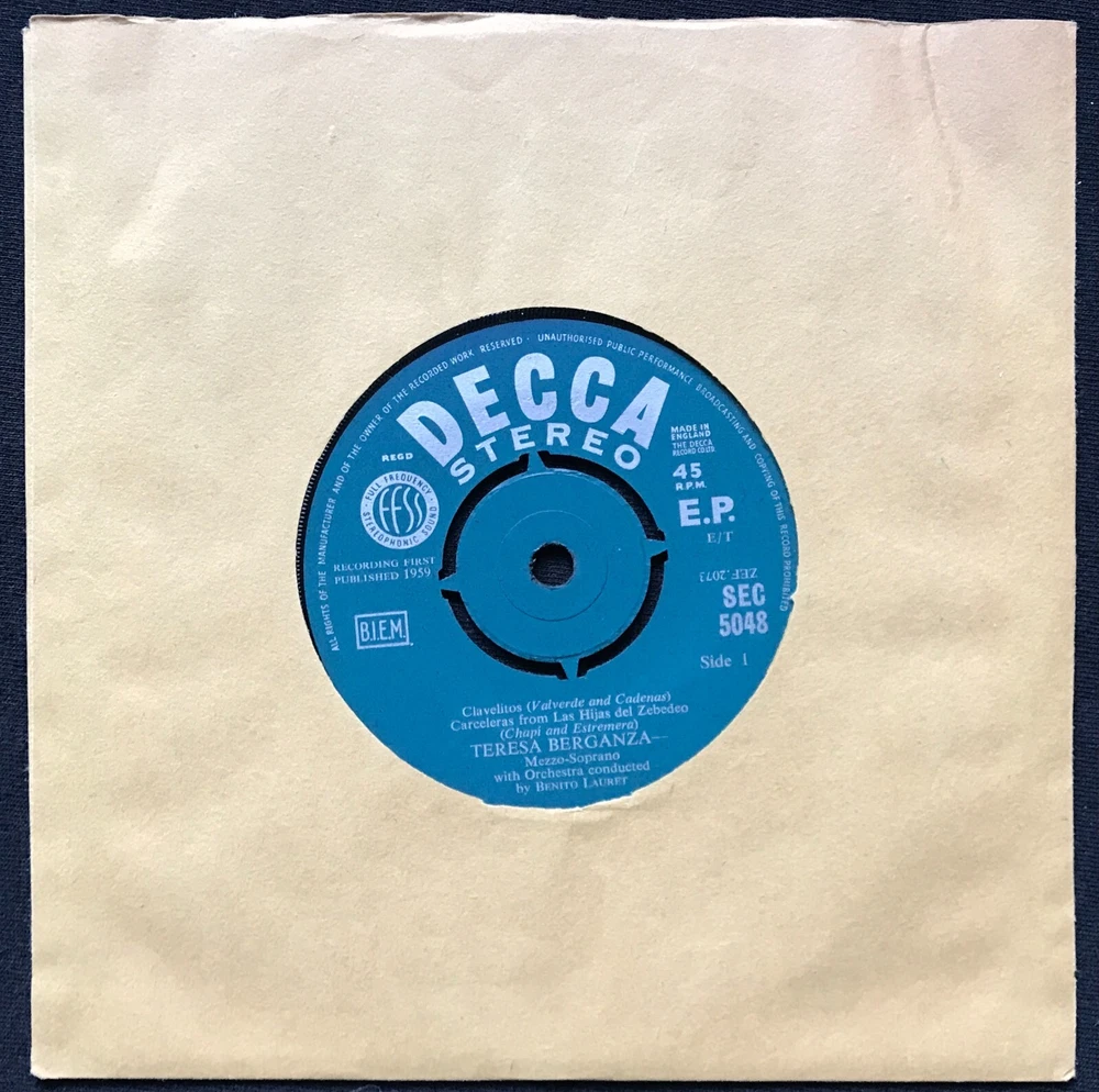 Teresa Berganza – Berganza Sings Spanish Songs Label: Decca – CEP 638, Decca – CEP.638 Series: Artists' Portraits – Format: Vinyl, 7", 45 RPM, EP Country: UK Genre: Classical this is the rare STEREO version SEC 5048 VINYL IN EX+ CONDITION - Extremely light wear. SLEEVE IN EX CONDITION - Extremely light wear. A tiny amount of discoloration only.
