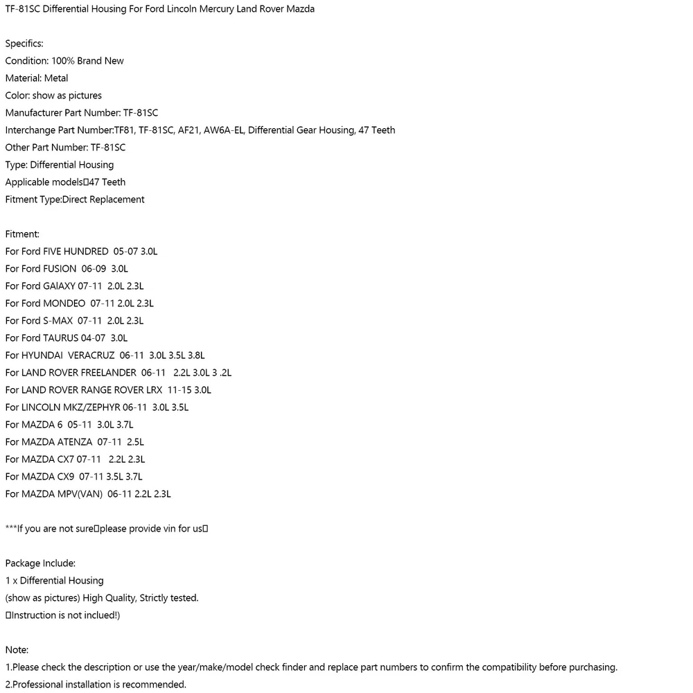 You may also like Rear Differential Pump 7F93-4C019-AA 8V414C019AA 1526441 For FORD KUGA 83.63 USD Free shipping 5th Generation AWD Pump 2274601 For Range Rover Evoque L538 Discovery Sport 119.63 USD Free shipping Rear Differential Pump LR093768 For Land Rover Range Rover Velar 2017-2023 109.88 USD Free shipping Rear Differential Dynamic Damper Fits Honda 02-06 CRV 03~10 Element 50716S9A000 54.63 USD Free shipping Rear Differential Assembly 41:11 3.727 Gear Ratio For Toyota 4Runner 4.0L 03~09 639.88 USD Free shipping Rear Coupling Diff AWD Pump LR008958 For Land Rover Freelander 2 2009-2015 130.63 USD Free shipping Rear Differential Drive Sprocket A2463506900 For Mercedes W246 CLA250 B25 A45 374.63 USD Free shipping AWD Coupling Oil Pump 22765779 For Cadillac SRX 10-16 XTS 14-19 Buick LaCrosse 109.63 USD Free shipping Rear Differential Oil Pump 8689664 30783079 For Volvo S60 S80 V70 XC70 XC90 91.63 USD Free shipping Coupling Assembly Electric 38761JG20A 38761JG20B For Nissan Rogue 2008-2012 457.63 USD Free shipping Electric Coupling 3210034110 32100-34110 For Ssangyong ACTYON KYRON KORANDO C 565.63 USD Free shipping Rear Axle Differential Locking Motor LR032711 For Land Rover Range Rover MK IV 204.63 USD Free shipping Differential Lock Motor 1645400288 For Mercedes Benz Ml63 Amg 6.3L 2007-2011 162.63 USD Free shipping Rear Wheel Drive Module Clutch Kit 42769821 For Chevrolet Buick 2013-2022 651.63 USD Free shipping Transmission A6LF2 A6LF3 AWD Differential Cover 45822-3B450 For Hyundai Kia 201.63 USD Free shipping Auto Trans Differential Case Cup 45822-3B250 For Santa Fe Sorento Sportage 15-22 193.63 USD Free shipping All Models For Honda For Suzuki For Kawasaki For Yamaha For BMW For Polaris For CFmoto For Ducati For Benelli For Trident For Triumph For Aprilia Other part You may also like Fuel Filler Cap Keyless Fit for Kawasaki Ninja 400, EX 400 G 2018 - 2019 Blue 51.63 USD Free shipping Dual Cab Roof Moulding Mould Rubber 75552-0K011/31 For Toyota Hilux KUN26 KUN16 63.63 USD Free shipping Stator Generator Fit for Suzuki RMZ 250 RM-Z 250 2007 2008 2009 32101-10H00 56.63 USD Free shipping Rail Fuel Pressure Sensor 89458-71010 For Toyota Hilux Hiace D4D 3.0L 22.63 USD Free shipping Engine Fan Cover Protector Guard For Vespa Sprint Primavera 125 150 2013-2020 49.63 USD Free shipping PRODUCT DESCRIPTION TF-81SC Differential Housing For Ford Lincoln Mercury Land Rover Mazda Feature: 1: According to the original factory specifications,perfect match for the original car. 2: Own different test machines to design exact accurate parameter for our products.All items were tested for performance. 3: Made by high quality material, lightweight, anti-rust, colorfast and durable. 4: Aftermarket product with premium quality. 5: Stable performance, high reliability,suitable for replacing your broken one. Specifics: Condition: 100% Brand New Material: Metal Color: show as pictures Manufacturer Part Number: TF-81SC Interchange Part Number:TF81, TF-81SC, AF21, AW6A-EL, Differential Gear Housing, 47 Teeth Other Part Number: TF-81SC Type: Differential Housing Applicable models:47 Teeth Fitment Type:Direct Replacement Fitment: For Ford FIVE HUNDRED 05-07 3.0L For Ford FUSION 06-09 3.0L For Ford GAlAXY 07-11 2.0L 2.3L For Ford MONDEO 07-11 2.0L 2.3L For Ford S-MAX 07-11 2.0L 2.3L For Ford TAURUS 04-07 3.0L For HYUNDAI VERACRUZ 06-11 3.0L 3.5L 3.8L For LAND ROVER FREELANDER 06-11 2.2L 3.0L 3 .2L For LAND ROVER RANGE ROVER LRX 11-15 3.0L For LINCOLN MKZ/ZEPHYR 06-11 3.0L 3.5L For MAZDA 6 05-11 3.0L 3.7L For MAZDA ATENZA 07-11 2.5L For MAZDA CX7 07-11 2.2L 2.3L For MAZDA CX9 07-11 3.5L 3.7L For MAZDA MPV(VAN) 06-11 2.2L 2.3L ***If you are not sure,please provide vin for us! Package Include: 1 x Differential Housing (show as pictures) High Quality, Strictly tested. (Instruction is not inclued!) Note: 1.Please check the description or use the year/make/model check finder and replace part numbers to confirm the compatibility before purchasing. 2.Professional installation is recommended. About Us Payment Shipping Returns Contact Us About VIPIH VIPIH is one of the international leading distributors specialized in distribution of motor parts of the world's prime motorcycle part suppliers on a global scale with the full responsibility in procurement, shipping, sales and marketing and after sales service. VIPIH fulfills all needs of its clients completely and on a timely basis with the know-how it has built up since it was established and the comprehension knowledge of the sectors standards. The perfectionist approach in product quality, high service availability, strict principle of business follow-up, reliability and the good reputation which has gained strength as a result of customer satisfaction are the most striking components of VIPIH's success. VIPIH is presently capable of supplying all demands for motor parts from the petrol pump to rectifier in a wide range. Free delivery with worldwide shipping options available. If you need any further information before ordering,please get in touch with expert advice. About Item All items sold by us are being described to the best of our abilities, as accurate as possible, and with utmost conscientiousness on our part. However, to avoid any potential oversights, I respectfully request your assistance in helping us to make this a mutually satisfactory transaction by THOROUGHLY reviewing item description and photos, and asking all questions PRIOR TO BIDDING. Customer Satisfactory 1.We back our commitment with superb service, 100% full money back and a customer satisfaction guarantee. 2.I am here and ready to assist you with any questions or concerns you might have before or after the purchase. 3.My goal is to make sure you are a happy customer and pleasant shopping with us. Feedback If you are satisfied with the purchase and our total service, your comment is very important in our business success. Please take a minute to leave us a positive feedback with an overall Detailed S