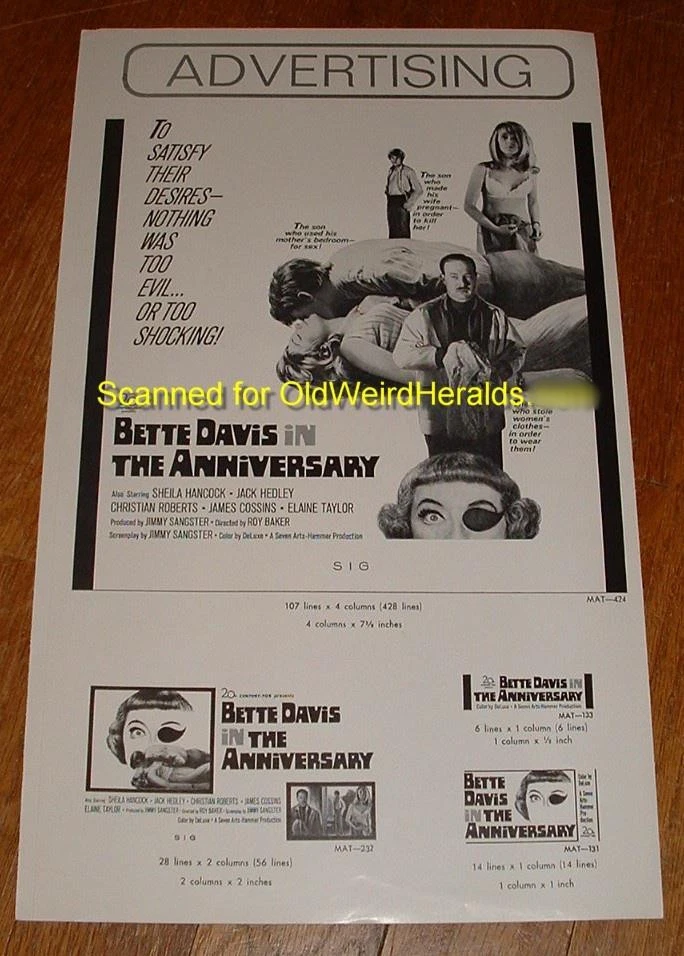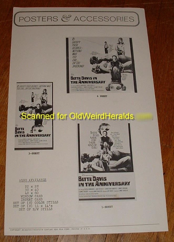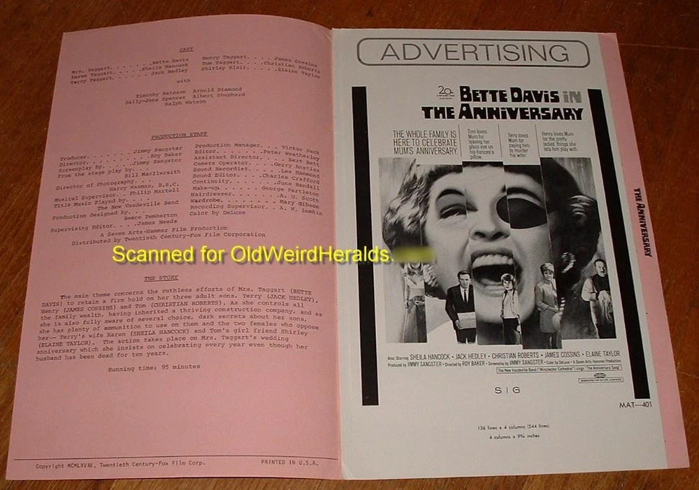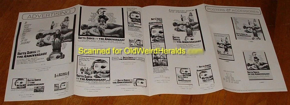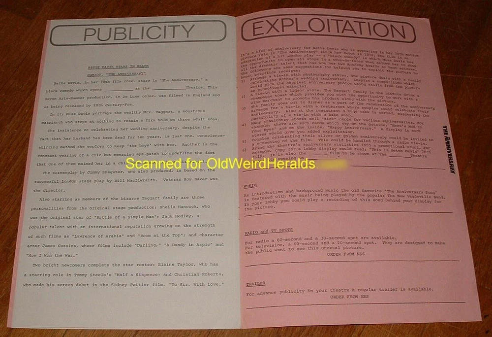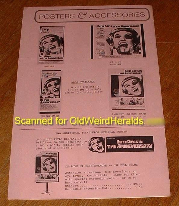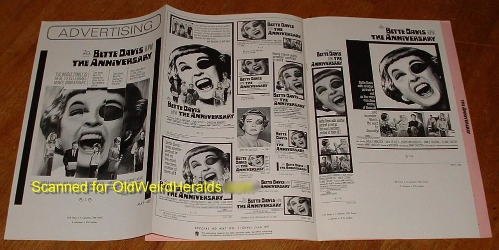 "The ANNIVERSARY" 1968 MOVIE PRESSBOOK: Stars BETTE DAVIS - You are Bidding on 1 LOT, includes 1 Vintage 20th Century Fox Theater Exhibitors Press Book & 1 Extra Advertising (Loose) Supplement - Fab Reference Items, Shows ADS & Movie Posters - SIZE: est. 8-3/4" x 13-3/4", 12+ pages of stuff (w/Fold-out pages), B&W interior, Cover is Pink Printed on Thick stiff Heavy Stock Paper, Folded/stapled spine - the item you see here is the one you will receive - SEE IMAGES for Sharpness & Defects - Fine Condition or Better: Theatrically Un-Used, Never used & NO CUTS, Nice, Flat, Clean, Complete, Bright Not too Faded, Has some wear, No main image Creases/folds, No Tears, Has wear/tears on edges/corners, Has dings, dents, surface rubbing or scratches & or wrinkles, has sage yellowing, Sold As-Is. THE ANNIVERSARY MOVIE PRESSBOOK LOT 1968 BETTE DAVIS Wears EYE PATCH 2pc, UN-Cut THE ANNIVERSARY MOVIE PRESSBOOK LOT 1968 BETTE DAVIS Wears EYE PATCH 2pc, UN-Cut Click images to enlarge Description "THE ANNIVERSARY" 1968 UnCut MOVIE PRESSBOOK: Starring BETTE DAVIS with a Eye Patch! - You are Bidding on 1 LOT which includes 2 items, Includes 1 Vintage 1968 Original 20th Century Fox Theater Exhibitors Press Book & 1 Extra Advertising Supplement (Loose) - Movie Pressbooks were only used by the Studio or Movie Theater Owners for the Advertising of the Movie - Fab Reference Items, Shows ADS & ALL the Movie Poster Sizes - Never Used, UN-Cut - Ready for Display! Theater Owners would be able to Order materials from Pressbooks like MOVIE POSTERS, Photo STILLS, Cut-Out ADS & Articles to USE Provided inside for Newspaper Promos & Promotional ideas, etc - These were meant to be Cut-Up & Destroyed by Use, This one is COMPLETE & UN-CUT, The Supplement shows different Posters & Ads than the Pressbook. SIZE: est. 8-3/4" x 13-3/4", 12+ pages of stuff (with Fold-out pages), B&W with Photos & Artwork, Cover is Pink Printed on Thick stiff Heavy Stock Paper, interior pages are white, Folded/stapled spine - the item you see here is the one you will receive - SEE IMAGES for Sharpness & Defects. Fine Condition or Better: Theatrically Un-Used, Never used & NO CUTS, Nice, Flat, Clean, Complete, Bright Not too Faded, Has some wear, No main image Creases or folds, No Tears, No tape, No tack holes, Has wear & tears on edges & corners, Has dings, dents, surface rubbing or scratches & or wrinkles, has some age yellowing - Sold As-Is - Suitable for Display - Any Questions Gladly Answered - A Nice Addition to Any Collection or Give it as a Gift! These Theatrical Release Promos, Movie Posters, Lobbycards, or Publicity Photos were ONLY Used for Theatre Display and was ONLY Meant for Use in ADVERTISING the Movie & was NOT for SALE to the PUBLIC! NOTE: THIS is a Vintage Item & NOT a Copy or Reproduction! Payment USA BUYERS ONLY : Accepted Methods of Payment: Paypal.com, Visa, Mastercard, Discover, American Express, Google Pay (G Pay), and Other Ebay accepted forms of Payment. All items are Shipped Boxed, Fully Insured & Packed well to prevent damage in shipping. I am sorry we do not ship worldwide at this time, Please contact me for possible exceptions. All Questions Gladly Answered. Shipping All Items are sent with the US Postal Service, via USPS GROUND ADVANTAGE (formerly 1st Class Service), Fully Insured, with Delivery Confirmation. Always "GORILLA - PROOF" Packaging ... Every item is Bagged & Shipped Boxed for Protection Against damage during shipping. About Us In Business Since 1970 ... Selling Quality Vintage Collectibles on Ebay since 1997. See My Great Feedback of Happy Customers. Buy with Confidence! Contact Us E-mail Me Anytime with Your Detailed Want-List. Let me know & I can List items on Ebay for your viewing . I have a Huge Inventory of items for sale, Circa 1900-1985 that are Not online. Get images that make Supersized seem small. Showcase your items with Auctiva's Listing Templates! THE simple solution for eBay sellers. Track Page Views With Auctiva's Counter