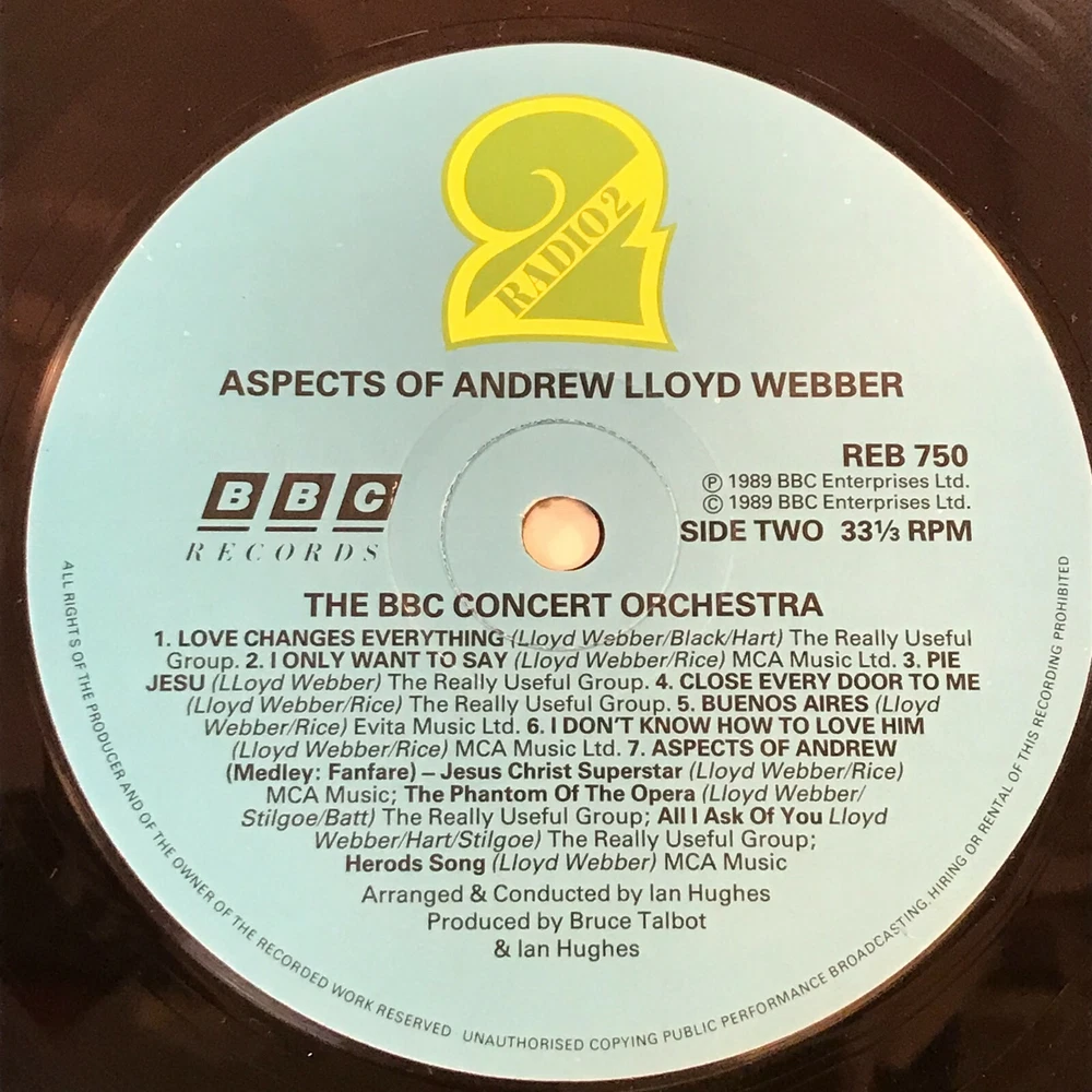THE BBC CONCERT ORCHESTRA conducted by IAN HUGHES Aspects Of Andrew Lloyd Webber - 1989 UK vinyl LP, with sleeve notes from David Jacobs. Complete with BBC records press release. REB750 01. Music Of The Night 02. Memory 03. Variations: Introduction & Theme 04. Don't Cry For Me Argentina 05. Anything But Lonely 06. Tell Me On A Sunday 07. The Jellicle Ball 08. Love Changes Everything 09. I Only Want To Say 10. Pie Jesu 11. Close Every Door To Me 12. Buenos Aires 13. I Don't Know How To Love Him 14. Aspects Of Love Record Condition : Excellent Sleeve : Minor shelfwear (see photo) Please check out our other items !