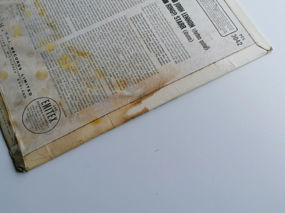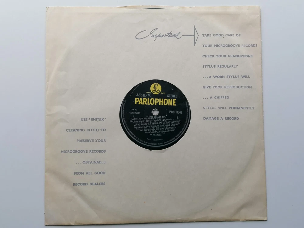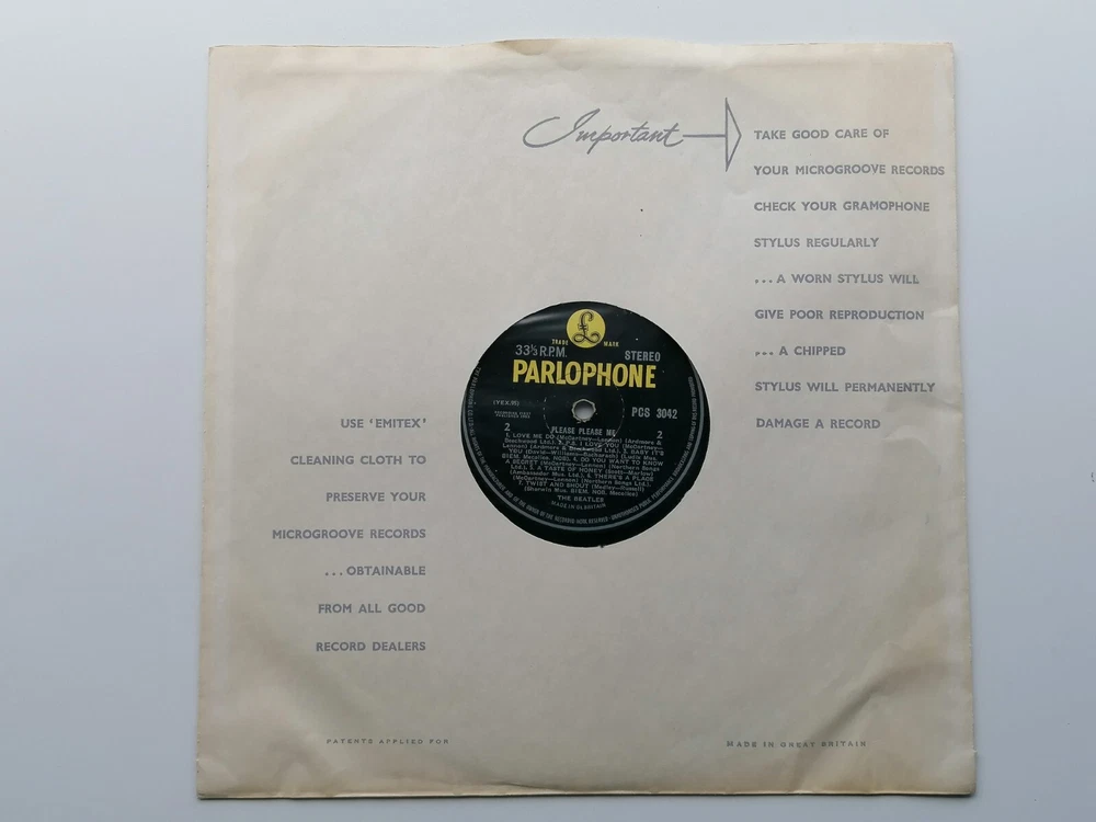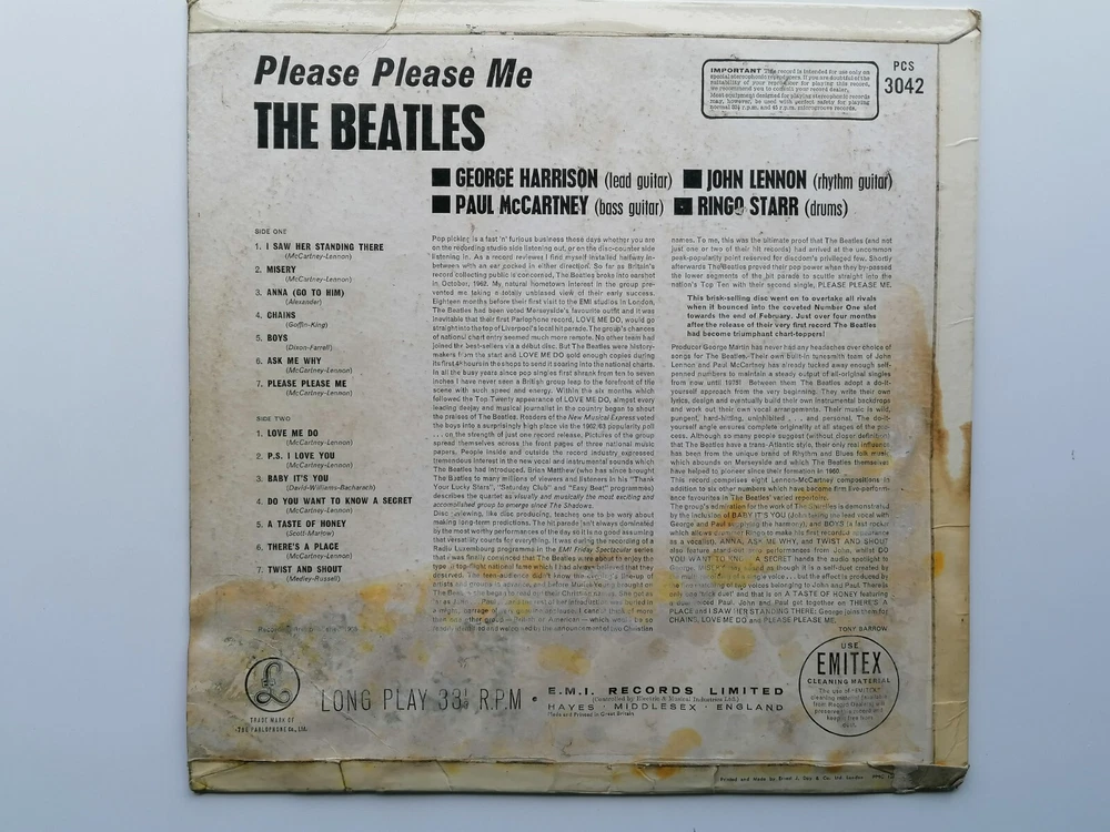paddysgoose Store THE BEATLES ORIG 1963 UK LP PLEASE PLEASE ME STEREO LP ERNEST J DAY SLEEVE PARLOPHONE PCS 3042 PARLOPHONE CO EDGING THE LABELS ARE CLEAN, NO WRITING M K T TAX CODE SIDE 2 THE VINYL IS VERY GOOD , OVERALL BRIGHT THOUGH SHOWING SOME LIGHT PLAYS VERY GOOD PLUS NO STICKS OR JUMPS, PLAYS VERY GOOD PLUS THE SLEEVE IS A ERNEST J DAY ISSUE THE HAS HAD WATER SPLIT ON IT AND THIS HAS CAUSED SOME DAMAGED MAINLY OBVIOUS ON THE BACK SLEEVE THE FRONT OF THE SLEEVE IS VERY GOOD THE TOP AND BOTTOM SEAMS ARE VERY GOOD PLUS , THE SPINE IS VERY CLEAR AND READABLE, THE BACK SLEEVE IS SHOWS WATER STAIN , WHICH HAS EFFECT SIDE AND BOTTOM FLIP OVER SEAMS CLEAN NO WRITING, THE FLIP OVER SEAMS ARE VERY GOOD PLUS , COMES COMPLETE WITH ORIGINAL EMITEX INNER SLEEVE IN VERY GOOD PLUS CONDITION THE MATRIX AND STAMPERS ARE SIDE ONE XEX 421=1 STAMPERS 1 L SIDE TWO XEX 422-1 STAMPERS 1 M