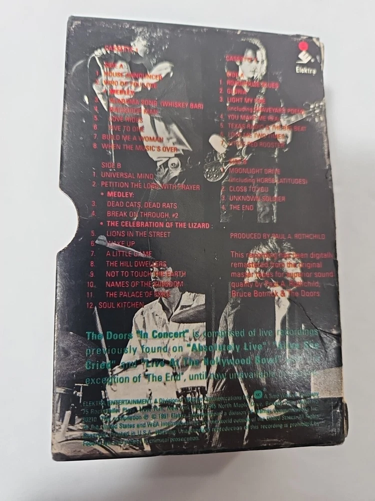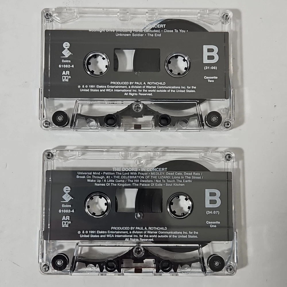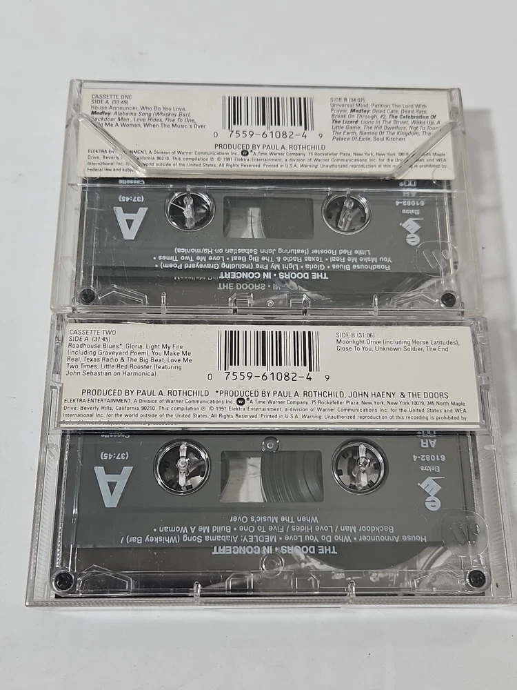 Very Good An item that is used but still in very good condition. No damage to the jewel case or item cover, no scuffs, scratches, cracks, or holes. The cover art and liner notes are included. Observe photos well for details. The Doors In Concert 2-Cassette Set is a must-have for every music lover. This 2-cassette set features the iconic band, The Doors, and their best live performances. You can hear Jim Morrison's raw and powerful voice, the mesmerizing sounds of Ray Manzarek's keyboard, Robby Krieger's guitar solos, and John Densmore's steady beat on the drums. Audio Tested: loud and clean sound. The cassette tapes and jewel cases are in Excellent condition. The cardboard slip cover is Good with some wear from handling and storage, Observe photos well for details. In Concert by The Doors (Cassette, May-1991, 2 Tapes Elektra (Label)) Music > Cassettes Format Cassette Release Year 1991 Genre Rock, Hard Rock, Rock & Pop Run Time 141 min. Style Hard Rock Artist The Doors Release Title In Concert Items are carefully inspected to the best of my ability. I store my items in a pet and smoke free home. I ship quickly and welcome all questions and offers. If you would like to order more than one item, send me an offer so I can do combined shipping & save.