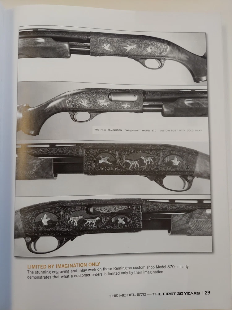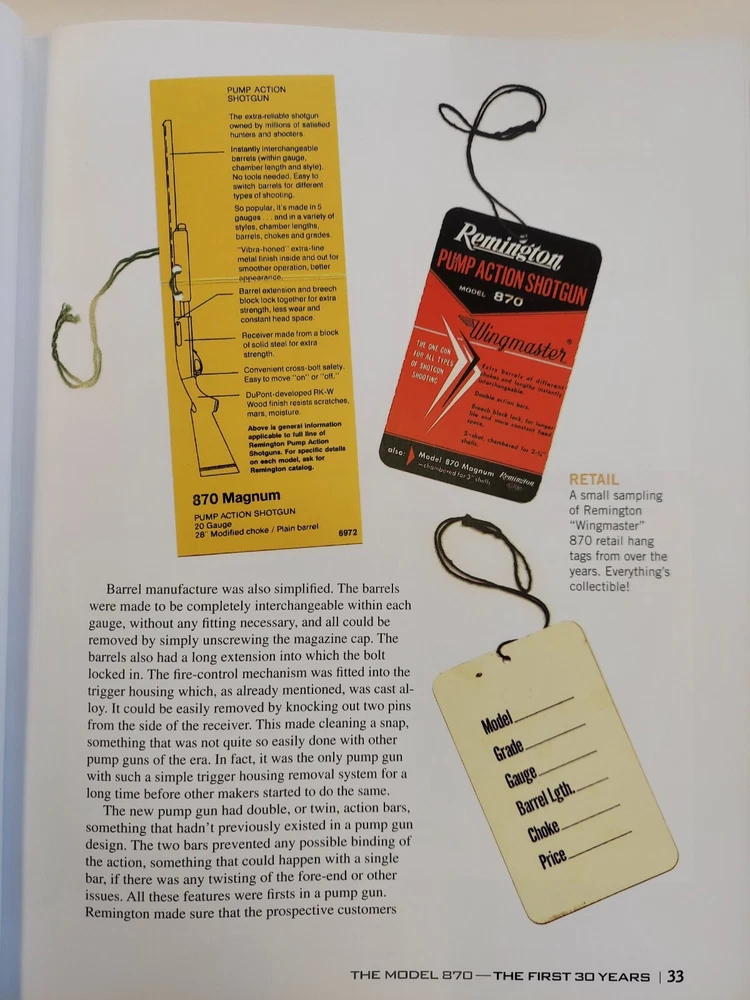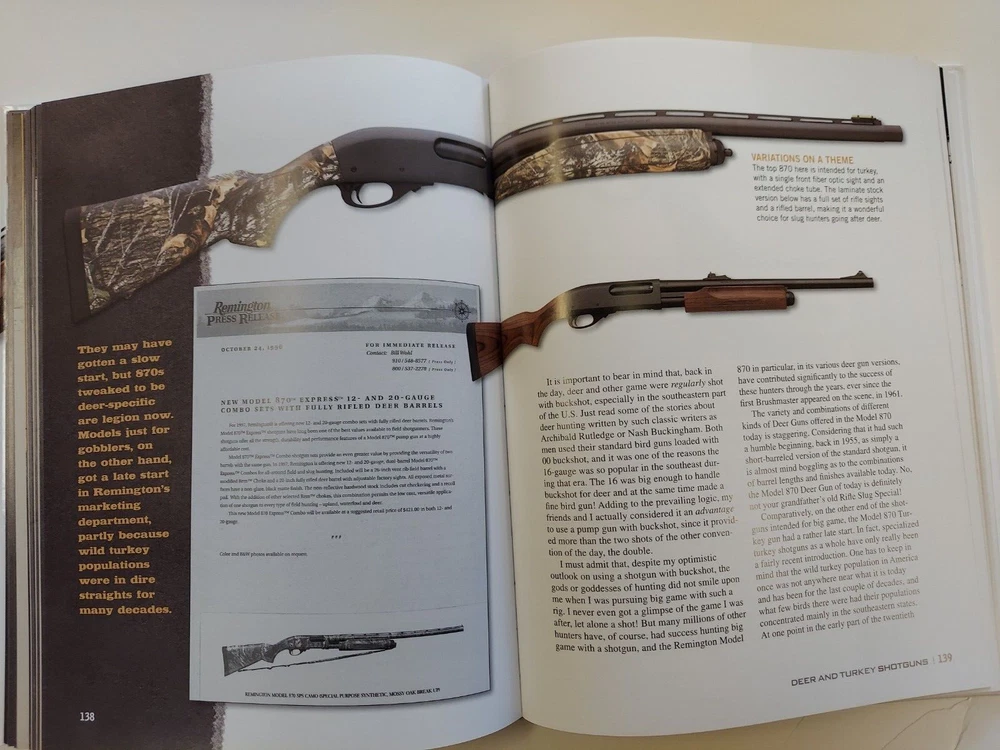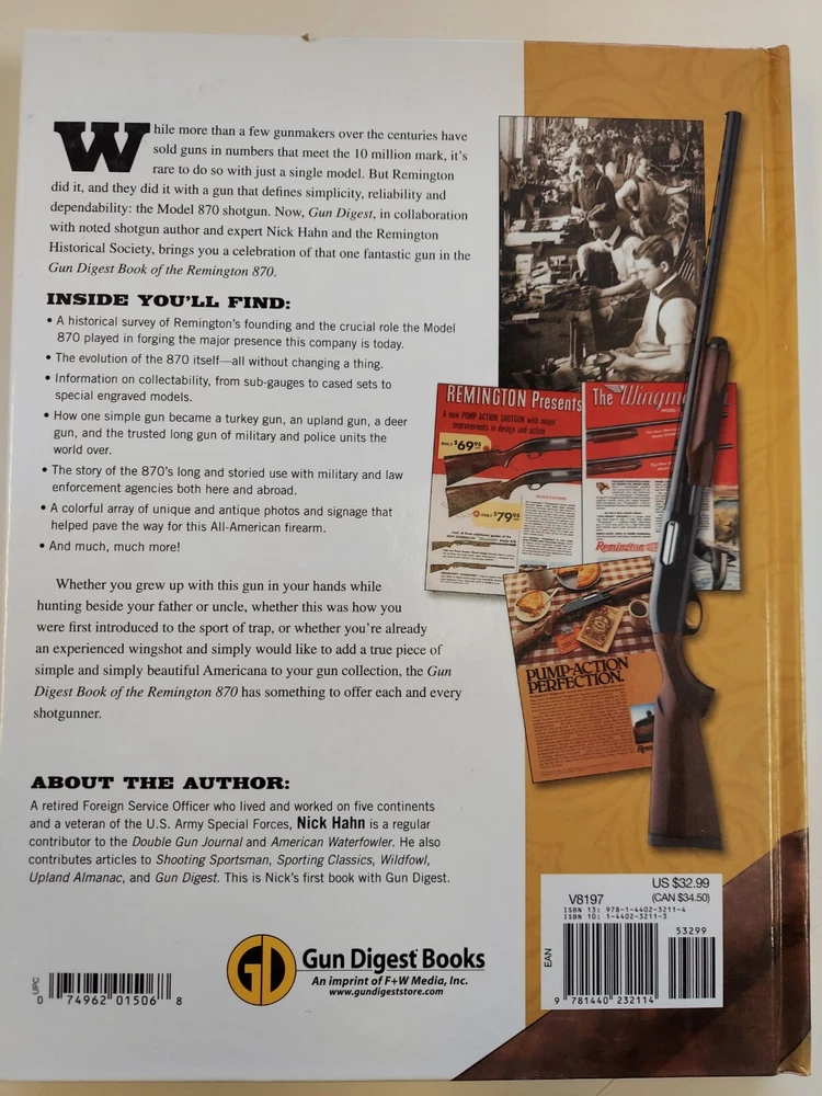The Gun Digest Book of the Remington 870 by Nick Hahn This is an 8 1/2” X 11 1/8”, 256 page glossy hardcover book. It was not issued with a dustjacket. The book was published in 2012 by F+W Media. The book is profusely illustrated. Many of the illustrations are images of old catalog pages and advertisements. Condition : This is a new copy that has been on display. There is a bump to the lower edge of the front cover and the upper edge of the back cover.