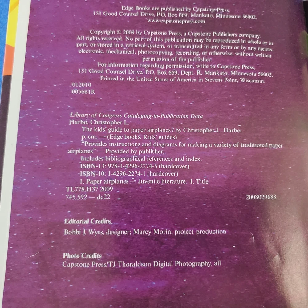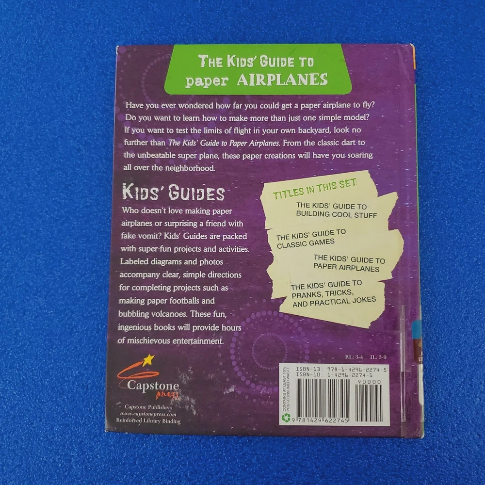 Book Series: Does Not Apply Item Width: 7in Topic: Transportation / Aviation, Art / Techniques, Référence / General, Crafts & Hobbies Publication Year: 2009 Genre: Juvenile Nonfiction Number of Pages: 32 Pages Features: Ex-Library Personalize: No Ex Libris: No Item Height: 0.3in Vintage: No Inscribed: No Author: Christopher L. Harbo Narrative Type: Nonfiction Original Language: English Language: English Country/Region of Manufacture: United States Signed: No Intended Audience: Ages 2-3, Ages 9-12, Ages 4-8, Under 2 Years Type: Activity Book Publisher: Capstone Format: Library Binding Personalized: No Literary Movement: Enlightenment Item Weight: 9oz Item Length: 9in ISBN: 9781429622745 Edition: Does Not Apply gtin13: 9781429622745 Book Title: Kids' Guide to PAPER Airplanes