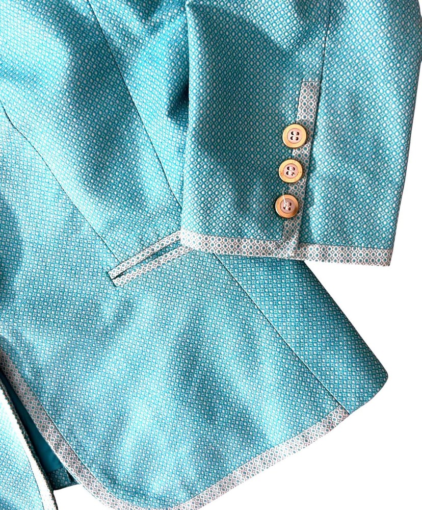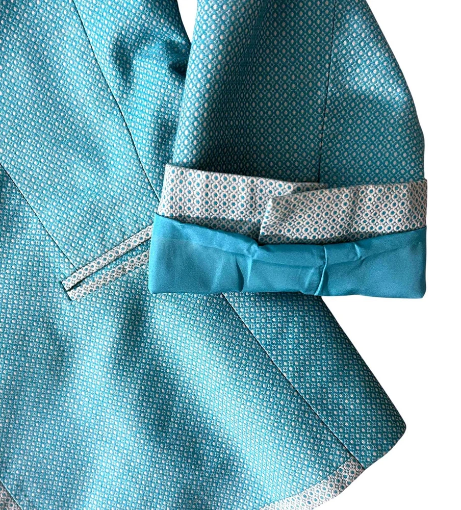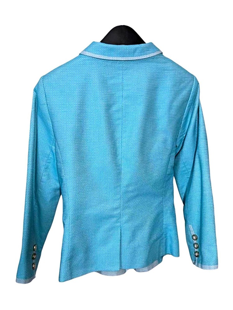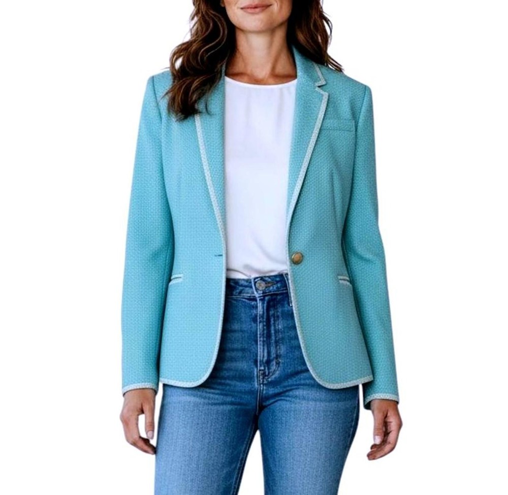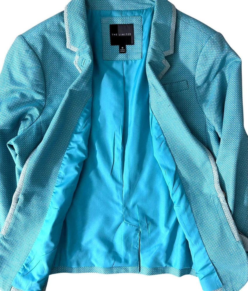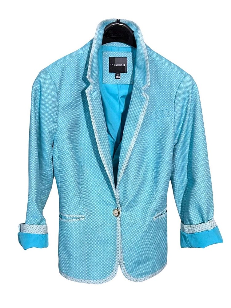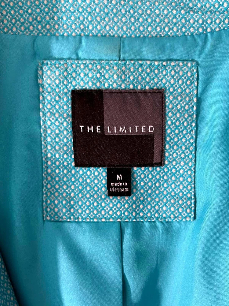 Take your career look to the next level this spring when you lean-in wearing this stunning Lightweight 1-Button Career Blazer from THE LIMITED. This versatile jacket features a fresh Teal Blue Color with subtle White Piping on the lapels and pockets. and a lux 100% Cotton Textured Fabric. Perfect for any season and easily transitions from day to night. Office, Travel, Dinner, Cocktails, Club, etc... Available in a Womens Med. (see measurements below). New Without Tags / Original Retail: $165 --- SAME DAY SHIPPING for Orders Received by 3:30 PM EST --- • Condition: New Without Tags • Size: Womens Medium • Color: Teal Blue • Shell Fabric: 100% Cotton • Lining: Polyester • Measurements (Laying Flat): Chest (Pit to Pit): 19" Sleeve Length (shoulder seam to end of Sleeve): 20" Length (Top of back collar to bottom of hem): 22" 🚭 Smoke and pet free household.
