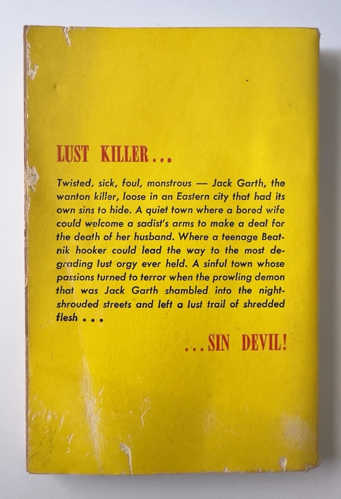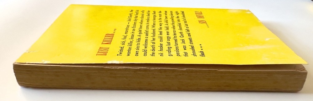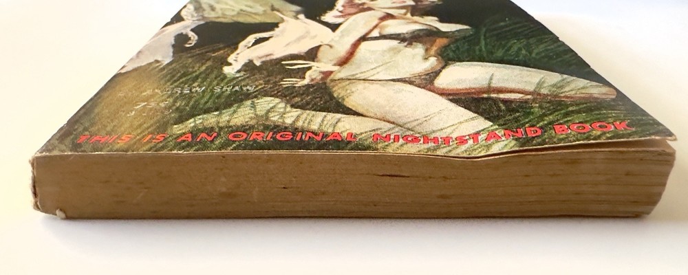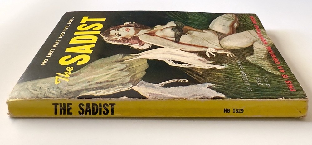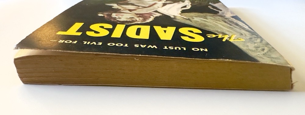 The Sadist is an iconic title of the sleaze paperback era and stands apart for its “all out” effort by both author and artist to create a newsstand shocker. Despite its reputation, copies in great condition are scarce. The good girl bondage cover is notable as famed pulp artist Robert Bonfils’s first cover art for Greenleaf. However, perhaps no artist could match the violent, sex-soaked story spun by author Lawrence Block. The book’s author byline is Andrew Shaw, a pseudonym for Lawrence Block, the best selling author of more than 100 crime and mystery novels. The 188-page pulp fiction novel centers on a psychopathic hit man hired to murder a family. During his journey, he finds cheap booze, prostitutes, ne'er-do-wells, and lots of sex. Block’s story is so lurid, author S. Craig Zahler’s 2019 review published on his website, calls The Sadist “the most depraved and amoral books I've read … While some sleaze paperbacks from this era did little more than provide colorful breast metaphors and vaguely described ‘aberrant’ sexual behavior, this book genuinely feels like it might have been illegal to own. An ugly and crisp piece of hate, The Sadist delivers far, far, far more nastiness than the lurid cover suggests.” BACK COVER TEXT: LUST KILLER … Twisted, sick, foul, monstrous - Jack Garth, the wanton killer, loose in an Eastern city that had its own sins to hide. A quiet town where a bored wife could welcome a sadist's arms to make a deal for the death of her husband. Where a teenage Beatnik hooker could lead the way to the most degrading lust orgy ever held. A sinful town whose passions turned to terror when the prowling demon that was Jack Garth shambled into the night-shrouded streets and left a lust trail of shredded flesh … … SIN DEVIL! The cover retains bright colors for an excellent presentation. Although a bit rolled, this copy has a tight spine. All pages are intact, but could come loose if the book is opened too wide. Foxing is limited to the fore edges, but there is naturally some tanning to the pages. The back cover shows some insect damage to its edges.