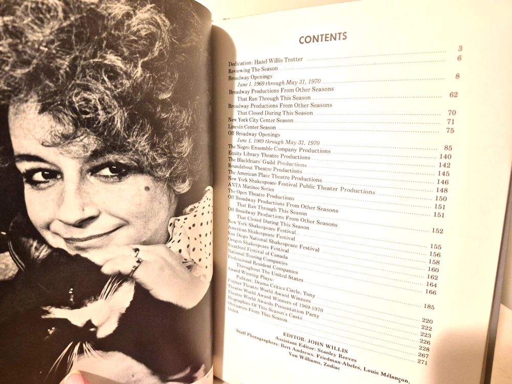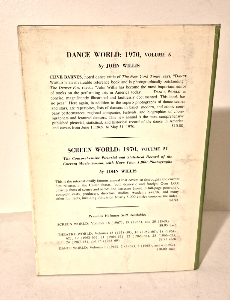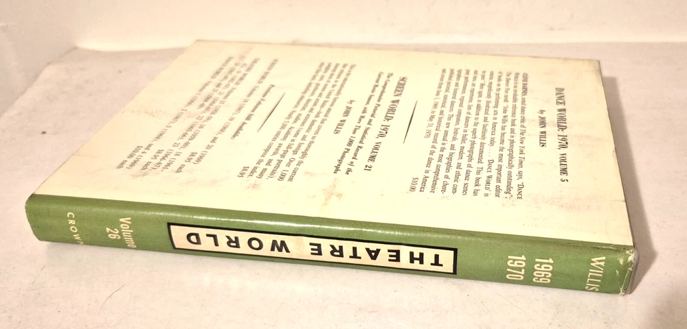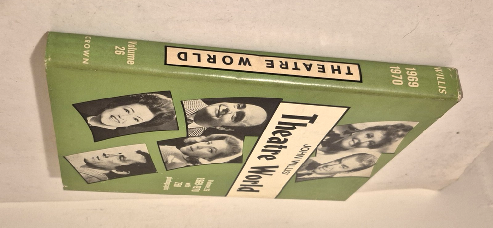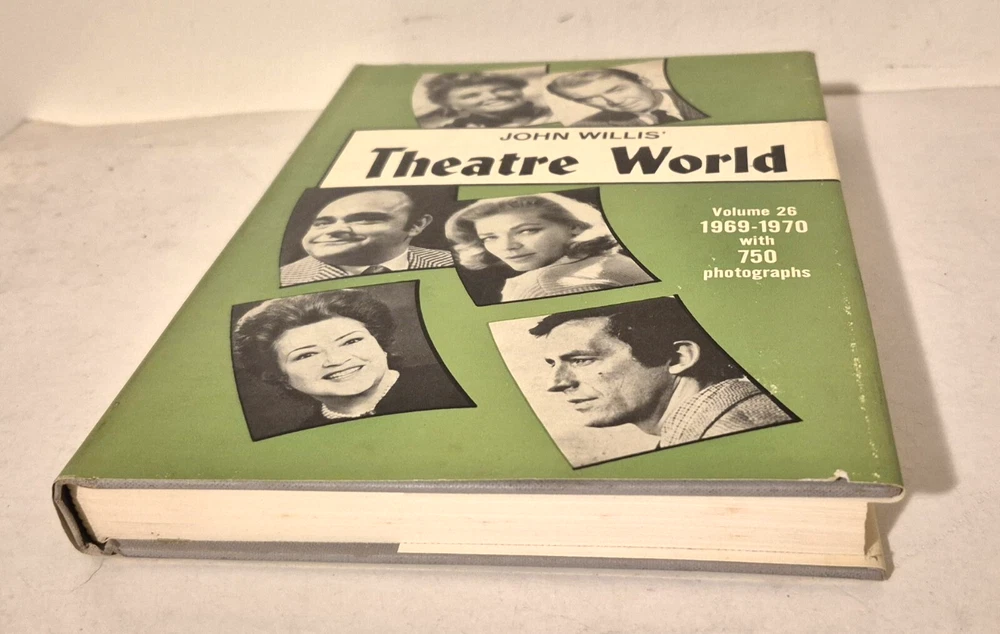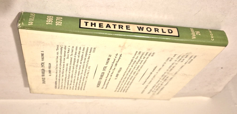 THEATRE WORLD Volume 26, 1969-70 John Willis THEATRE WORLD, by John Willis...... Volume 26, 1969-70 ...... Published by Crown....... Illustrated with numerous photographs.... ... DESCRIPTION - Hardback, with DJ. .. . CONDITION - The ol' fella is in good condition......The pages are good, with the edges darkened.....And the pages have a fairly light scent, not sure what, but not offensive to me....The cover is solid, with some wear and use, and with a slight bend to the cover.......The DJ is solid, with some wear and tear, mostly on the outer portions. .......This is a good, solid used book.......I think you will be pleased with it . ....... ... SHIPPIN' AND PAYMENT - 'Course the thrilled buyer is gonna hafta pay $4.95 for shippin' and handlin'.... ....Multiple purchases save on shippin'... ...Now while you're here, why don't you give my other auctions a look-see...Why, I 'spect I got a wagon load of mighty good books over yonder in my Book Barn... Thanks a heap....!! - - - ol' arkee