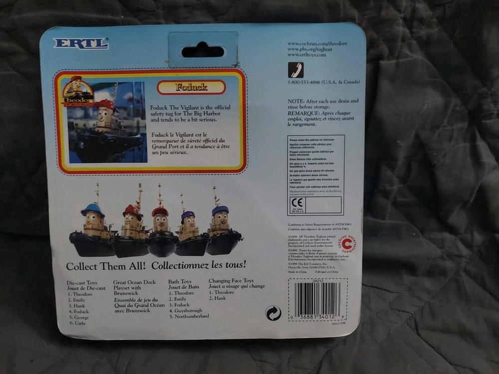 You are BUYING a THEODORE TUGBOAT " FODUCK" BATH TOY made by ERTL. It is made in 1989 and it is mint in package PLEASE LOOK AT MY OTHER AUCTIONS AND MORE + THEODORE TUGBOAT AND MY EBAY STORE , ZOEY'S PLACE ! On Nov-24-02 at 10:34:02 PST, seller added the following information: Pay me securely with any major credit card through PayPal!