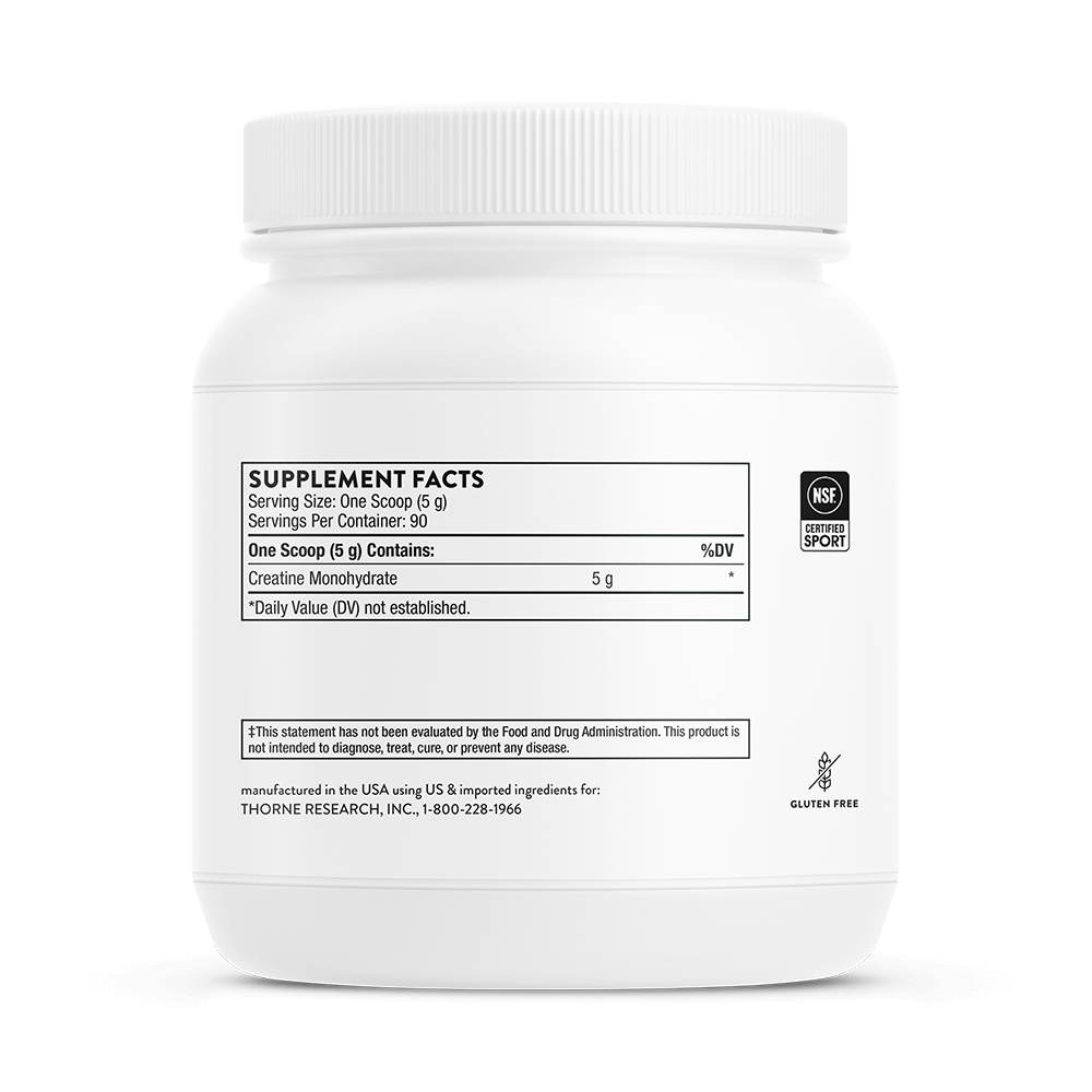 Product Benefits:Muscle Mass, Endurance, Cellular Energy, and Brain Function*Type:CreatineUnit Count:16.0 OunceFeatures:Gluten-FreeDiet Type:Gluten FreeFlavor:UnflavoredBrand:ThorneAge Range (Description):AdultPrimary Supplement Type:Creatine MonohydrateActive Ingredients:Creatine MonohydrateIngredients:Creatine MonohydrateFormulation:PowderItem Form:PowderVolume:16 fl ozItem Weight:16 ozItem dimensions L x W x H:8.06 x 4.74 x 5 inchesType of Diet:Gluten Free