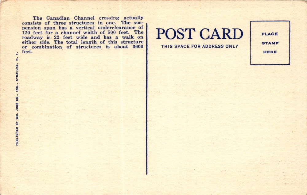 MAKE AN OFFER. THE MORE YOU BUY THE BETTER DEAL I WILL ACCEPT The postcard features an image of the Thousand Islands International Bridge crossing the St. Lawrence River, specifically the Canadian Channel in the Thousand Islands region. The bridge is a combination of three structures, including a suspension span with a vertical underclearance of 120 feet and a channel width of 500 feet.