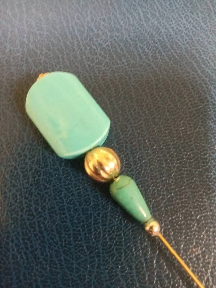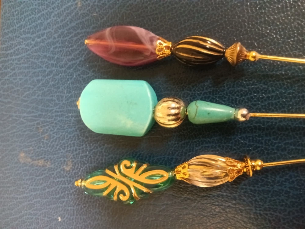 Three Very Fancy Art Deco styled Hat Pins. In the Victorian/Edwardian styled Hat Pins. Each pin is a long 8". Gold toned metal trim. Safety end caps included. Hat Pins by Joanne. Thanks for looking and check back often.