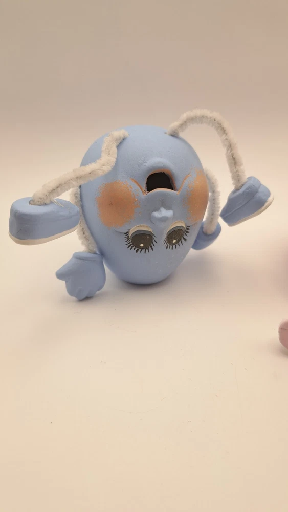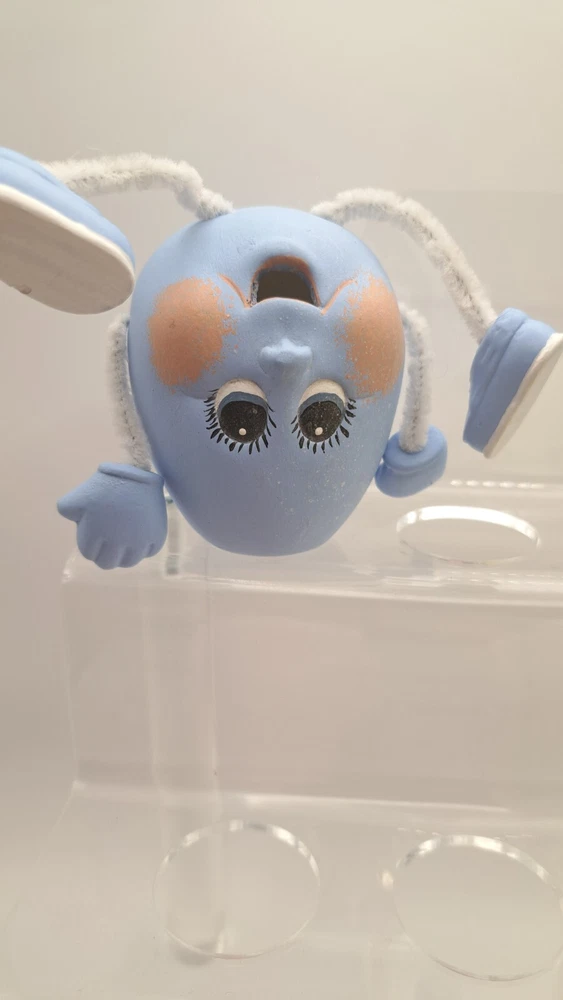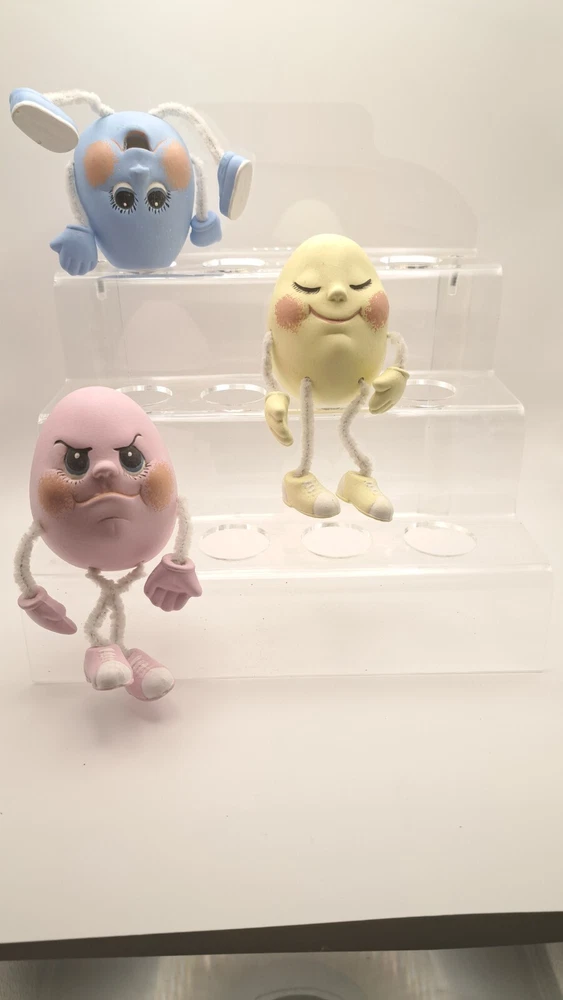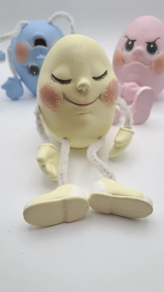 Add a touch of vintage charm to your Easter decor with these THREE ceramic noggin figurines. Each egg-shaped figurine features a unique anthropomorphic design, perfect for shelf sitting or adding whimsy to your holiday table. Pipe cleaner legs, to pose them as you like. Fun, whimsical , poseable decor, that will put a smile on your face.