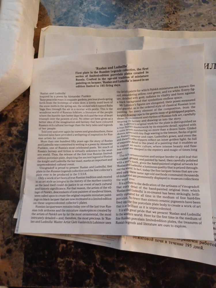 The product is a Tianex Russian decorative plate from 1988 featuring a fairy tale painting. The plate has a diameter of 8 inches and is adorned with vivid colors, making it a visually striking piece. Its decorative style and Russian cultural influence add to its aesthetic appeal, making it a desirable collector's item. Perfect for display, this collector plate would be a charming addition to any collection or a unique decor piece for those who appreciate Russian artistry.