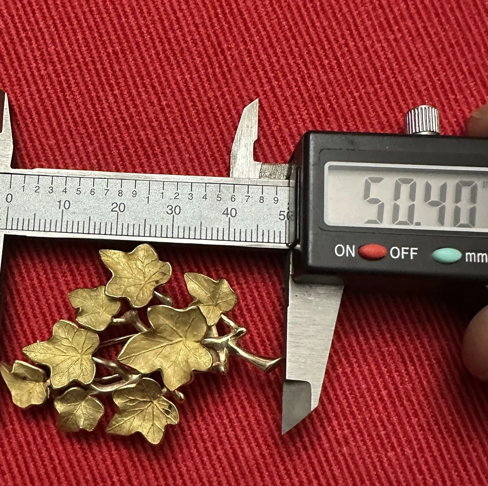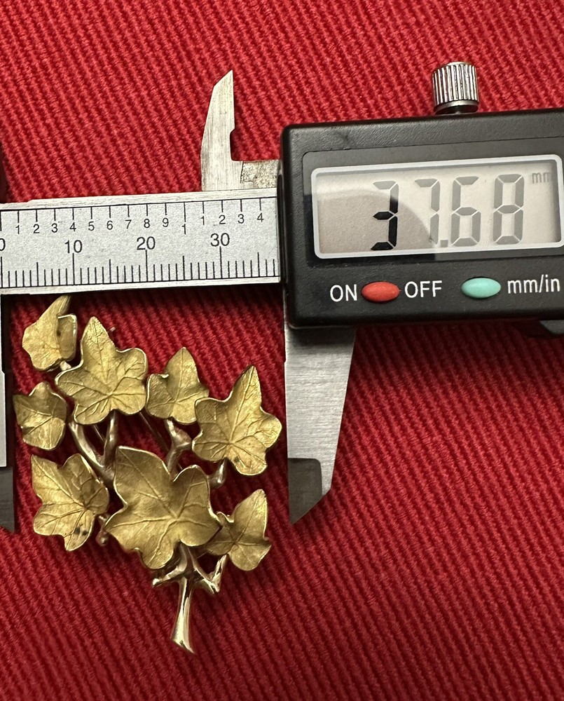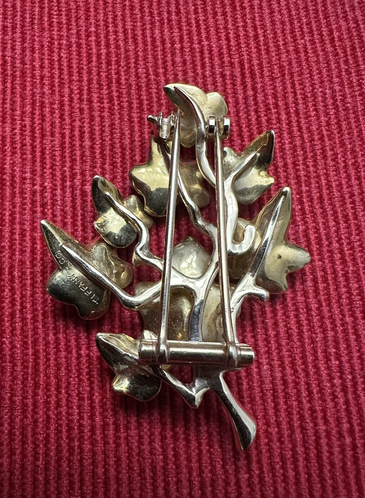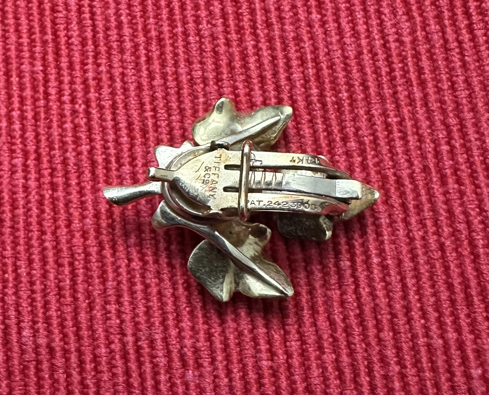 Tiffany & Co. 14k yellow gold beautiful vintage ivy cluster motif brooch and earrings set, with box. This gorgeous set contains a graceful grouping of brushed ivy leaves, with high polished stems and branches. The brooch is finished with a fur clip double prong, the earrings finished with clip on style backs. Marks: Tiffany & Co., 14KT/ PAT.2423905 Weight : 24.7 Gram Condition: Good overall estate condition, prong on fur clip slightly bent. Please enlarge all pictures for more details. If you have any questions, please do not hesitate to contact the seller.
