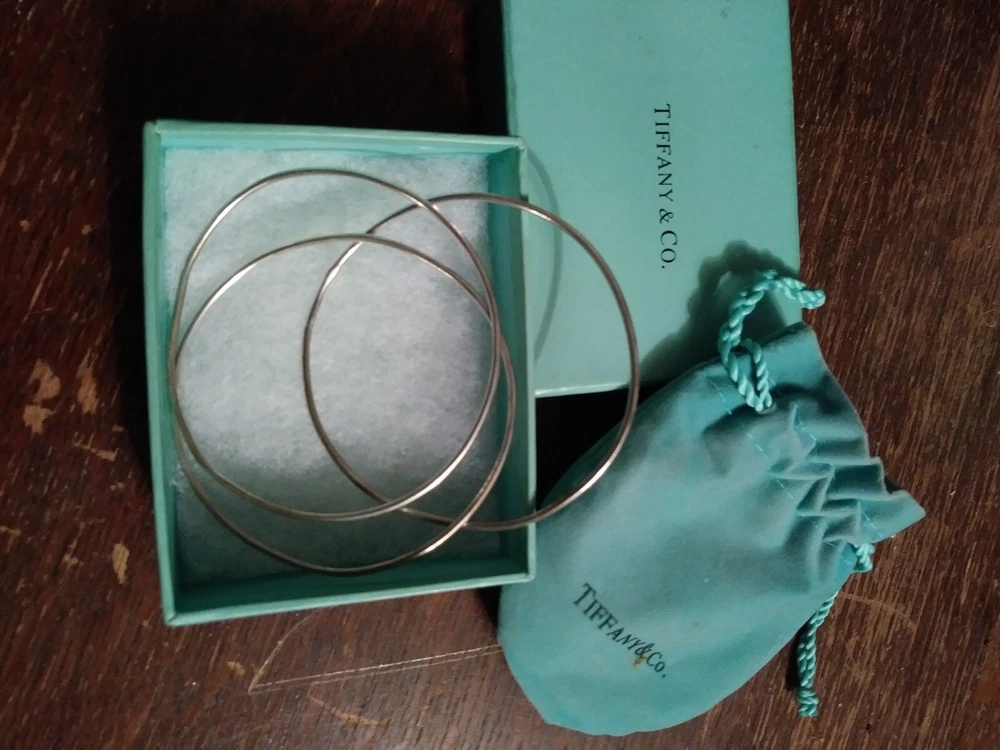 ***** 3 X SILVER BANGLES ***** TIFFANY & CO Description: These 3 bangles come with bag and box. Believed to be sterling silver but they are very thin so I can't see a hall mark if there is one. Don't remember wearing them as they don't fit my hands now but are slightly misshaped this doesn't effect the wearability. Diameter 7cm/2 3/4in. from a non-smoking house ****** I will post worldwide but please check the postage prior to bidding. I am happy to combine/reduce postage if more than 1 item is purchased, please wait for the invoice before sending payment. I will not accept returns for items that do not fit, change of mind or not the right colour. If you are not happy for other reasons please contact me before leaving feedback so that we can discuss and come to a mutual arrangement. Item will not be sent until funds have cleared. I then try to post the day after receiving cleared payment. Proof of postage is always obtained at the time of postage. I will not be responsible for items lost in the post but will help in any way I can. Please check out my other items thewiggies