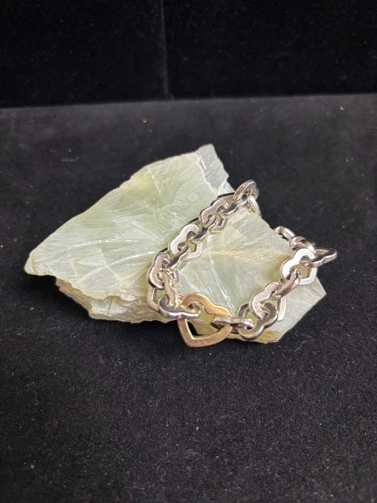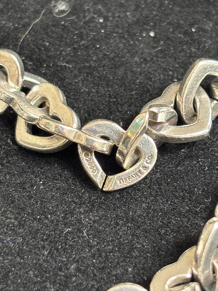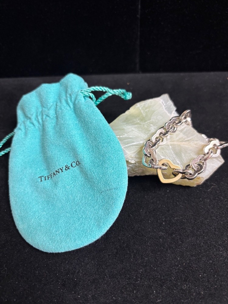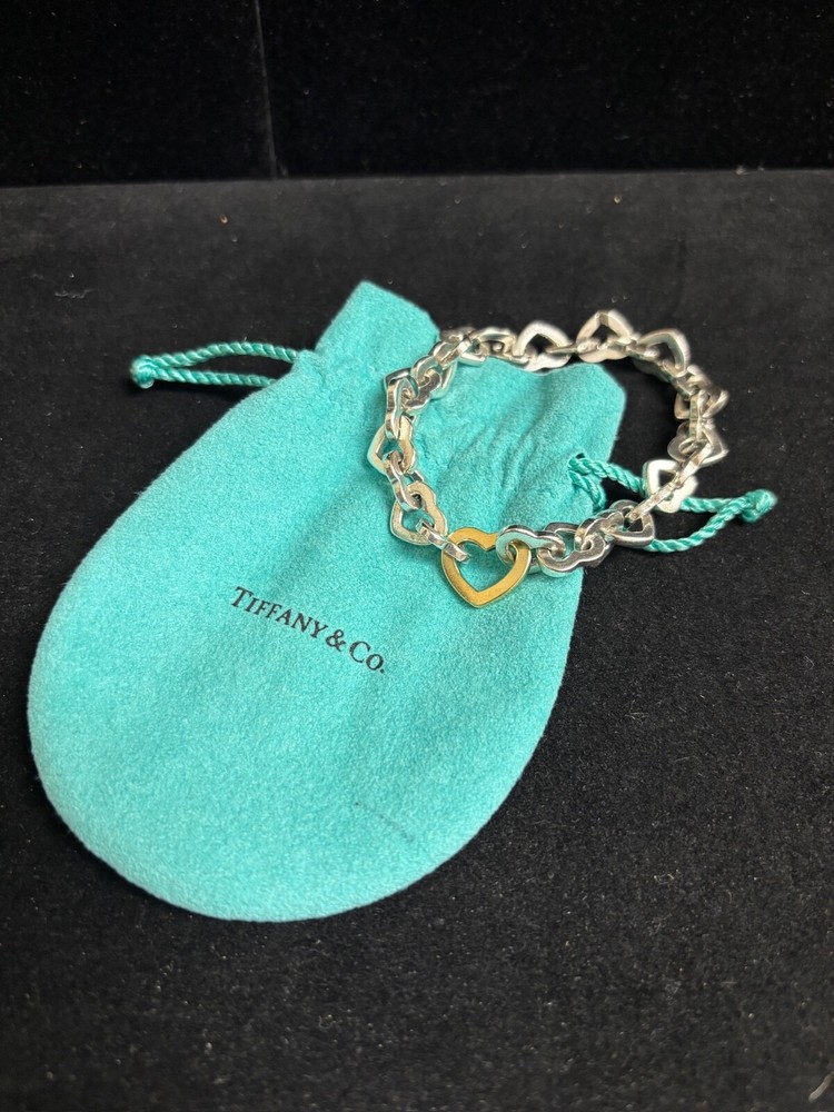 TIFFANY AND CO. 18K YELLOW GOLD AND 925 STERLING SILVER HEART LINKS BANGLE BRACELET APPROXIMATELY 7.5” END TO END. IN VERY GOOD CONDITION, WITH SOME MINOR SIGNS OF WEAR ON THE STERLING HEARTS. VERY SHINY AND LUMINOUS, THOUGH. PLEASE REFER TO THE INCLUDED PHOTOS TO HELP INFLUENCE YOUR DECISION. I MAY STILL HAVE THE CHOKER LISTED THAT MATCHES THIS BRACELET.